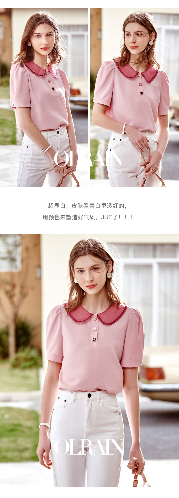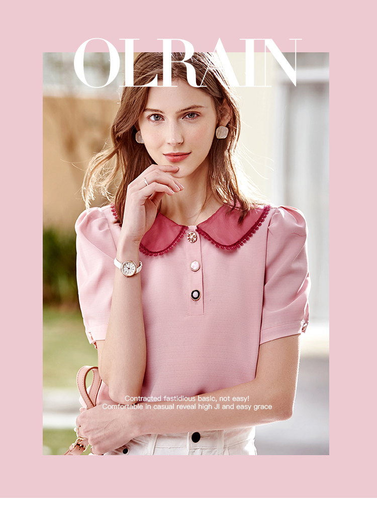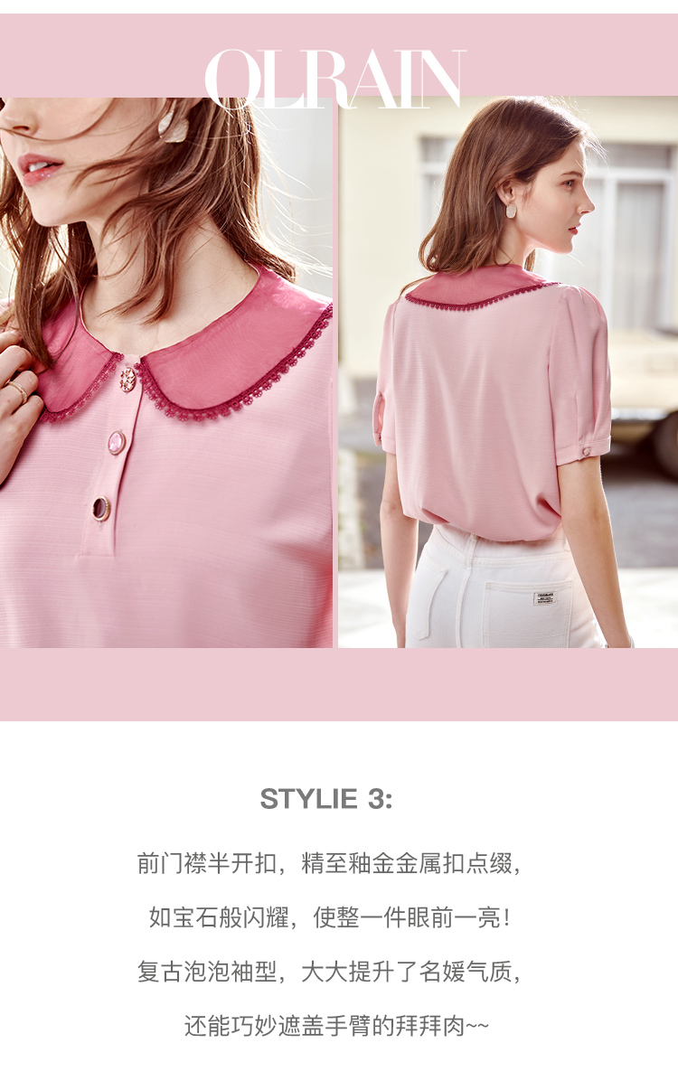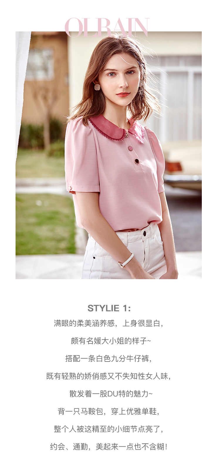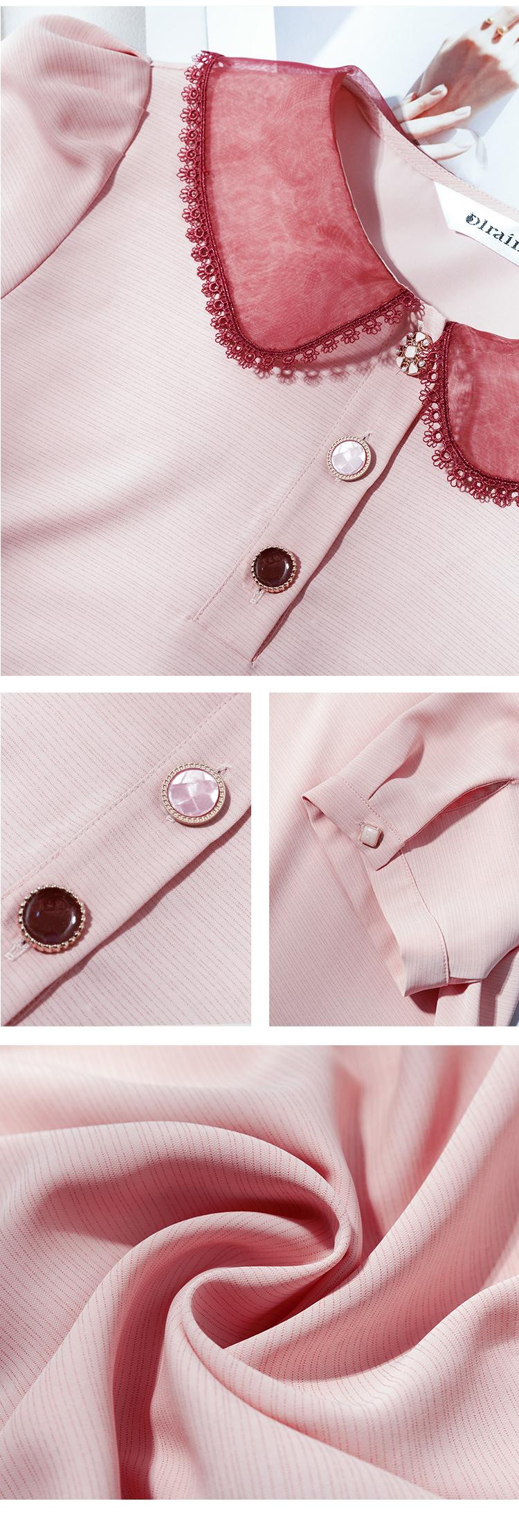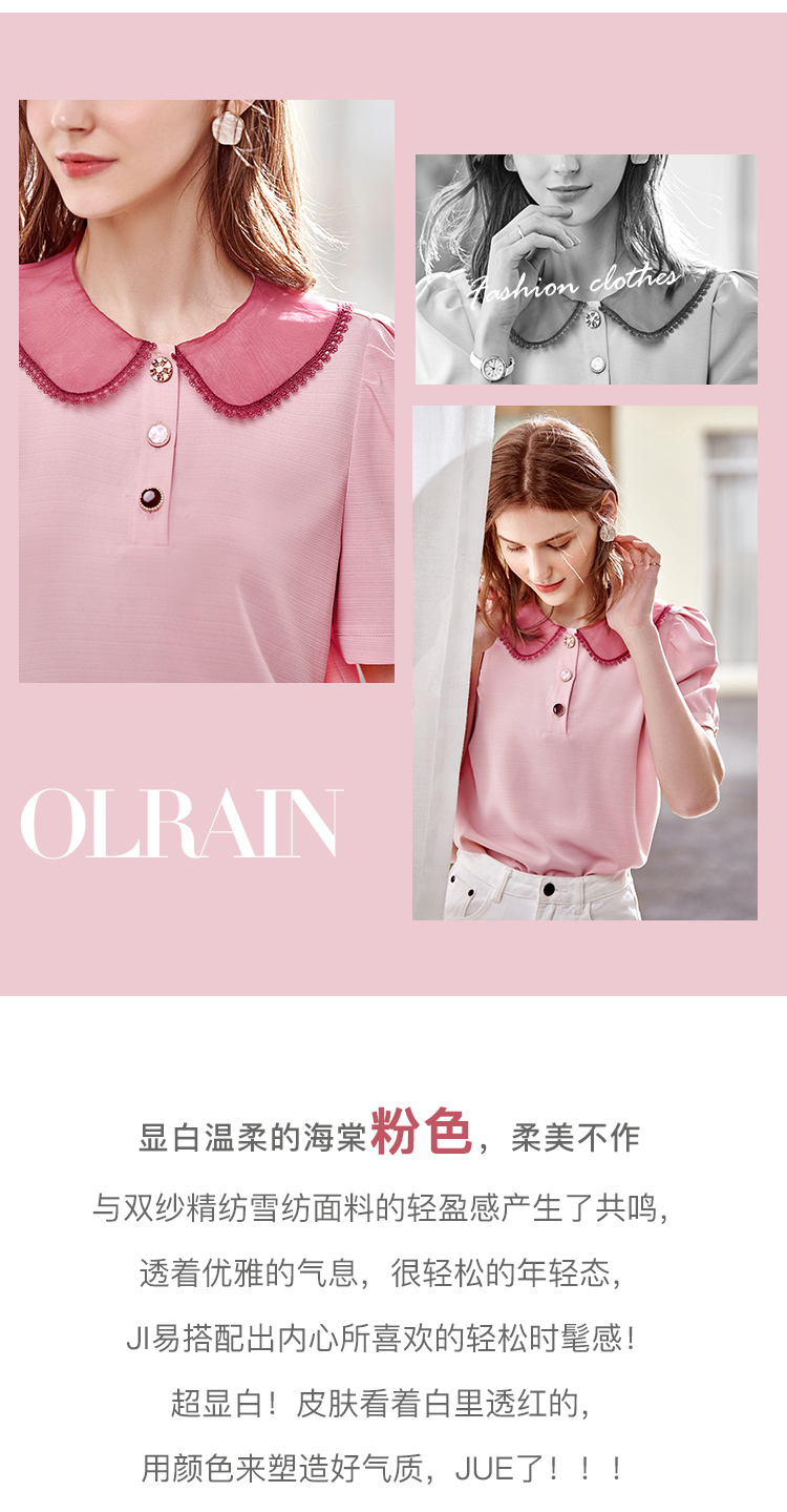 欧芮儿粉色雪纺衫女2021领百搭宽松洋气设计感小众上衣