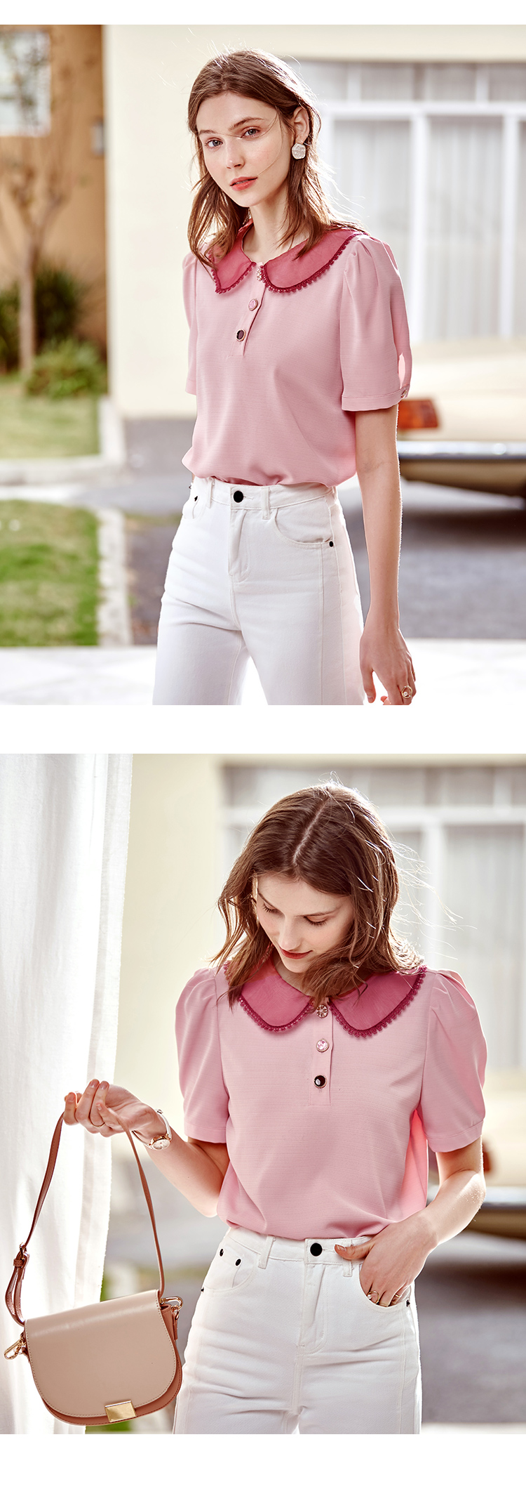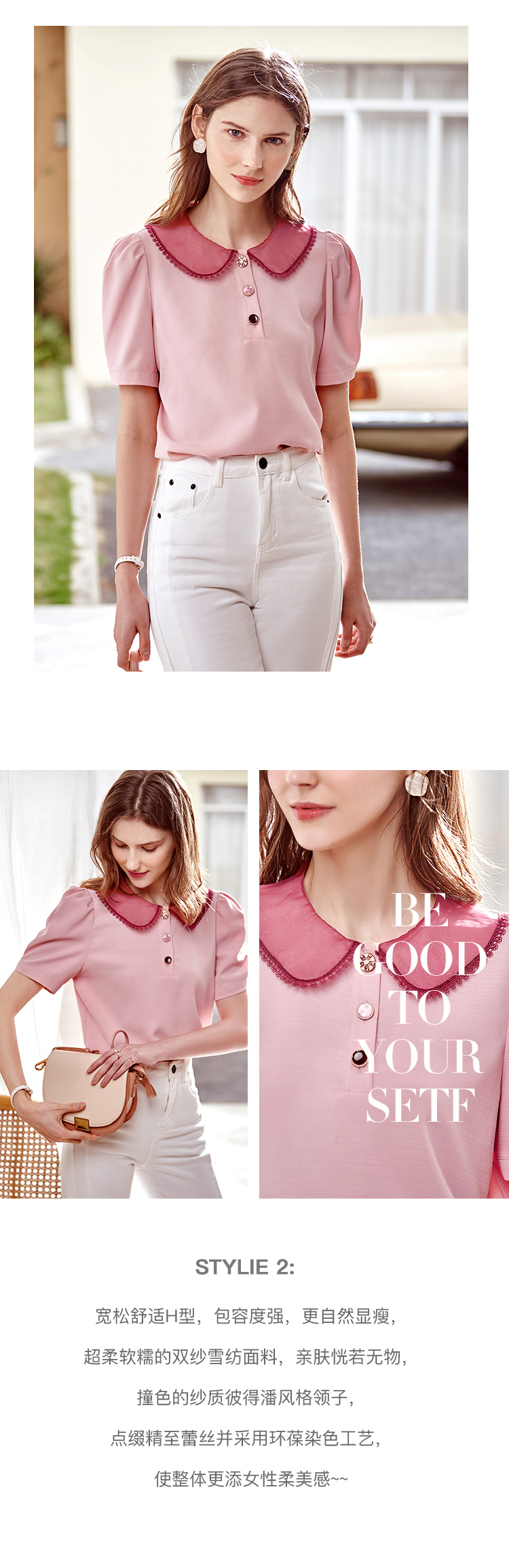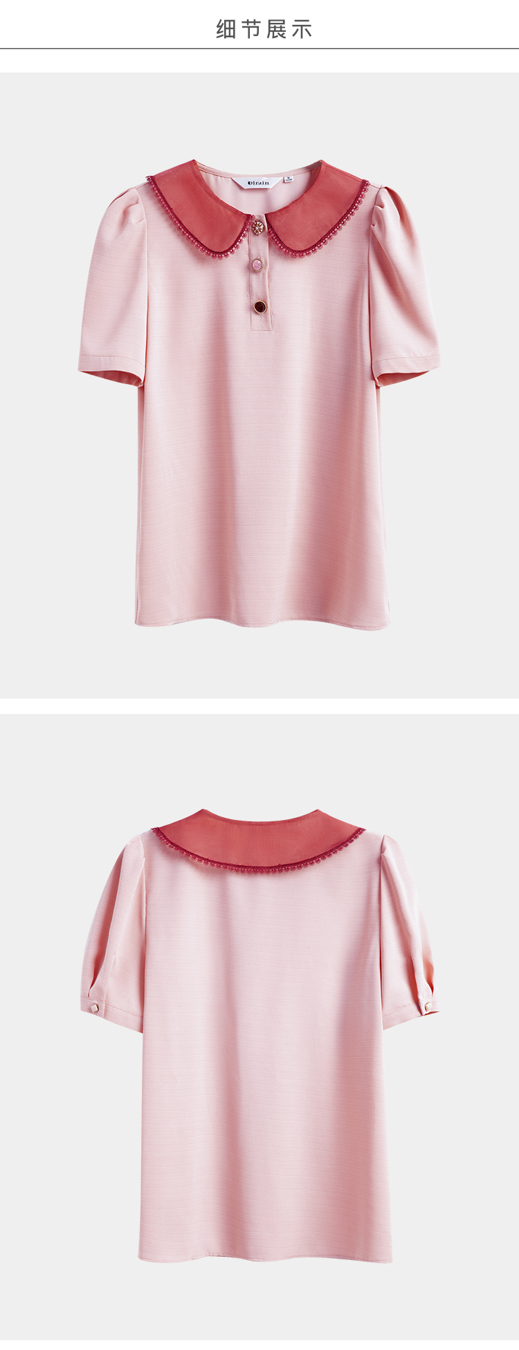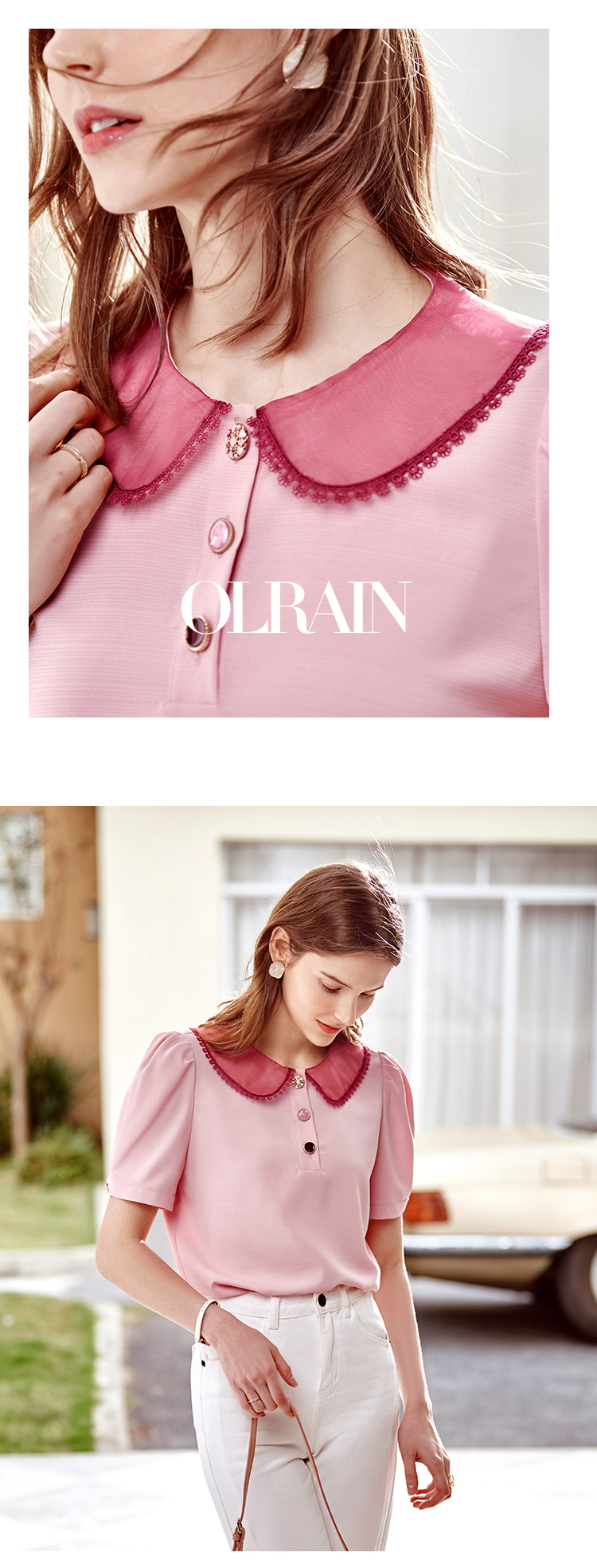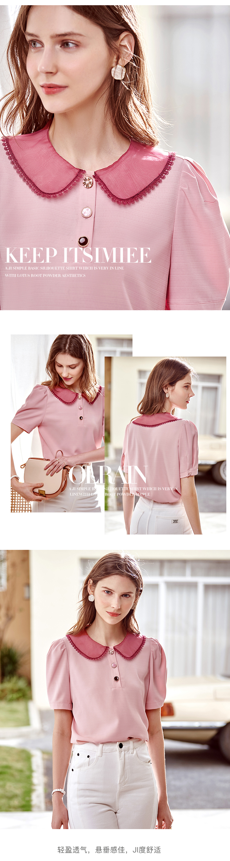 欧芮儿粉色雪纺衫女2021领百搭宽松洋气设计感小众上衣