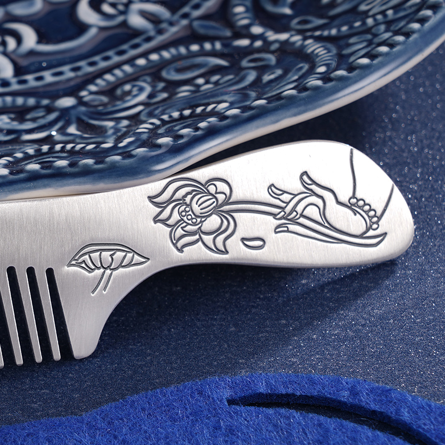 【寓意】:银梳之上錾刻佛手莲花,寓意佛法指引,寄寓开悟自在。银梳承载福寿安康之愿,齿梳流转间暗藏禅机,祈愿一梳百顺,福泽绵长。