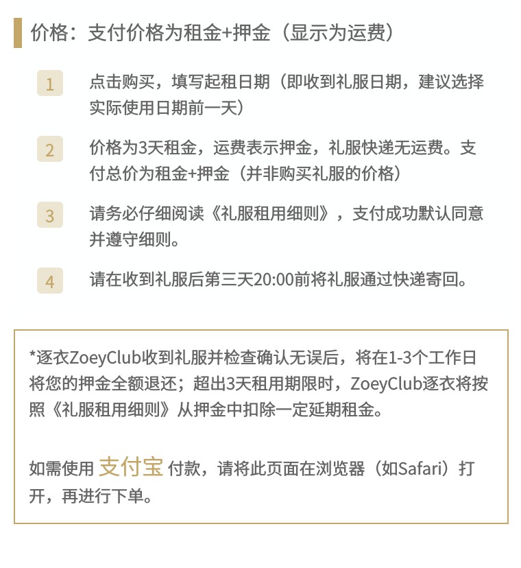 运费 价格实际是 押金 价格,礼服顺丰包邮。礼服归还并质检合格后,押金全额退还。悦己会籍免押金。