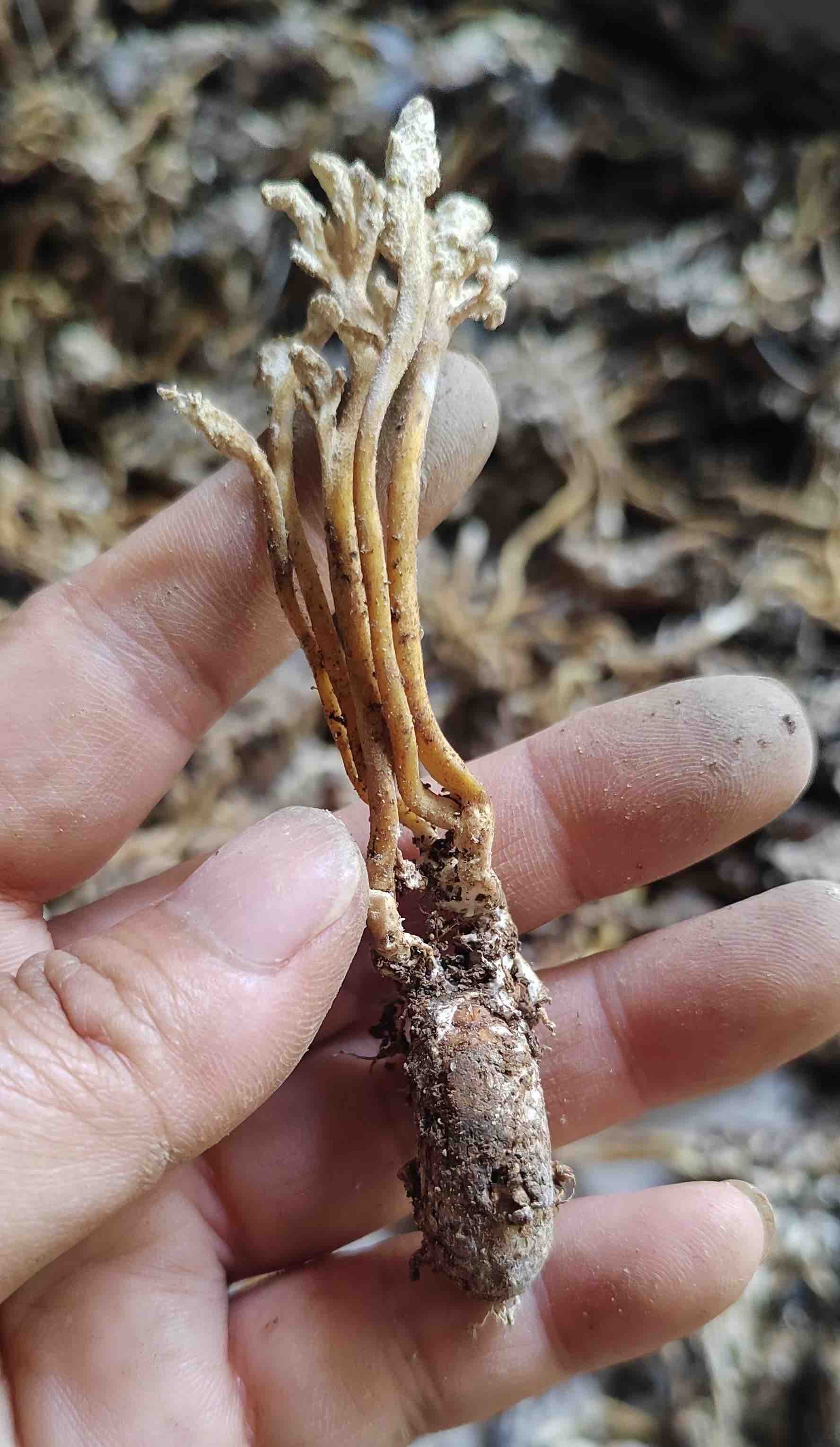金蝉花是我国传统名贵中药蝉花,属虫生性药用真菌,是蝉拟青霉菌寄生在某种同翅目蝉科昆虫蝉若虫上所形成的虫菌复合体。它的根是蝉蛹或山蝉的幼虫体,花是从单个或是2-3个蝉幼虫头部生长出来的,约一寸多长,从顶端开花分枝。子囊座单个或2-3个成束地从寄主体前端生出。(由于广告法功效请百度)