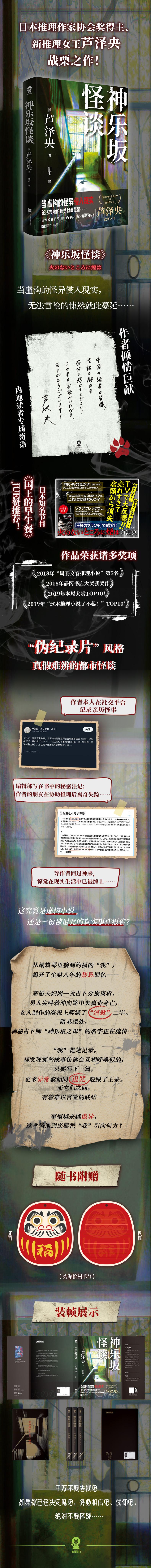 "从编辑那里接到约稿的“我”,揭开了尘封八年的禁忌回忆—— 即将结婚的夫妇因一次占卜分崩离析,男人尖叫着冲向路中央离奇身亡,女人制作的海报上爬满了“道歉”二字。暗巷深处,神秘占卜师“神乐坂之母”的名字正在流传…… “我”提笔记录,却发现那些故事仿佛会互相呼唤似的,只要写下一篇,更多异常就如同诅咒般跟了上来。 而它们之间,有着难以言喻的联结…… 事情越来越诡异,这些怪谈到底要把“我”引向何方? 若你已猜到,请立即合上书本! 千万不要去找它! 如果你已经决定见它,务必相信它、仗仰它,绝对不要怀疑……"