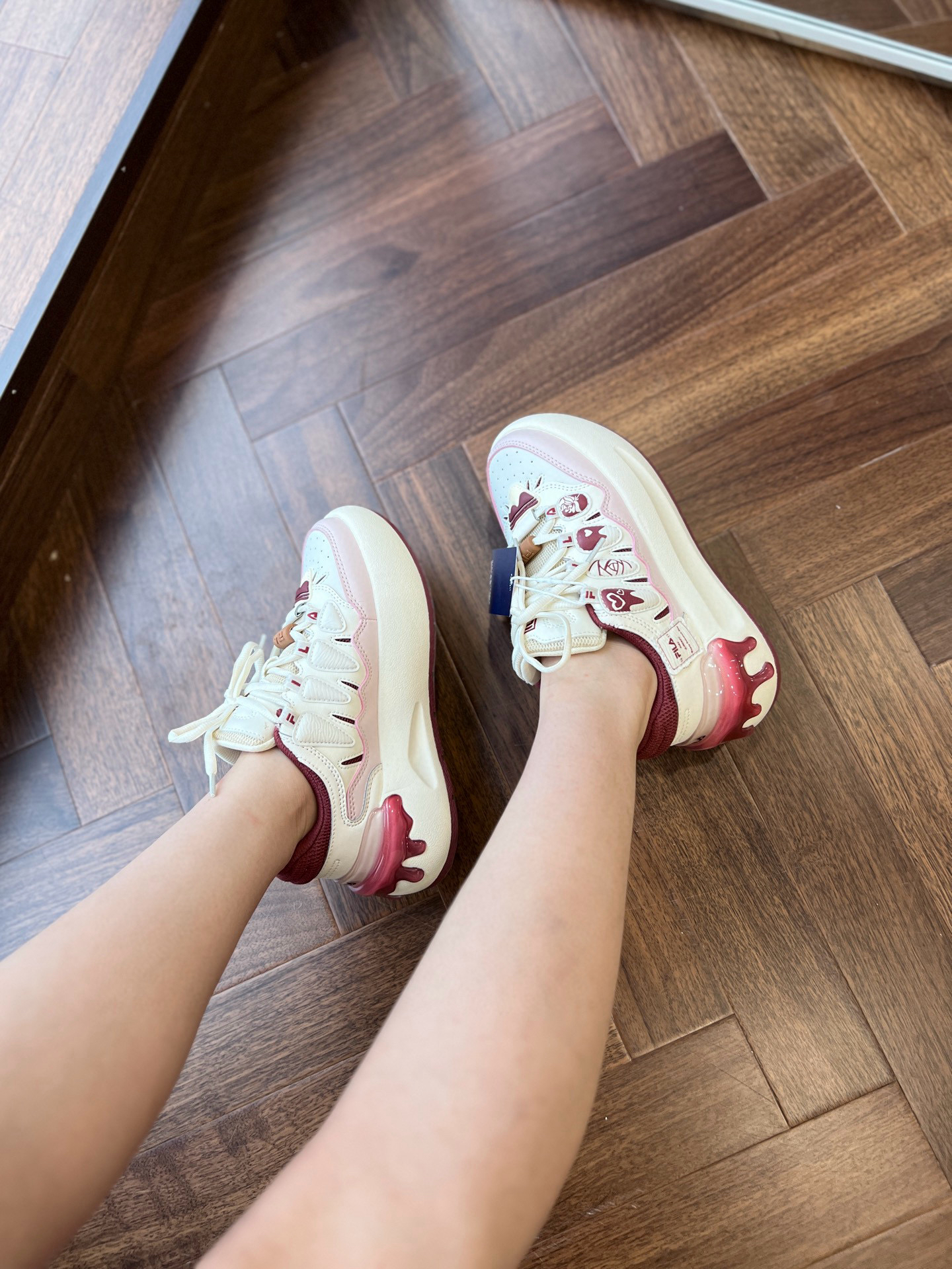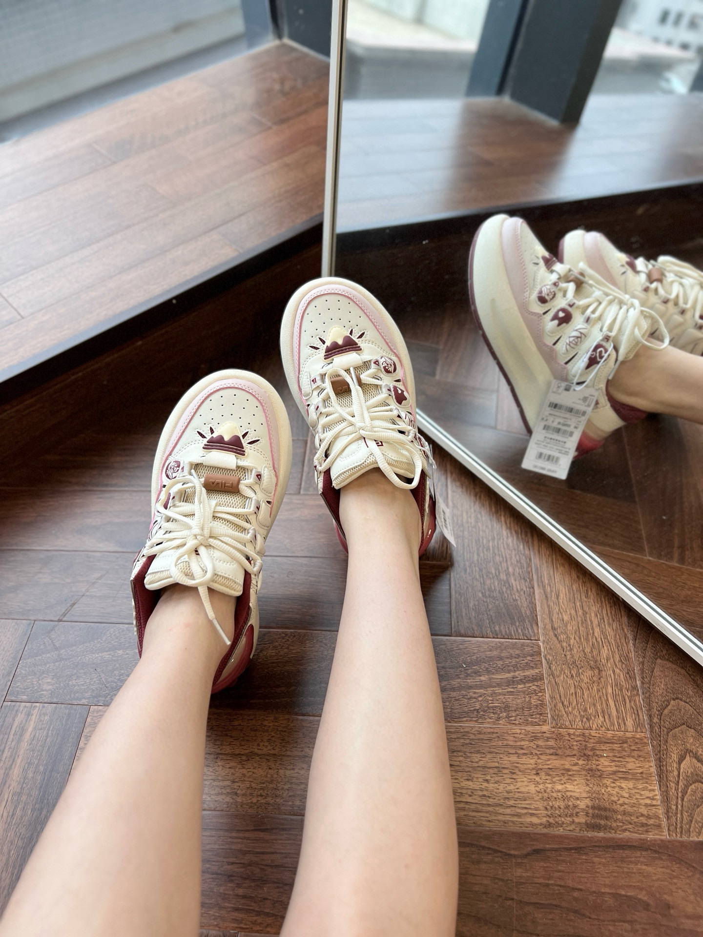 它采用环保皮革鞋面,透气耐磨;防滑耐磨大底,能适应多种路面;立体足弓支撑,久穿不易累。鞋底厚约5cm,上脚有踩屎感,穿着舒适,还显腿长 。其风格既日常又带有情人节氛围,适合日常穿搭与轻运动,也有情侣款可以