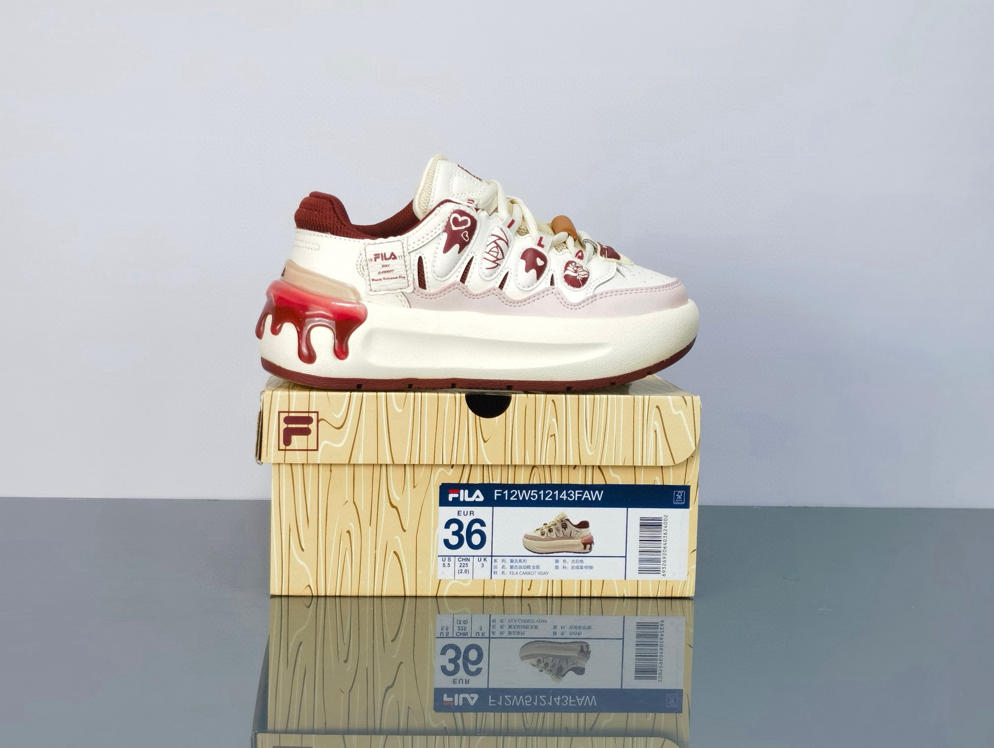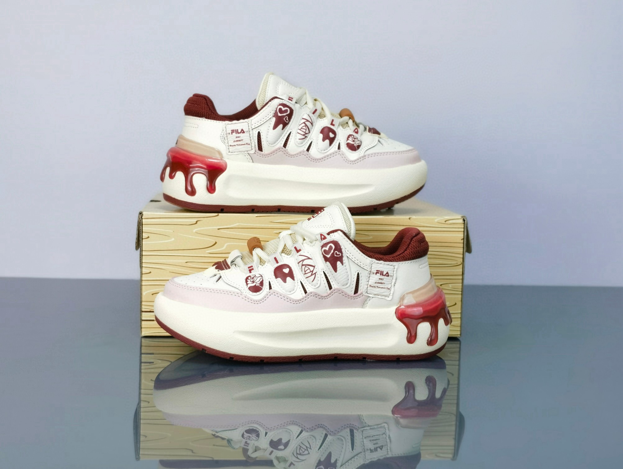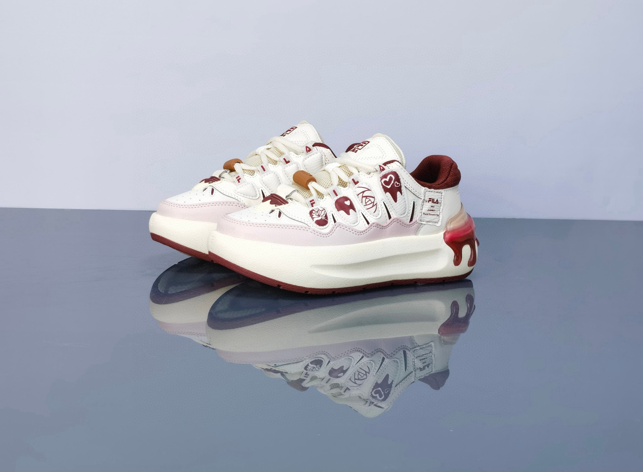 鞋身以安克拉红等颜色为主,侧面点缀多种元素眼片,还有红酒瓶软木塞装饰,以及特有的FILA情人节酒标元素 ,细节丰富。