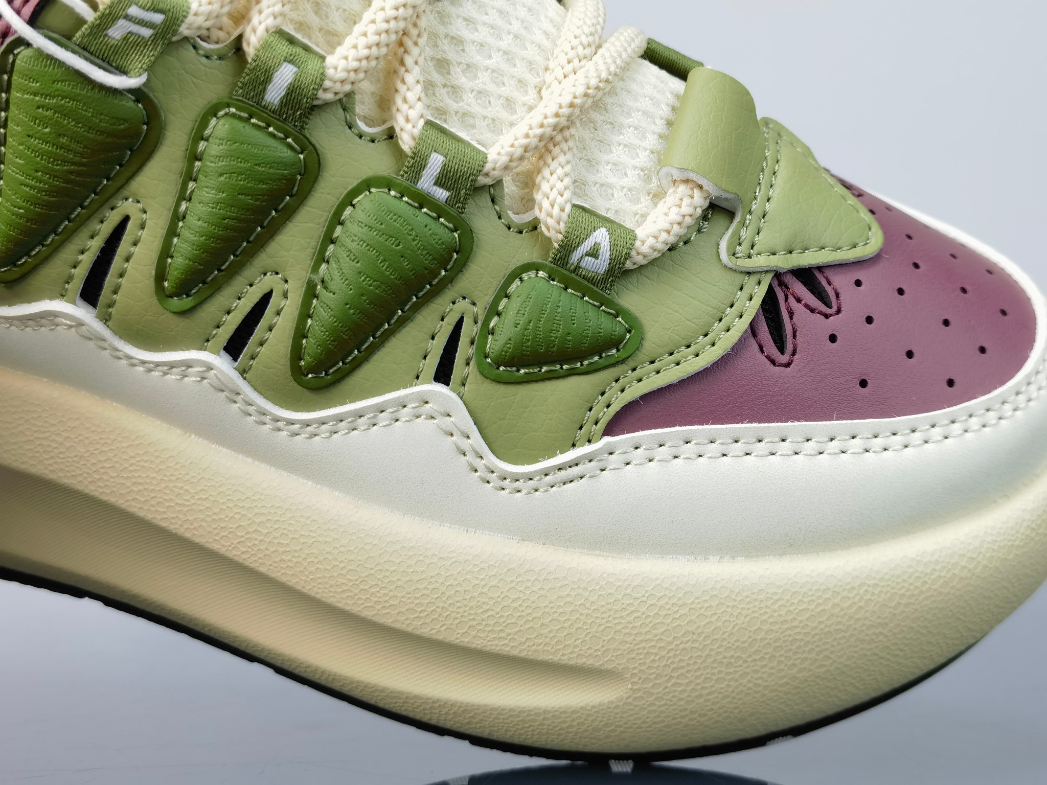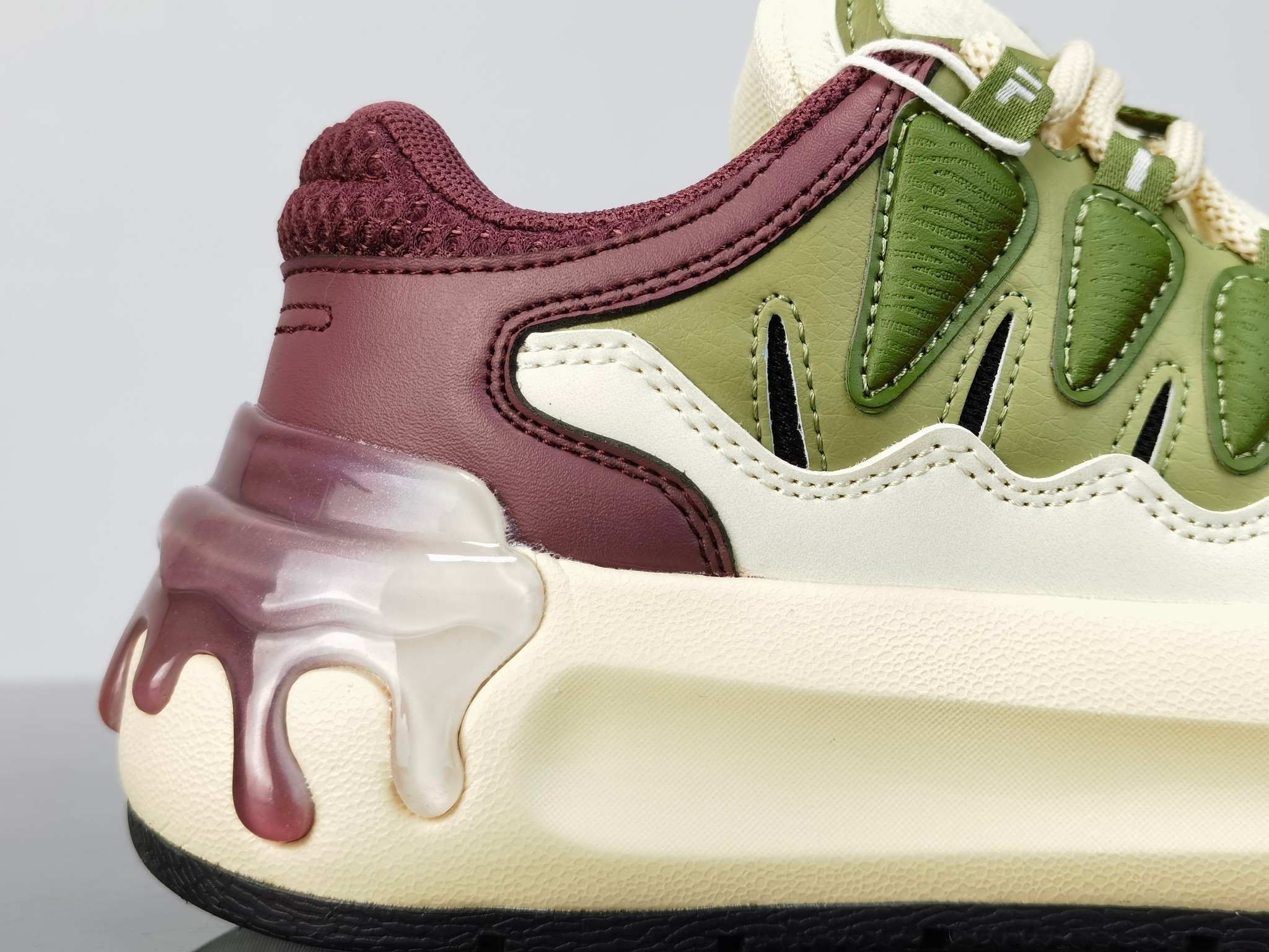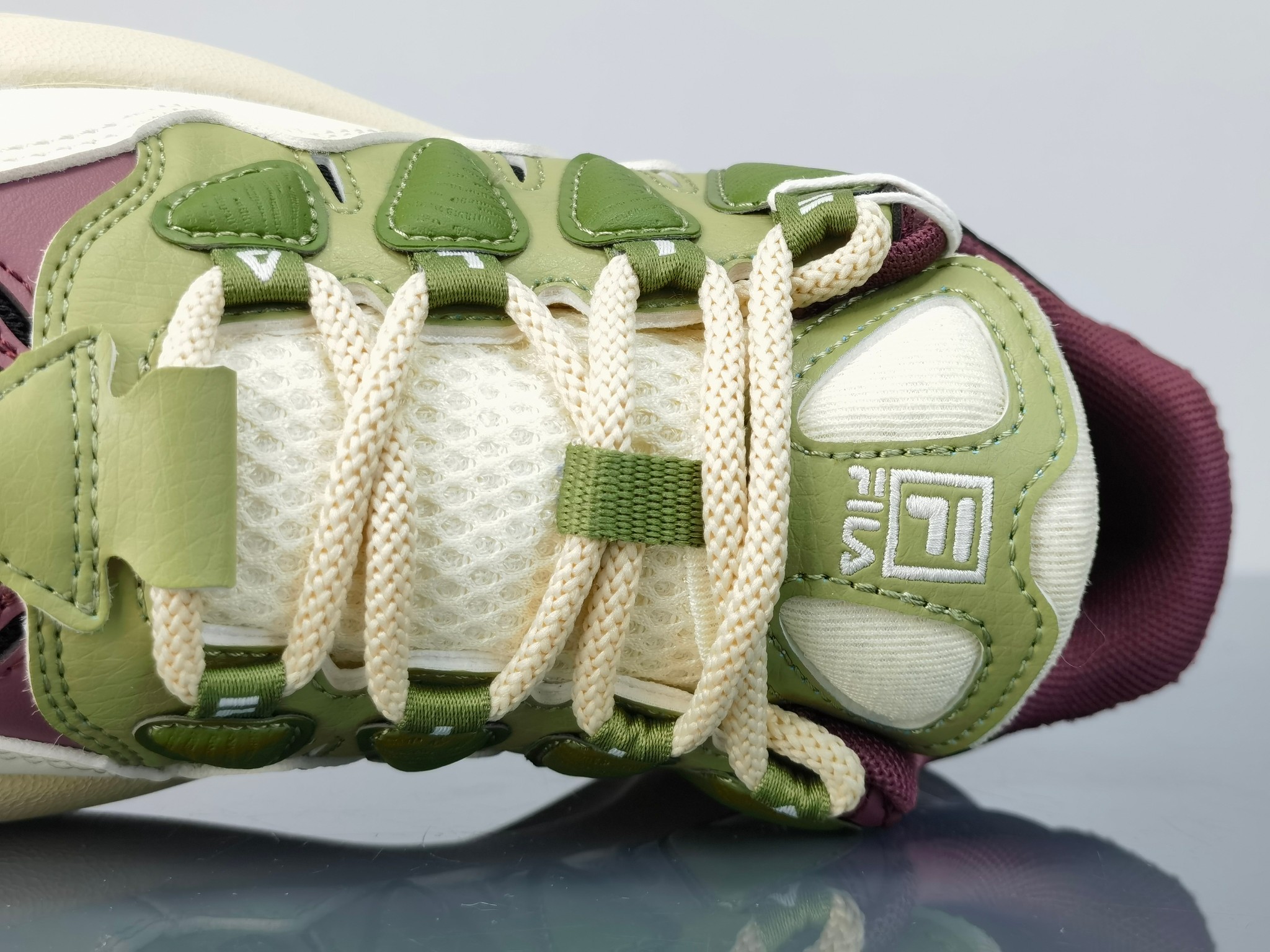 鞋身以安克拉红等颜色为主,侧面点缀多种元素眼片,还有红酒瓶软木塞装饰,以及特有的FILA情人节酒标元素 ,细节丰富。