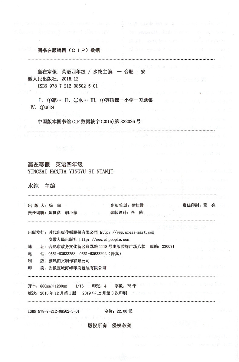 2020新版上海小学寒假作业 英语 4年级/四年级 赢在寒假 小学生寒假作业本练习册 基础巩固拓展提升新课预习 安徽人民出版社