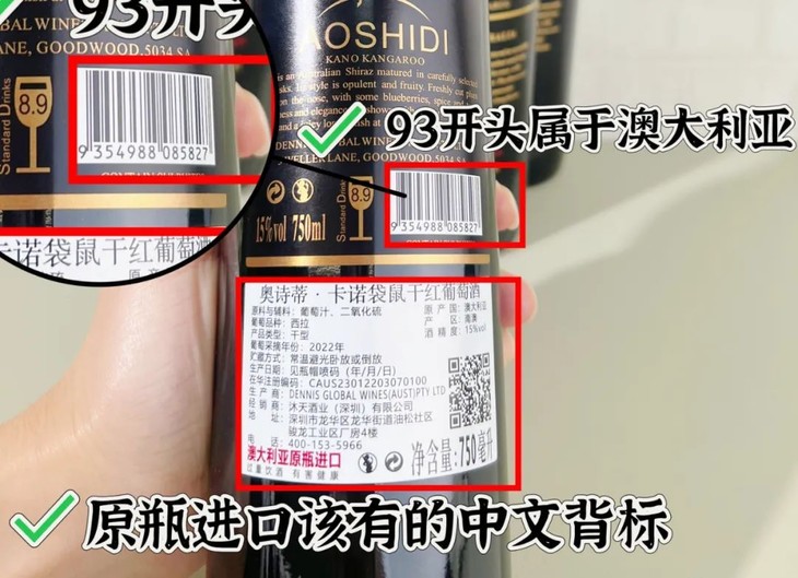 大家再看看这个,妥妥的真酒~ 和咱们今天开团的奥诗蒂- 卡诺袋鼠干红葡萄酒的背标很接近~