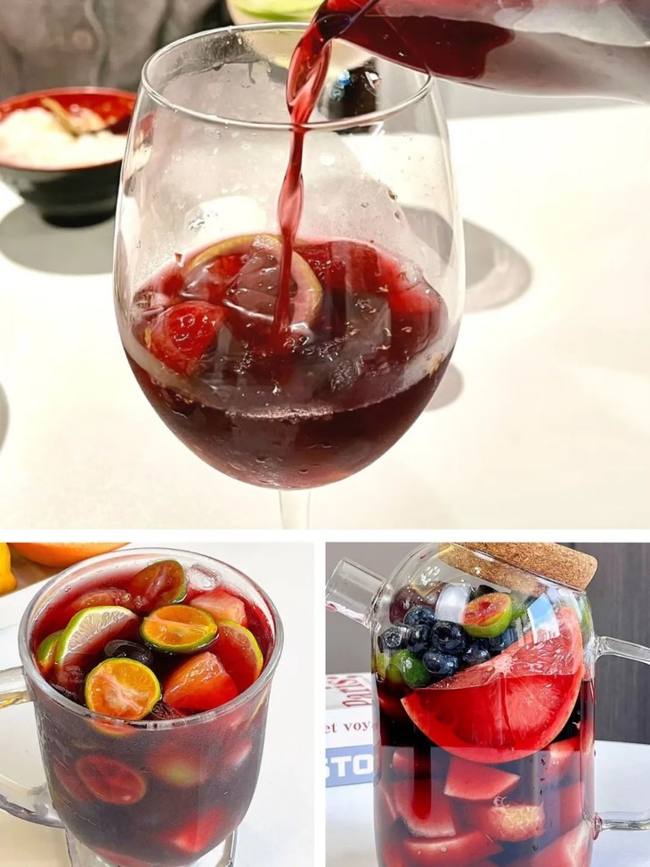 夏天的时候可以自制一杯水果红酒~ 把苹果、柠檬、橙子、草莓等 多种水果切成小块放入容器内 再倒入葡萄酒,冰箱冷藏半小时即可 酸酸甜甜,爽口上头!