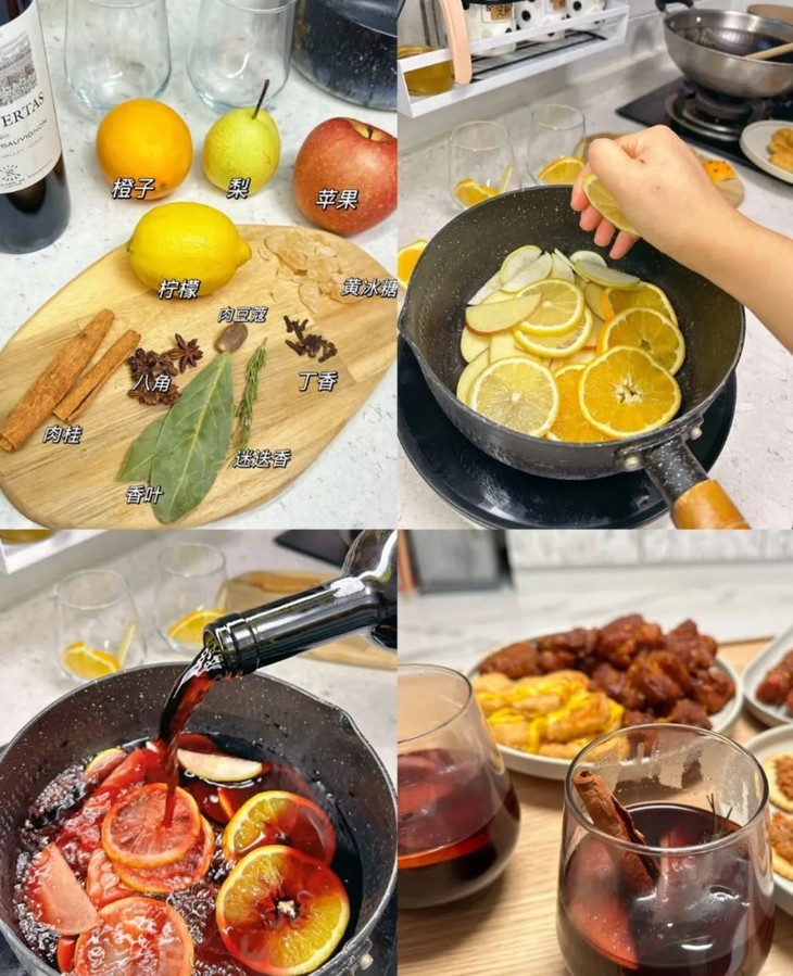 葡萄酒的吃法也很多~ 像北方比较冷的地方,不妨试试“热红酒” 可以加入多种食材一起烹煮,养生又暖胃。