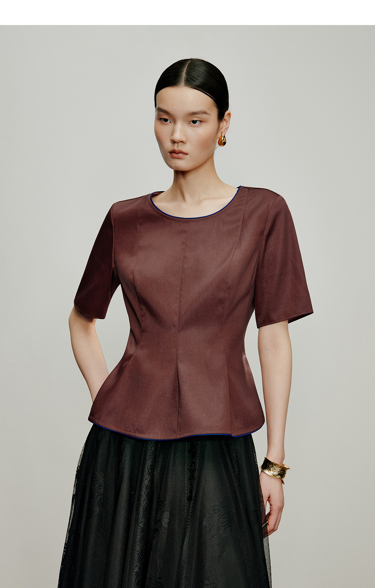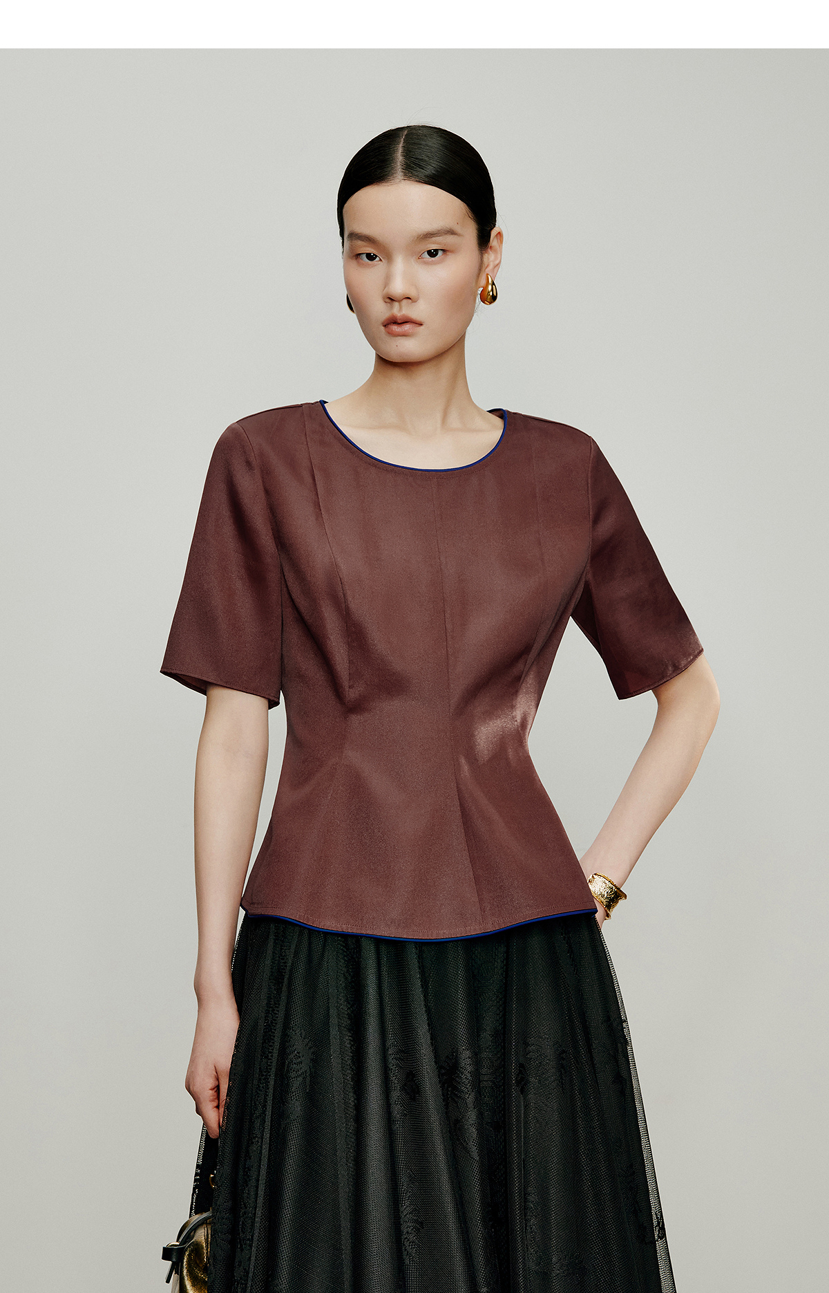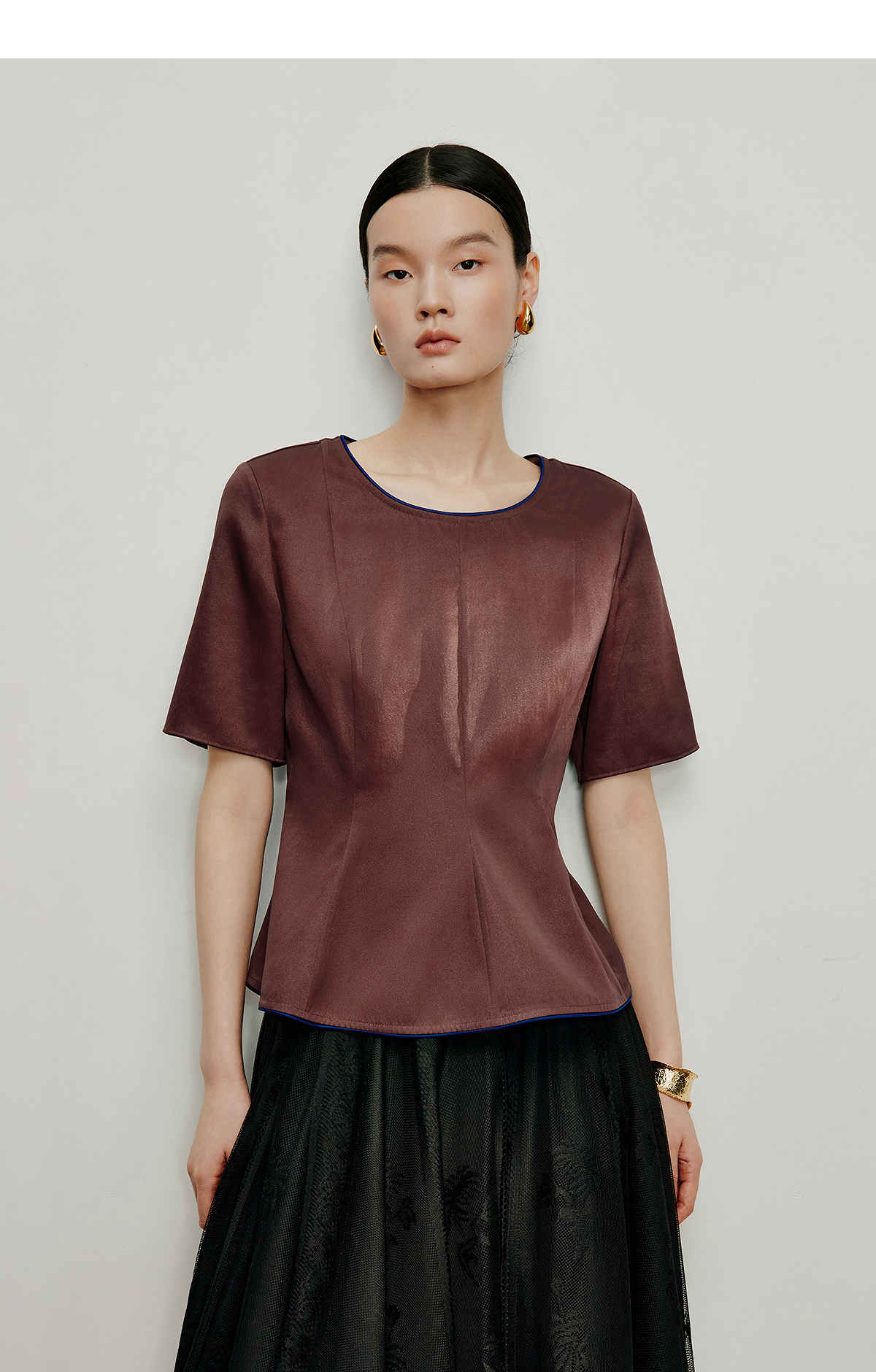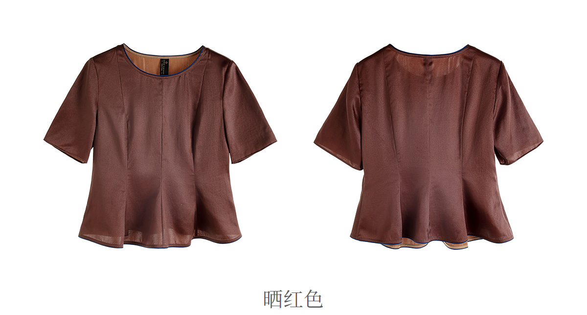 【林栖设计小店】落日霞光|素平缎红云纱荷叶边修身显瘦2026夏新款T恤1962029