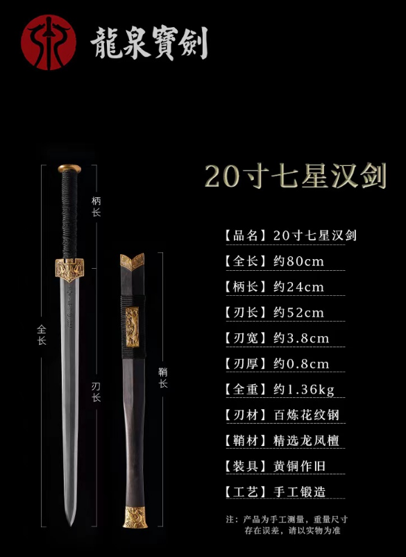 热卖中!!【龙泉宝剑厂】20寸龙泉七星汉剑 未开刃/龙泉云龙大马士革斩切刀