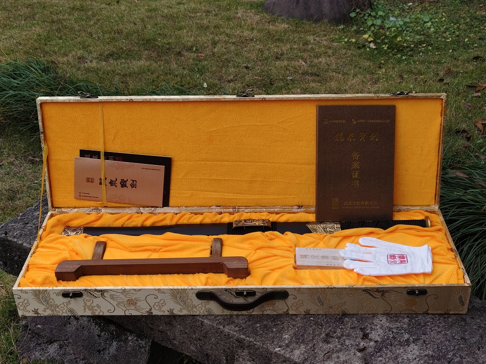 龙泉七星汉剑*1把;实木剑架*1副;收藏证书*1份;备案证书*1份;宣传手册*1份;保养套盒*1份;把玩手套*1副