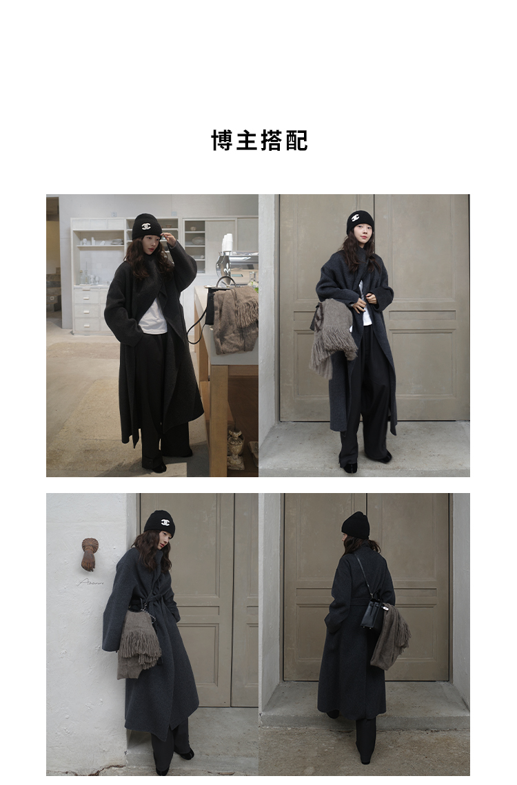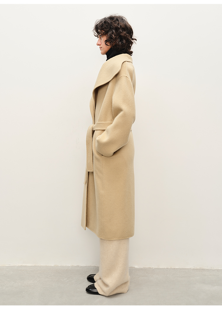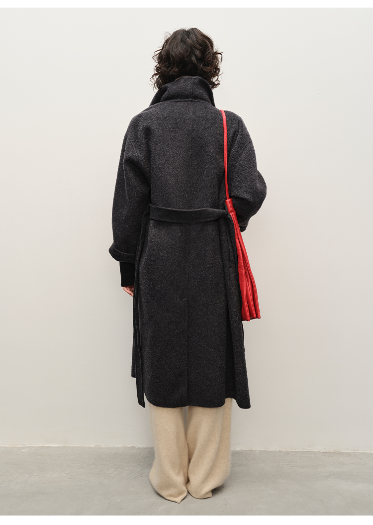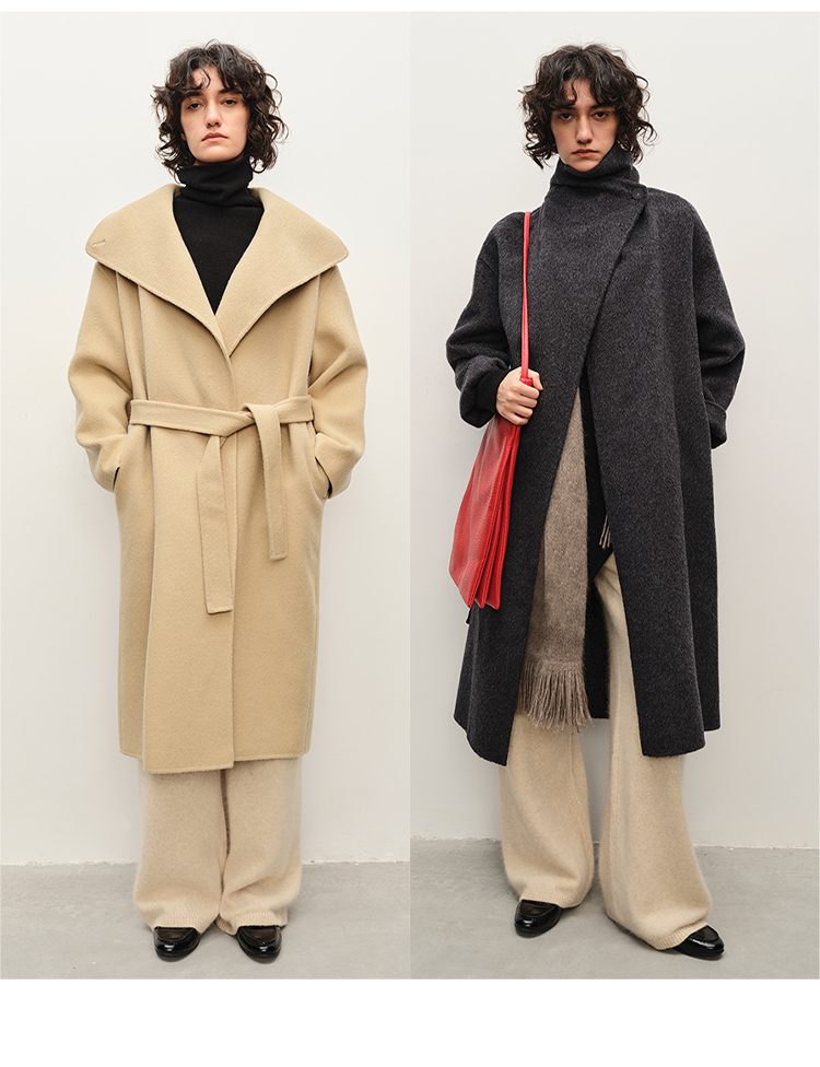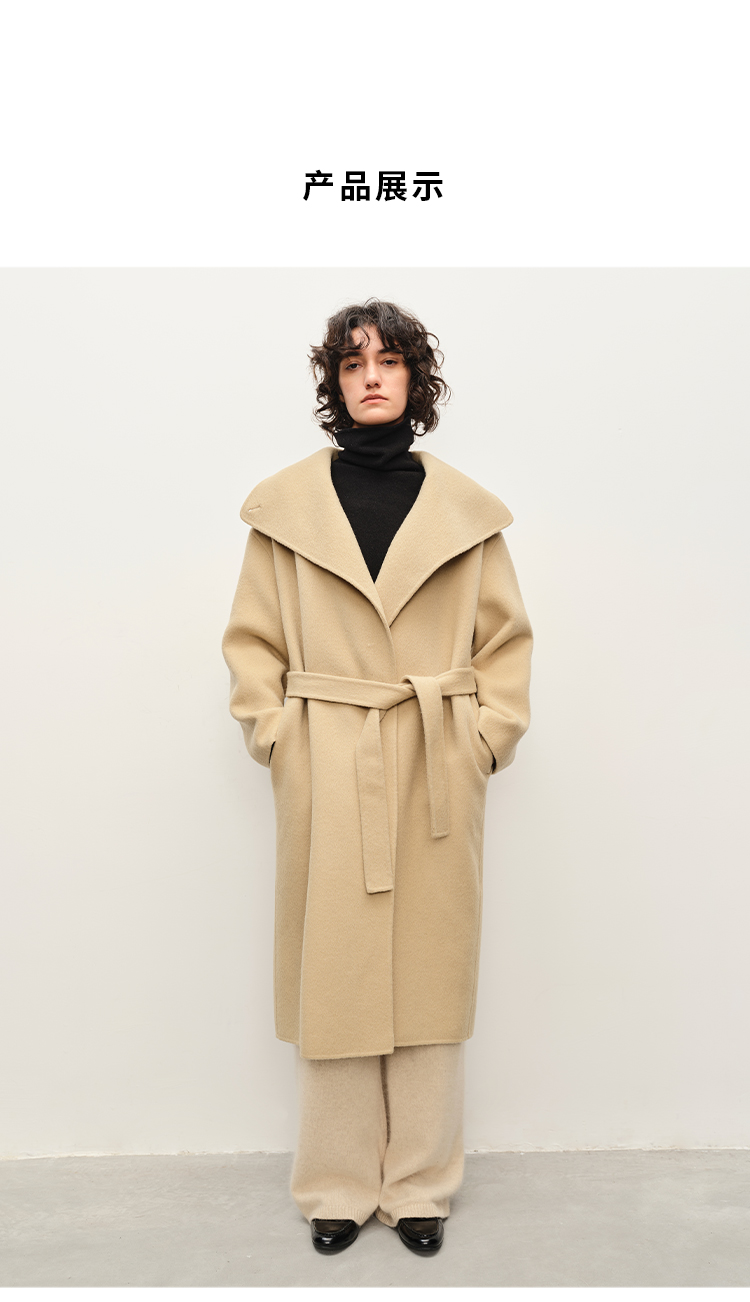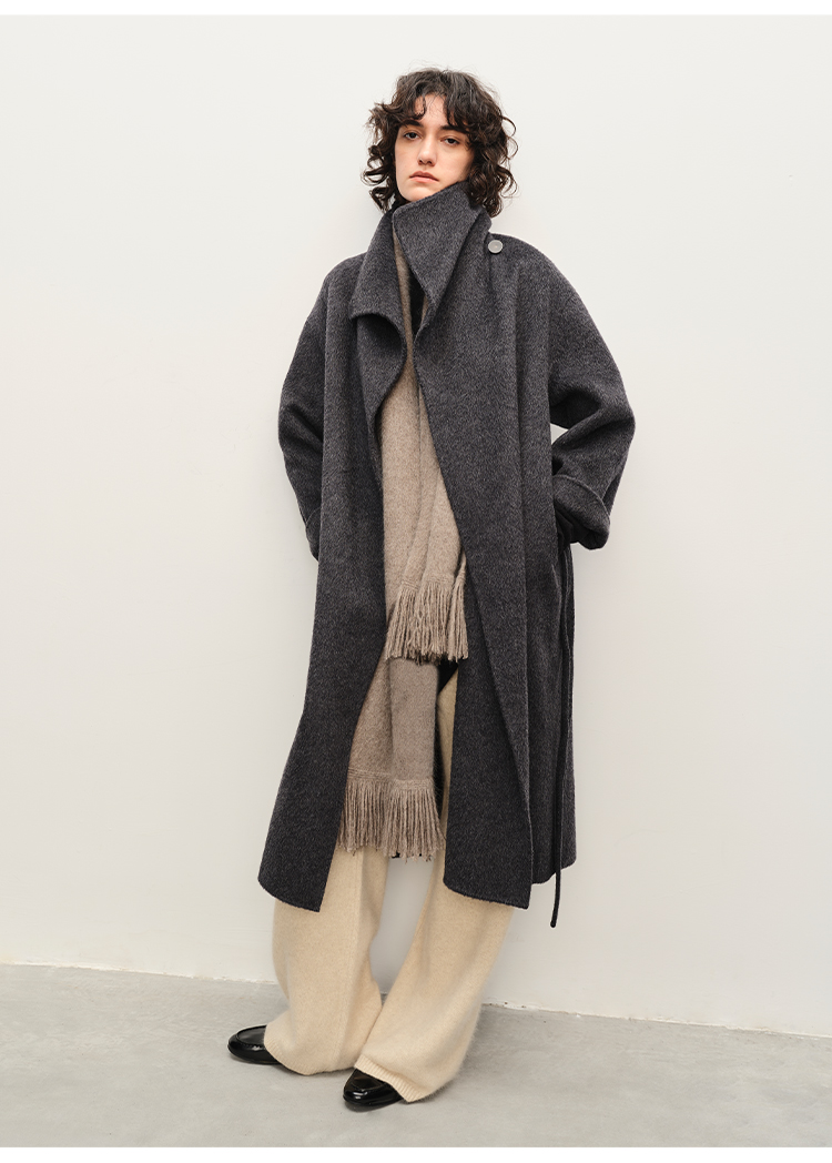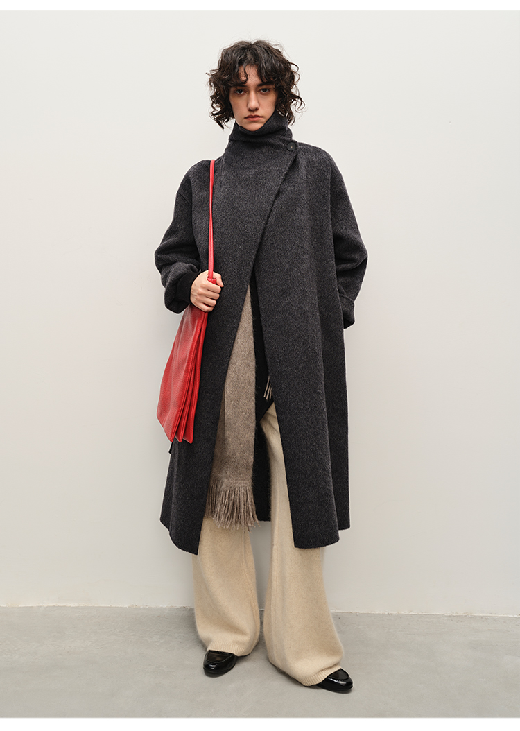 HIDEMI 澳洲美利奴羊毛长毛不规则剪裁门襟堆堆领长款大衣