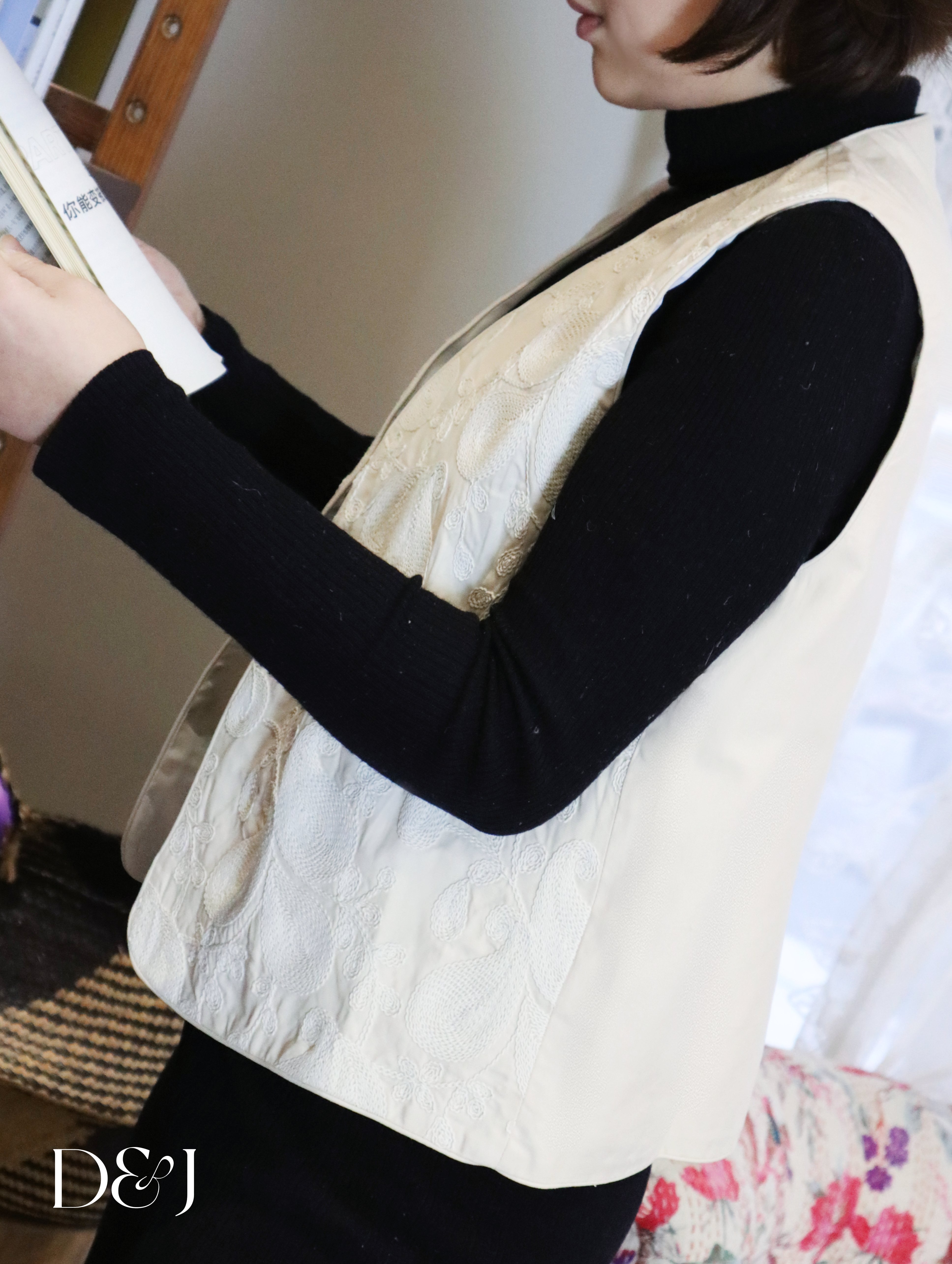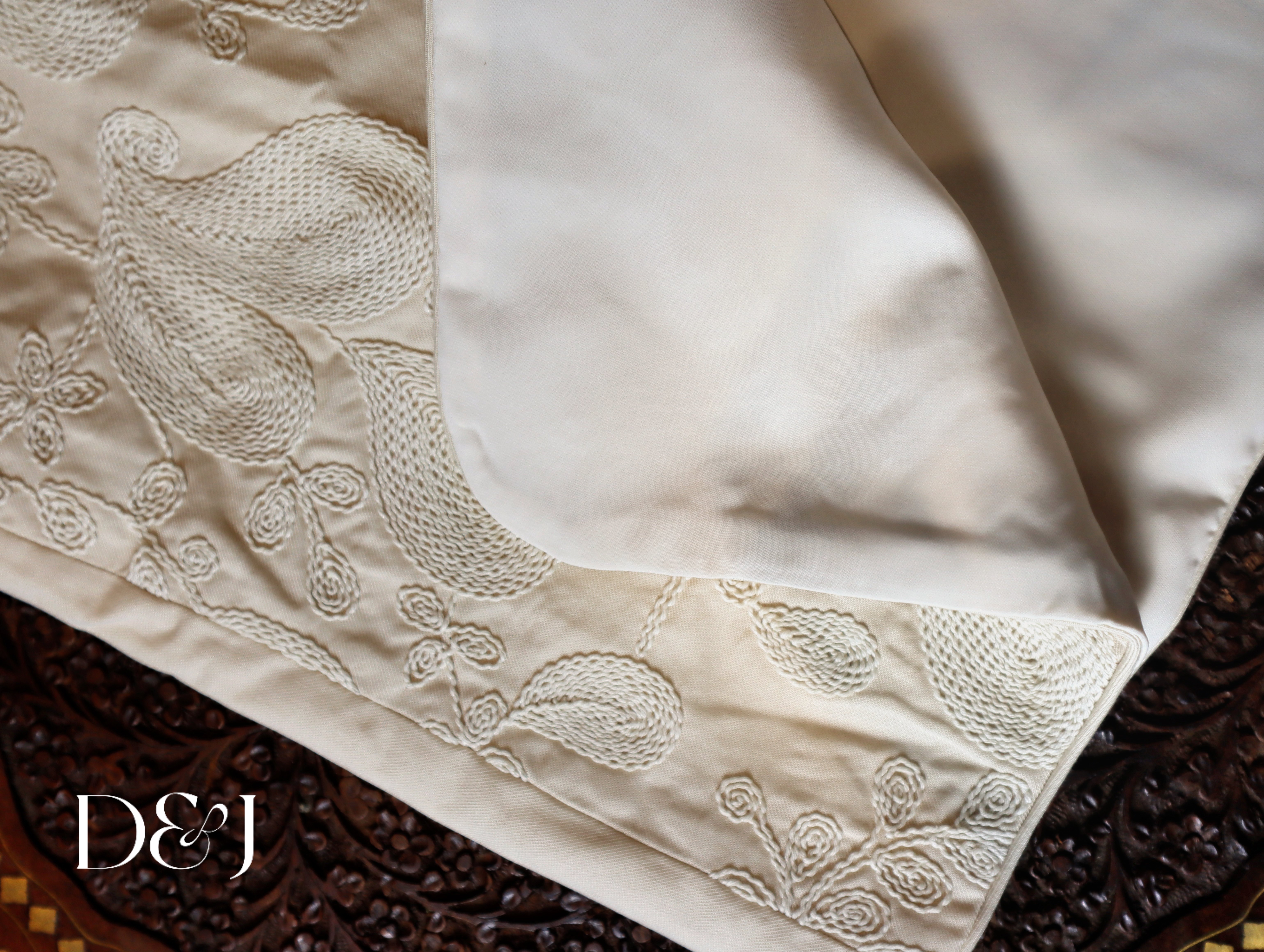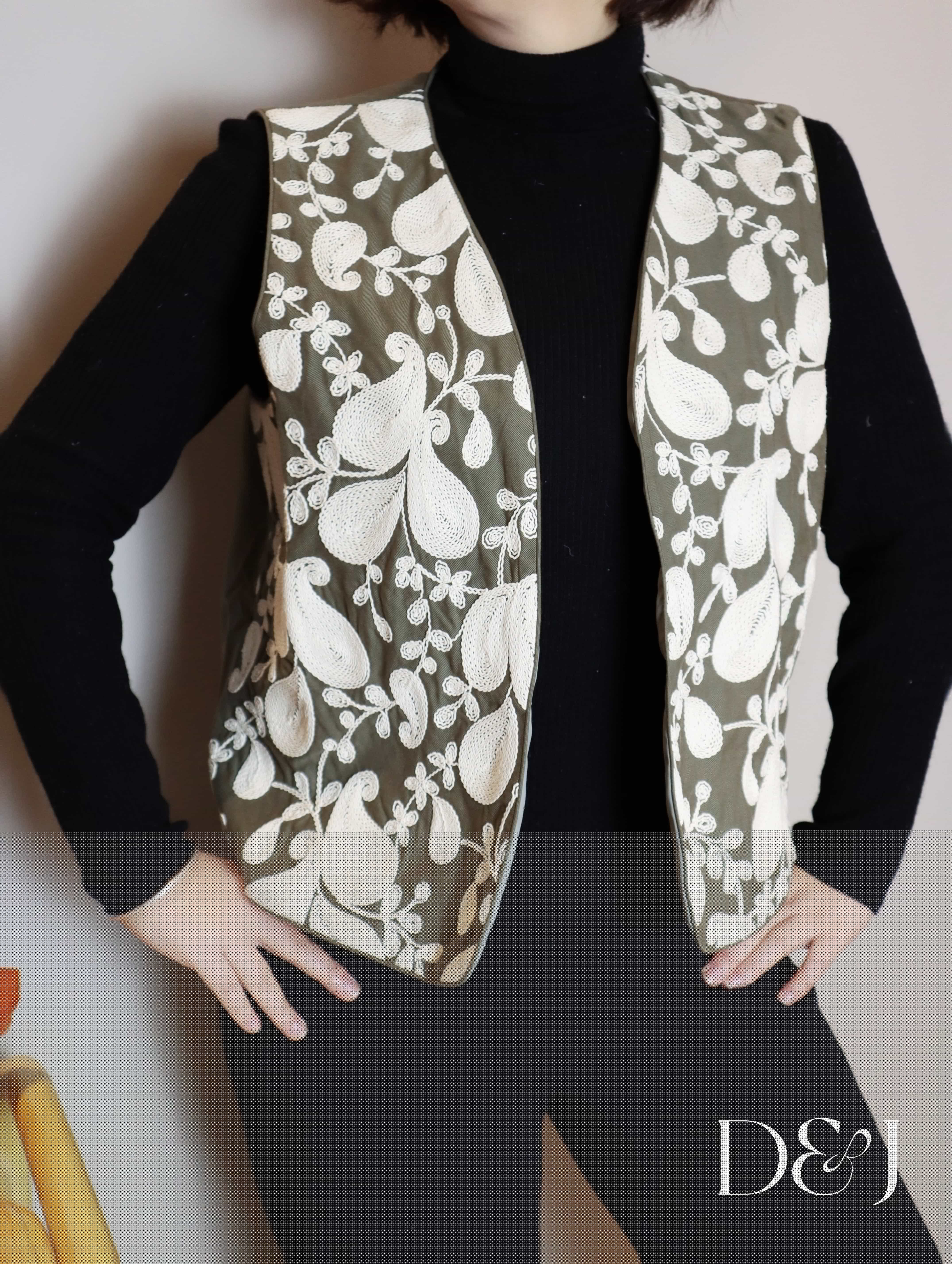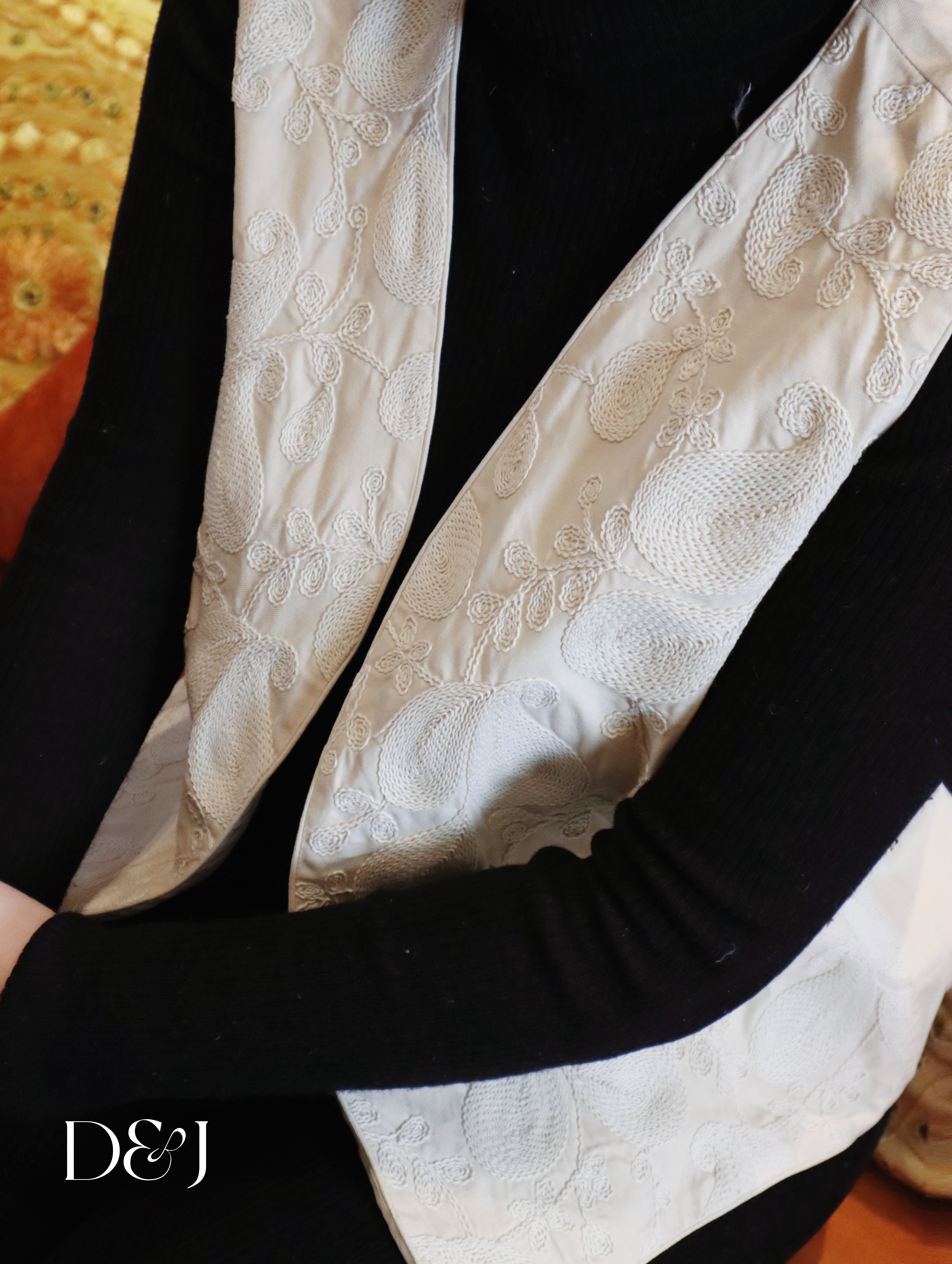 面料特色:棉底材质上满绣绳绣,绳绣是印度传统的一种手工刺绣方式,有非常古老的历史并沿袭至今仍在使用。棉麻面料,透气舒适。