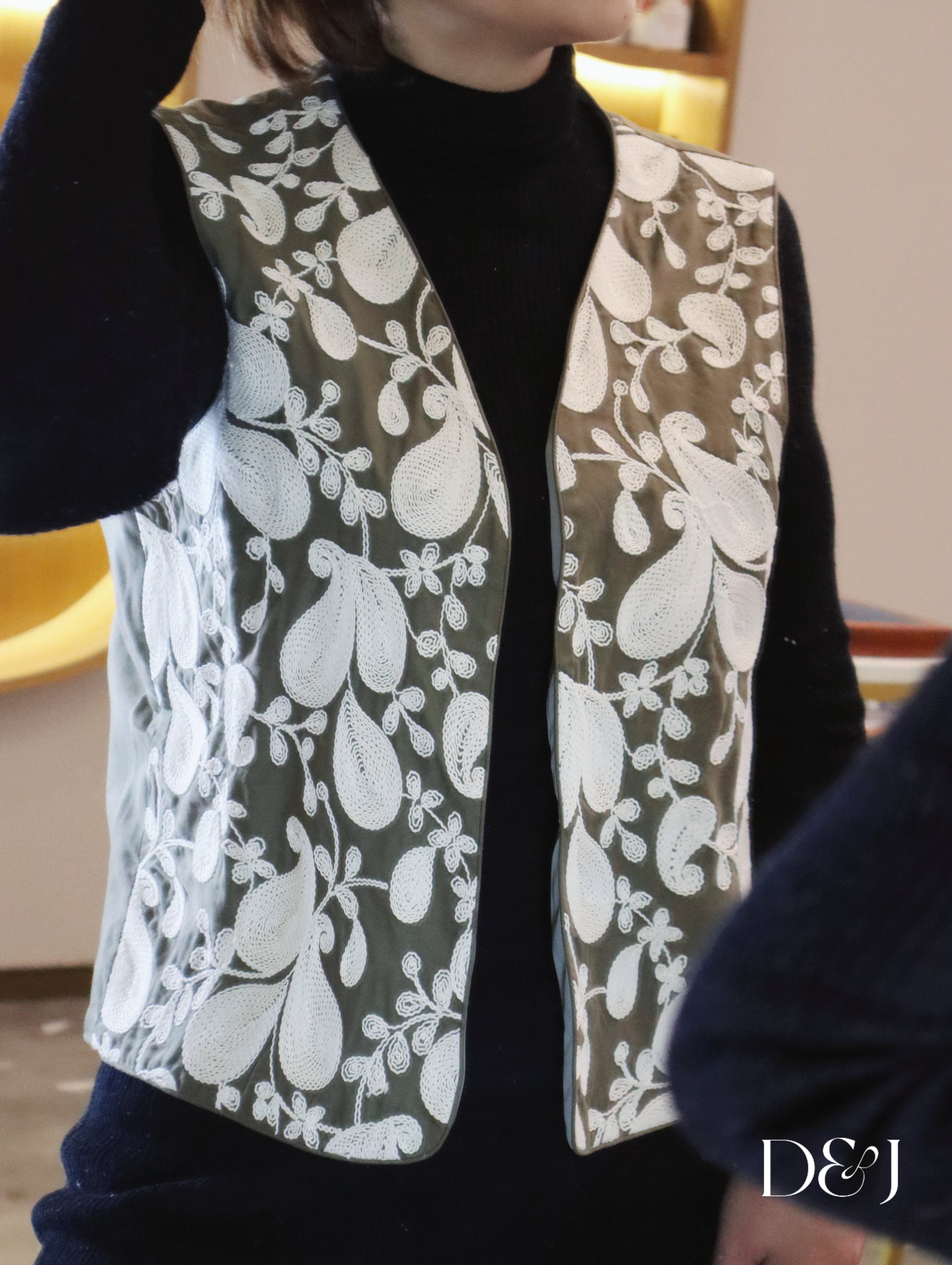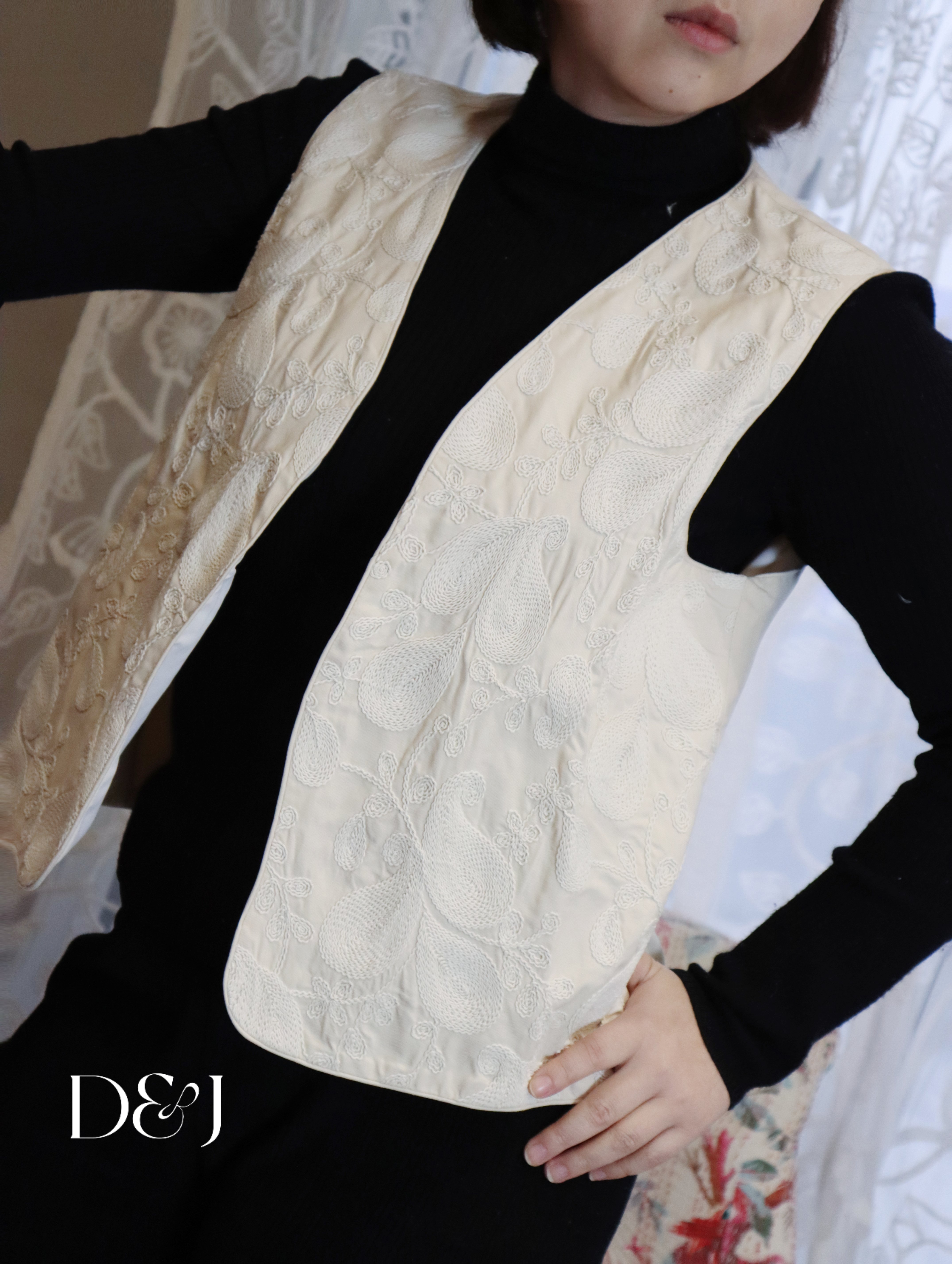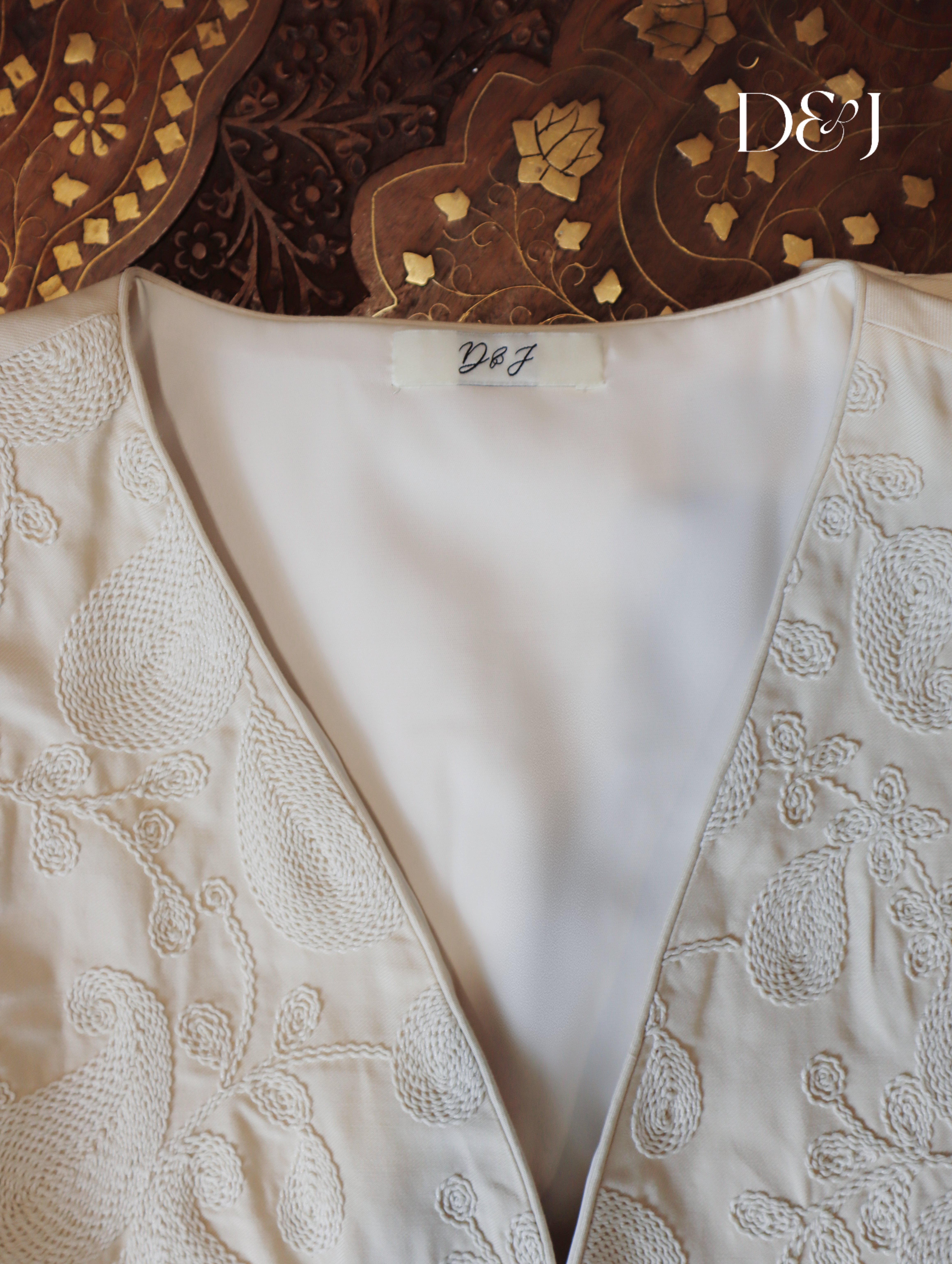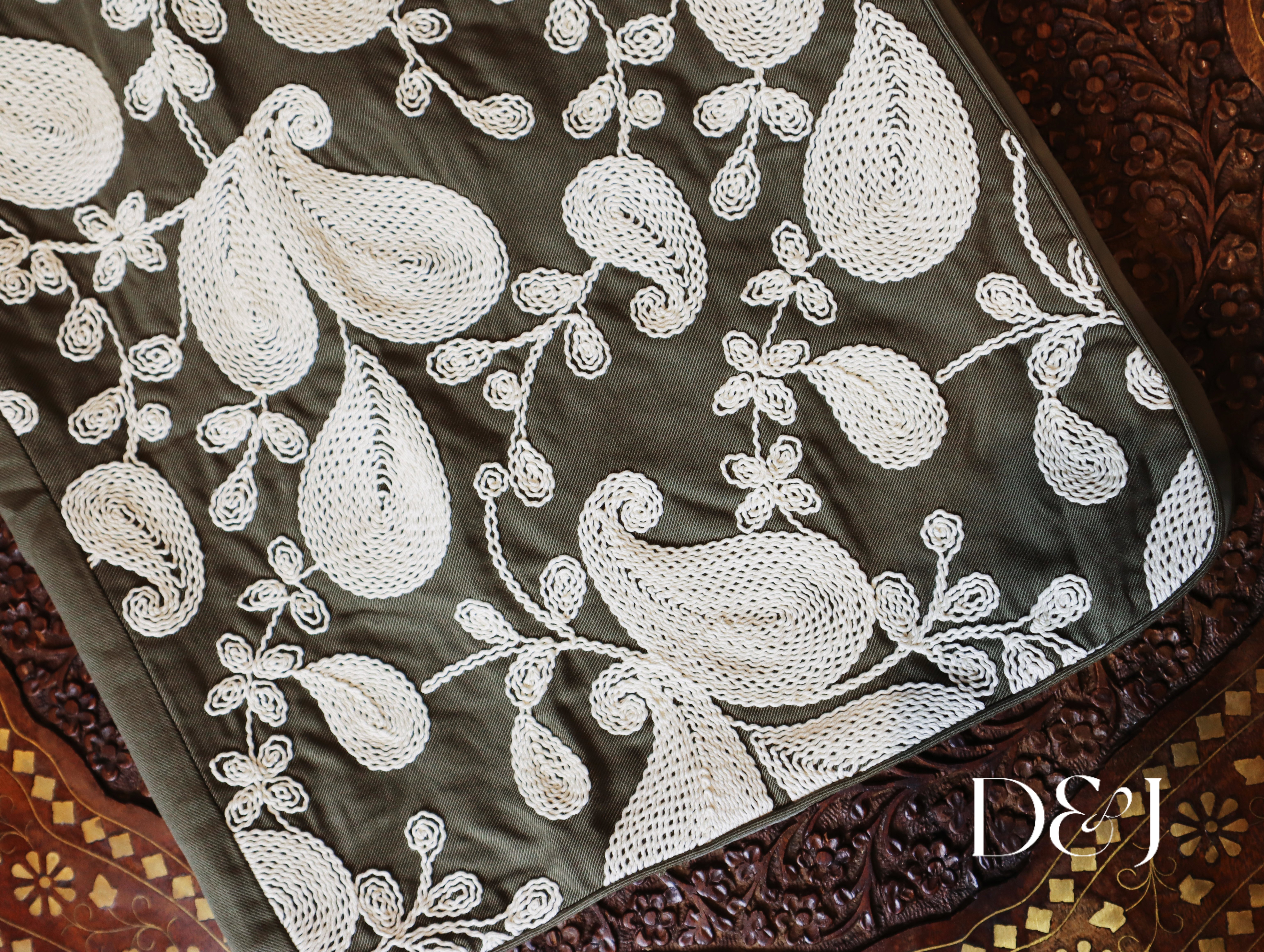 面料特色:棉底材质上满绣绳绣,绳绣是印度传统的一种手工刺绣方式,有非常古老的历史并沿袭至今仍在使用。棉麻面料,透气舒适。