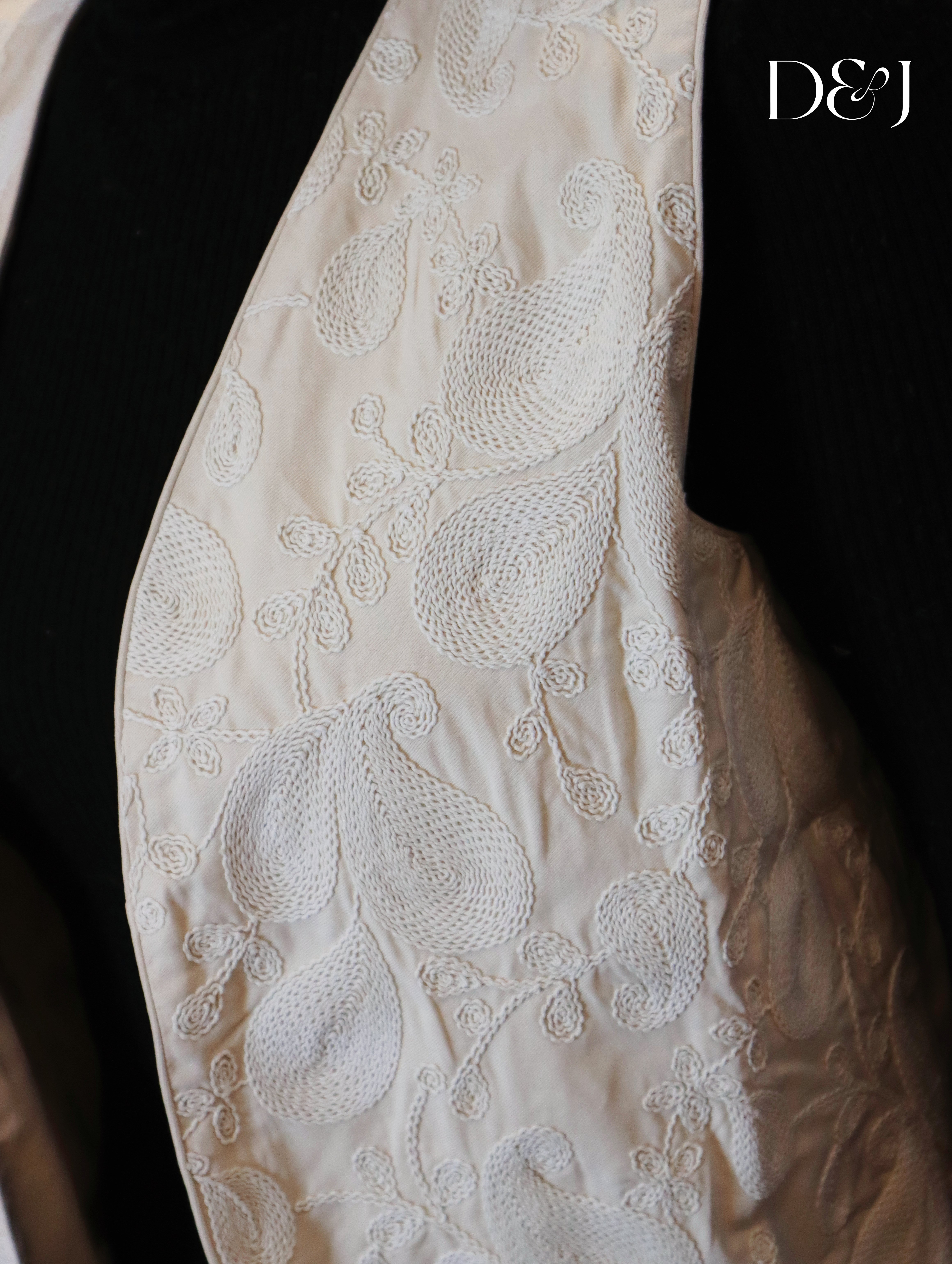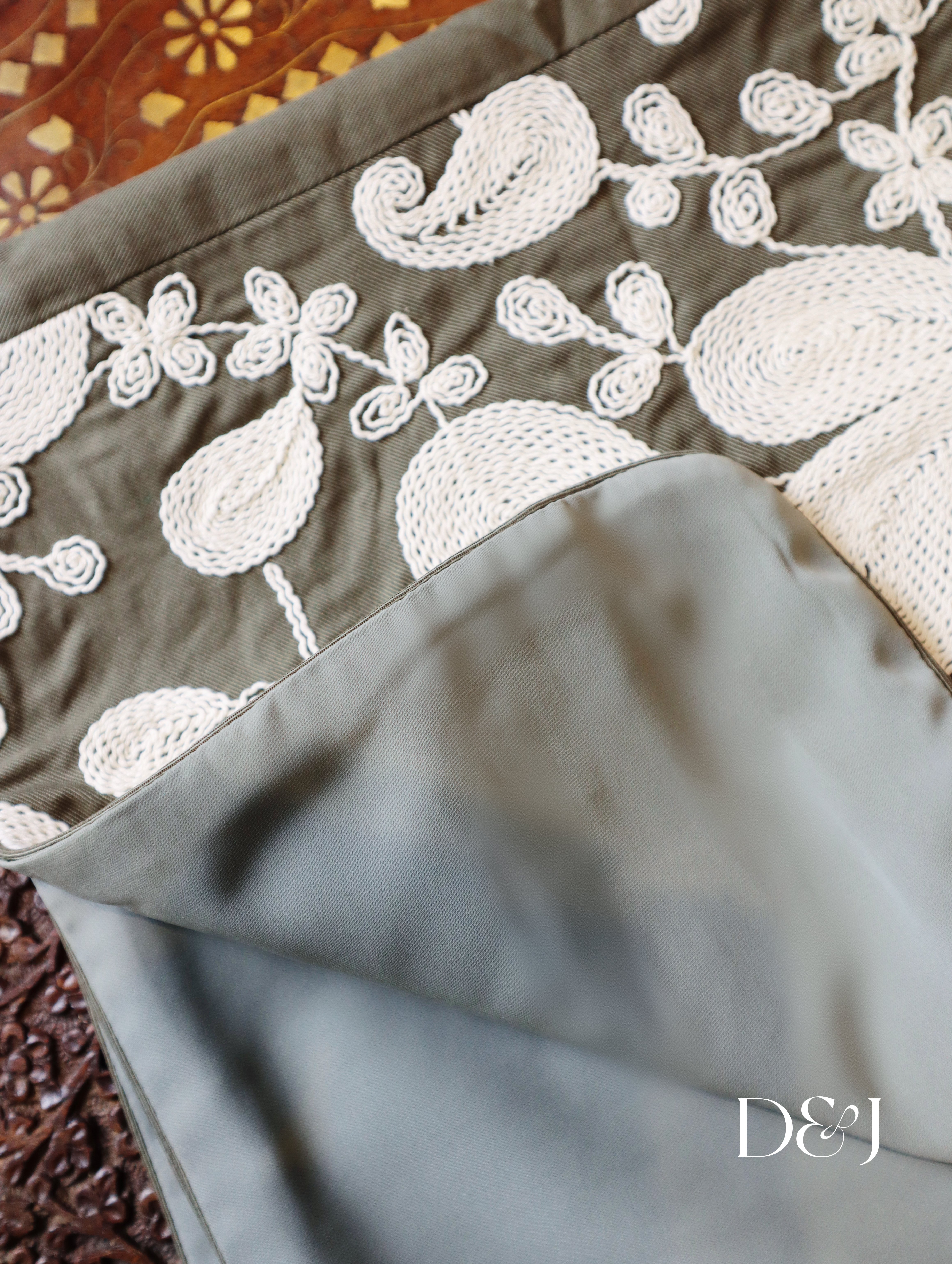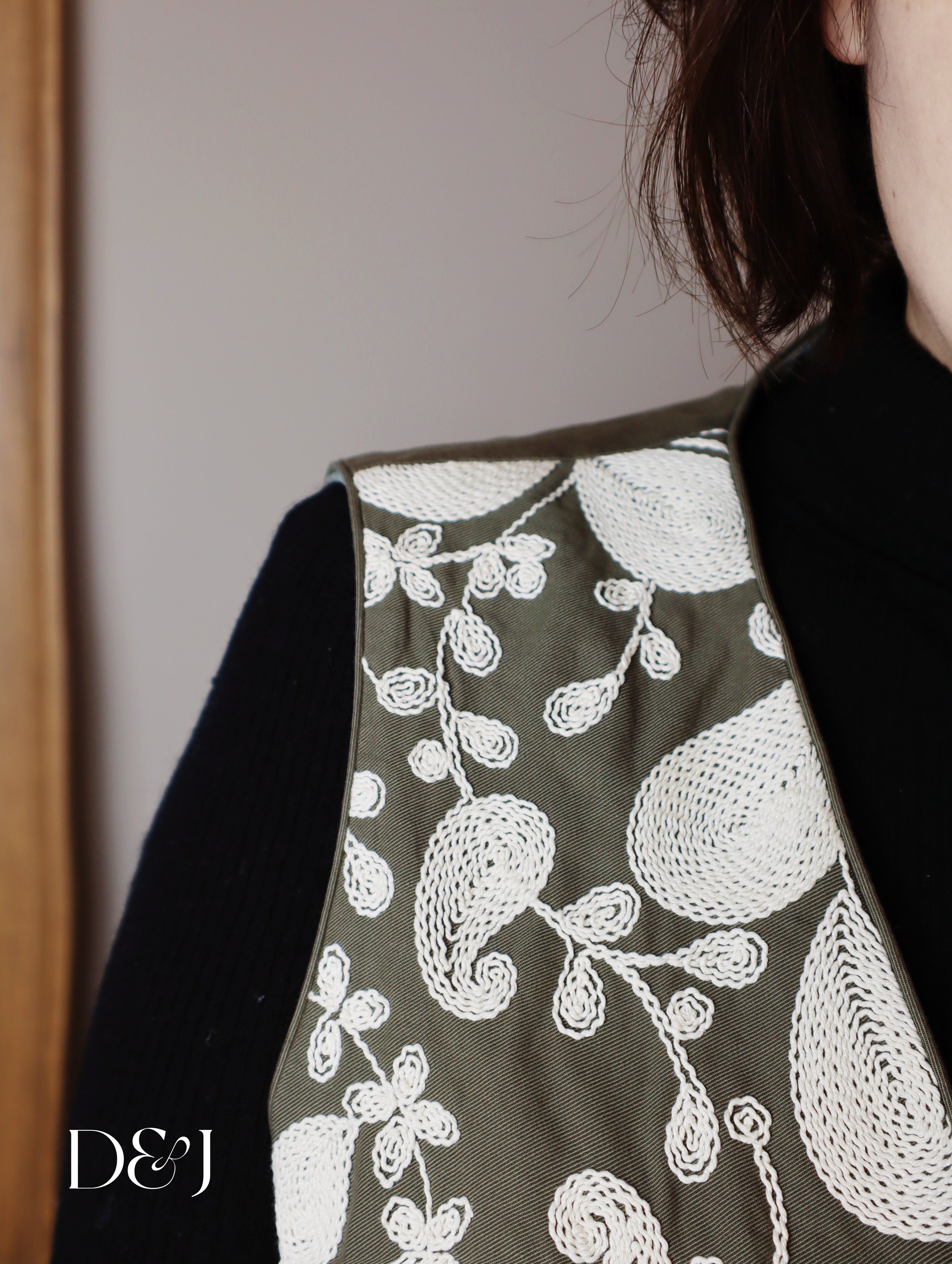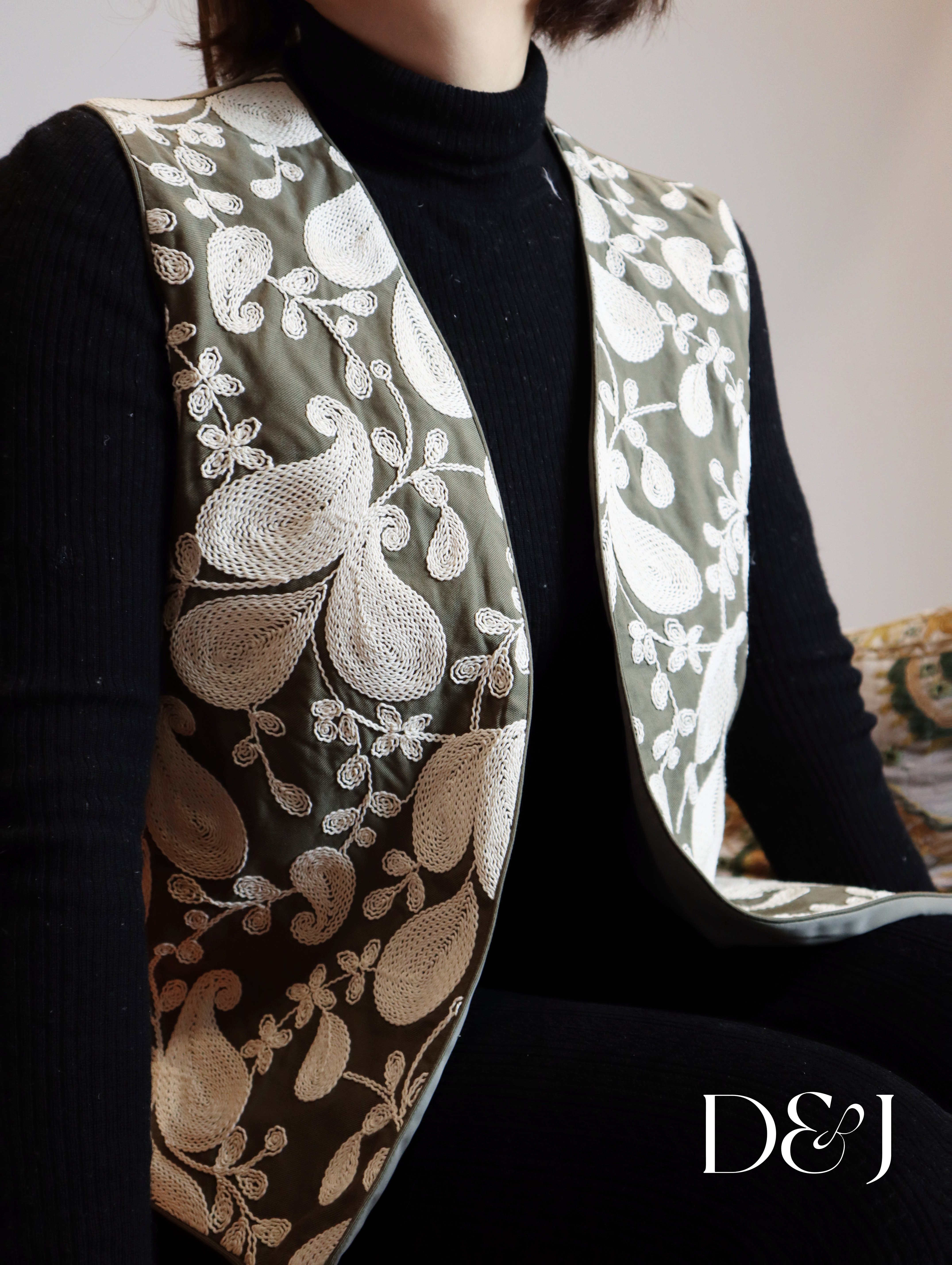 面料特色:棉底材质上满绣绳绣,绳绣是印度传统的一种手工刺绣方式,有非常古老的历史并沿袭至今仍在使用。棉麻面料,透气舒适。