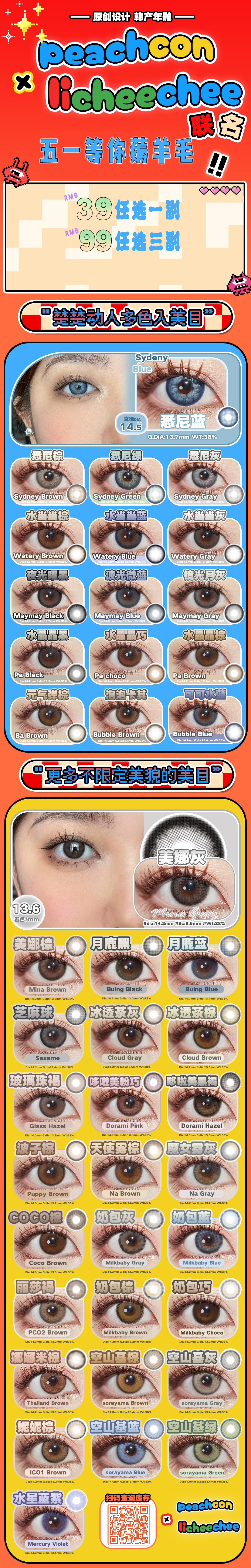 【活动】PEACHCON&LI CHEECHEE年抛 爆款 空山基/美娜棕/COCO棕/冰透茶灰/水晶晶/芝麻球/水星蓝紫/魔女雾灰/元气弹棕/泡泡卡其/悉尼系列/哆啦美粉巧/水当当蓝 混血日常美瞳