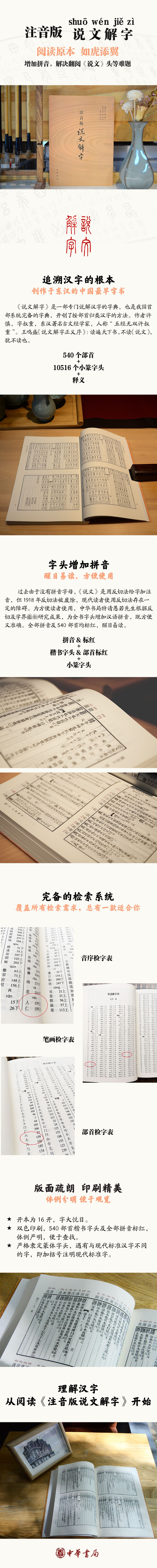 《说文解字》为东汉许慎所撰,是我国第一部系统分析字形、考究字源的文字学著作,是中国历史上的第一部字书。中华书局1963年以陈昌治本为底本,印行《说文解字附检字》,2013年重新制版,出版了《说文解字附音序、笔画检字》。发行以来,深受读者欢迎之外,也收到读者反馈,因绝大多数读者对反切不很熟悉,因而对字的读音颇感困惑,应读者之需,我们根据反切给所有汉字加注了汉语拼音,以方便读者。