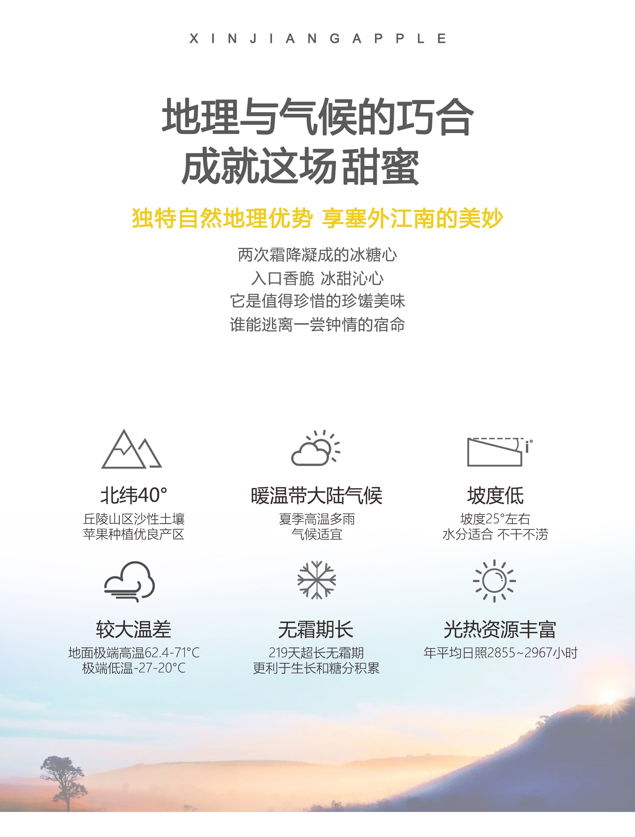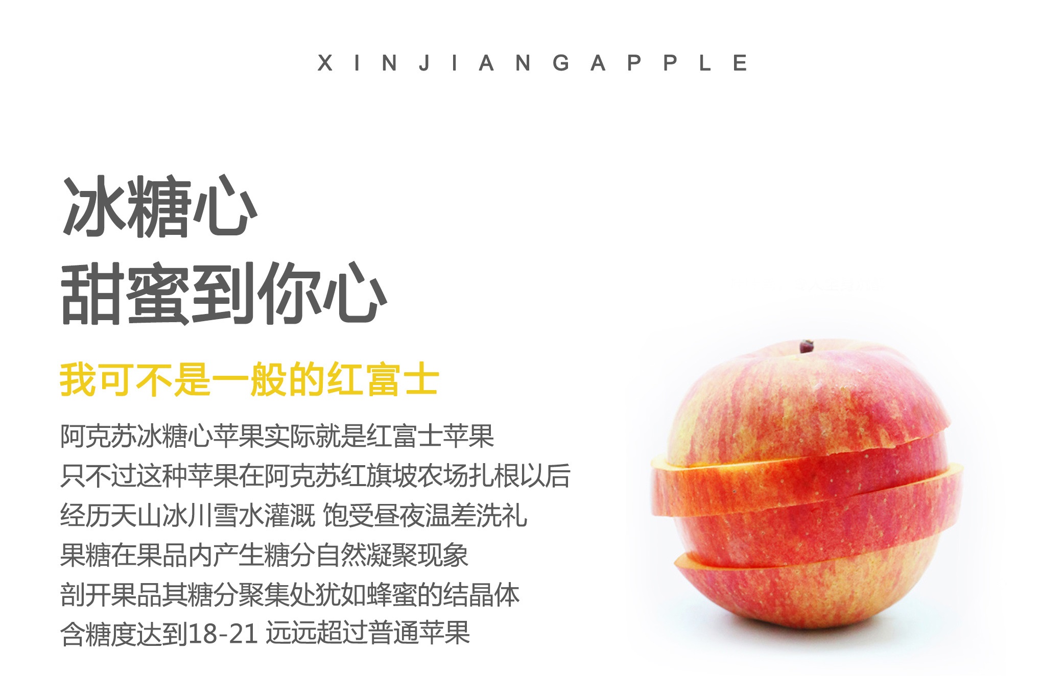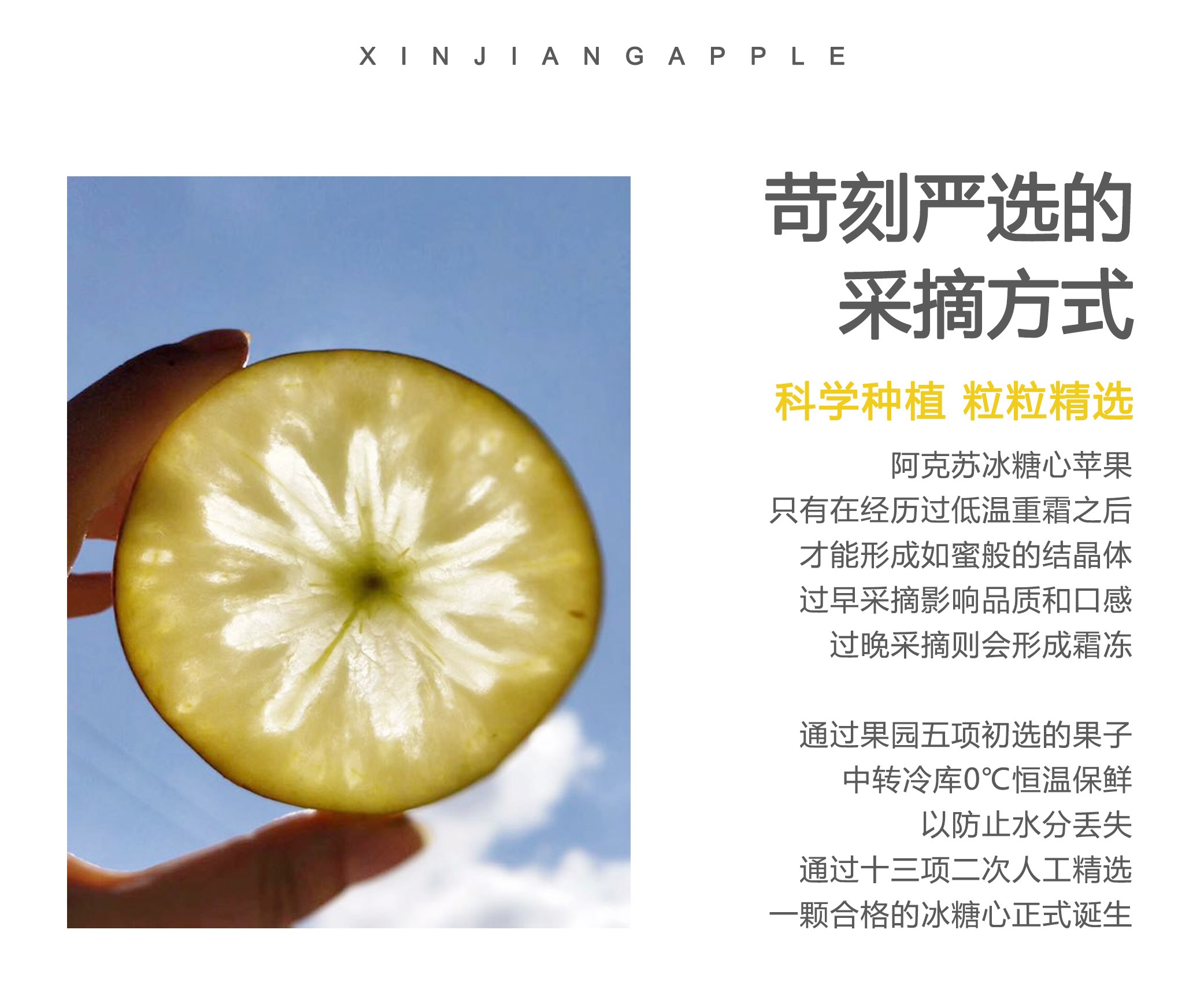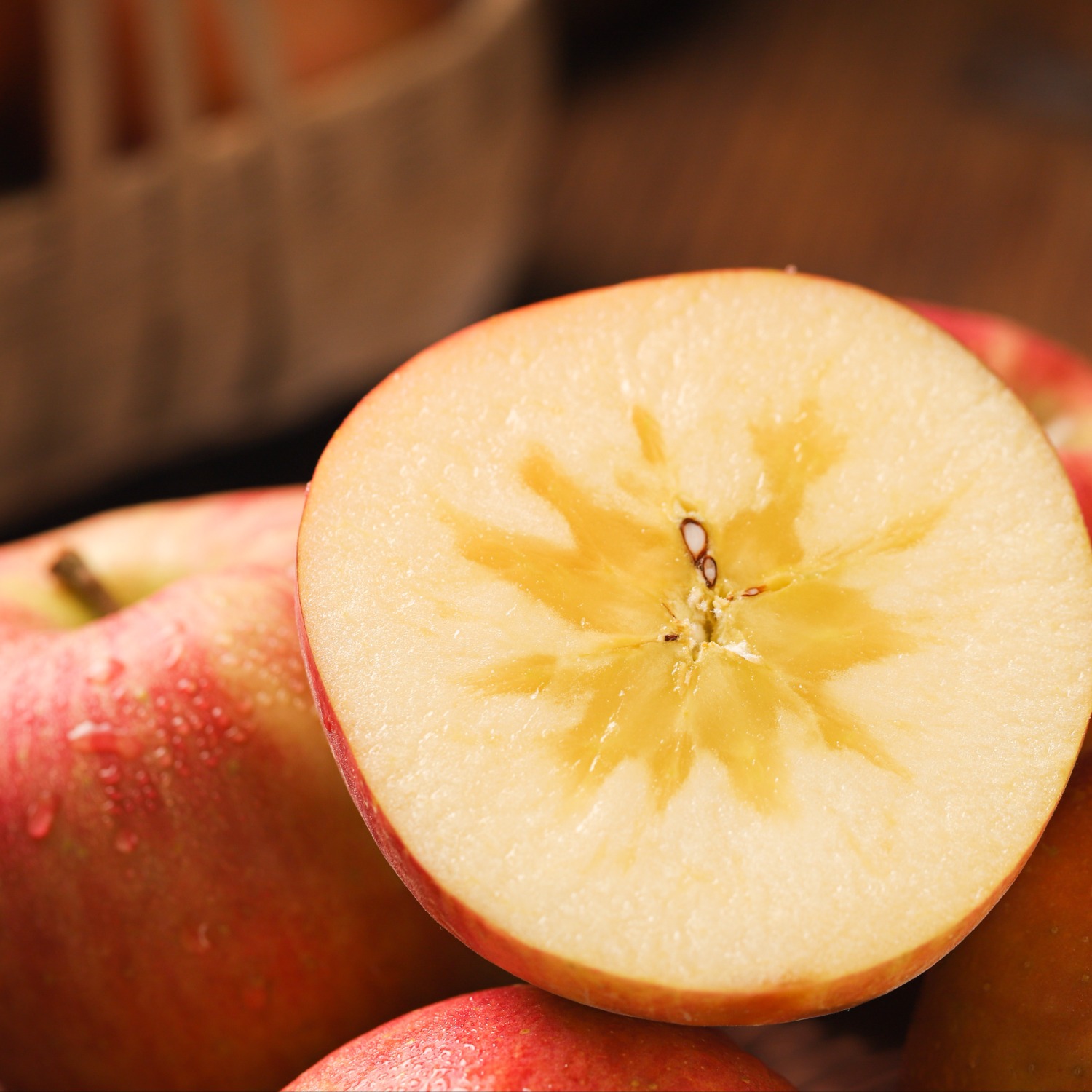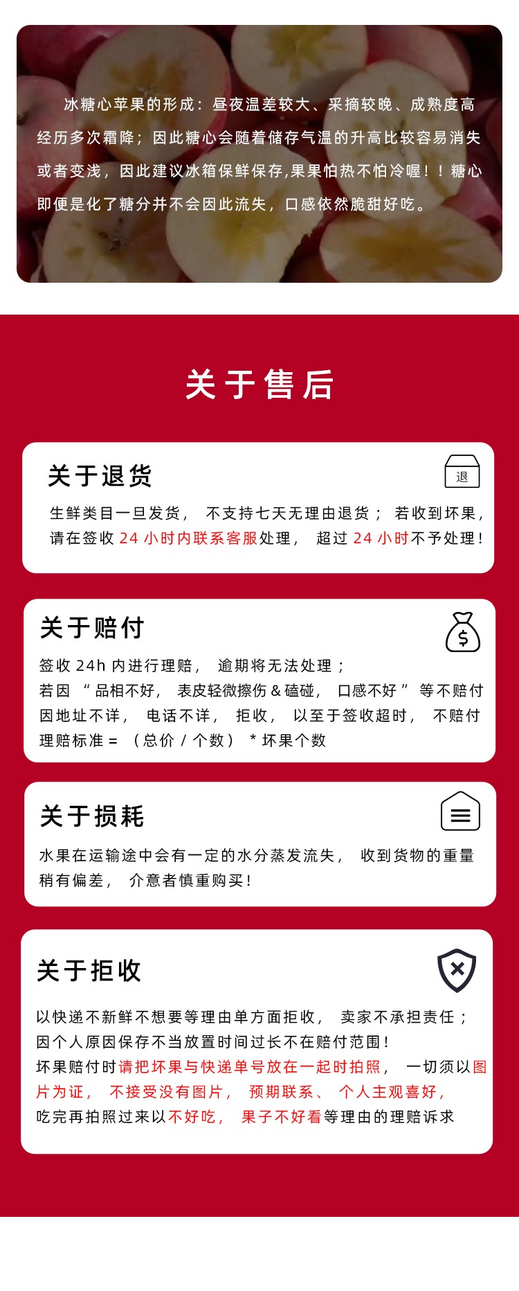 【温馨提示】由于贮存条件和气候等原因,糖分会溶解在果肉中,导致冰糖心会变浅或消失,但苹果甜度不会因此降低,请放心享用,糖心多少并不影响苹果品质,不属于售后范围哟~