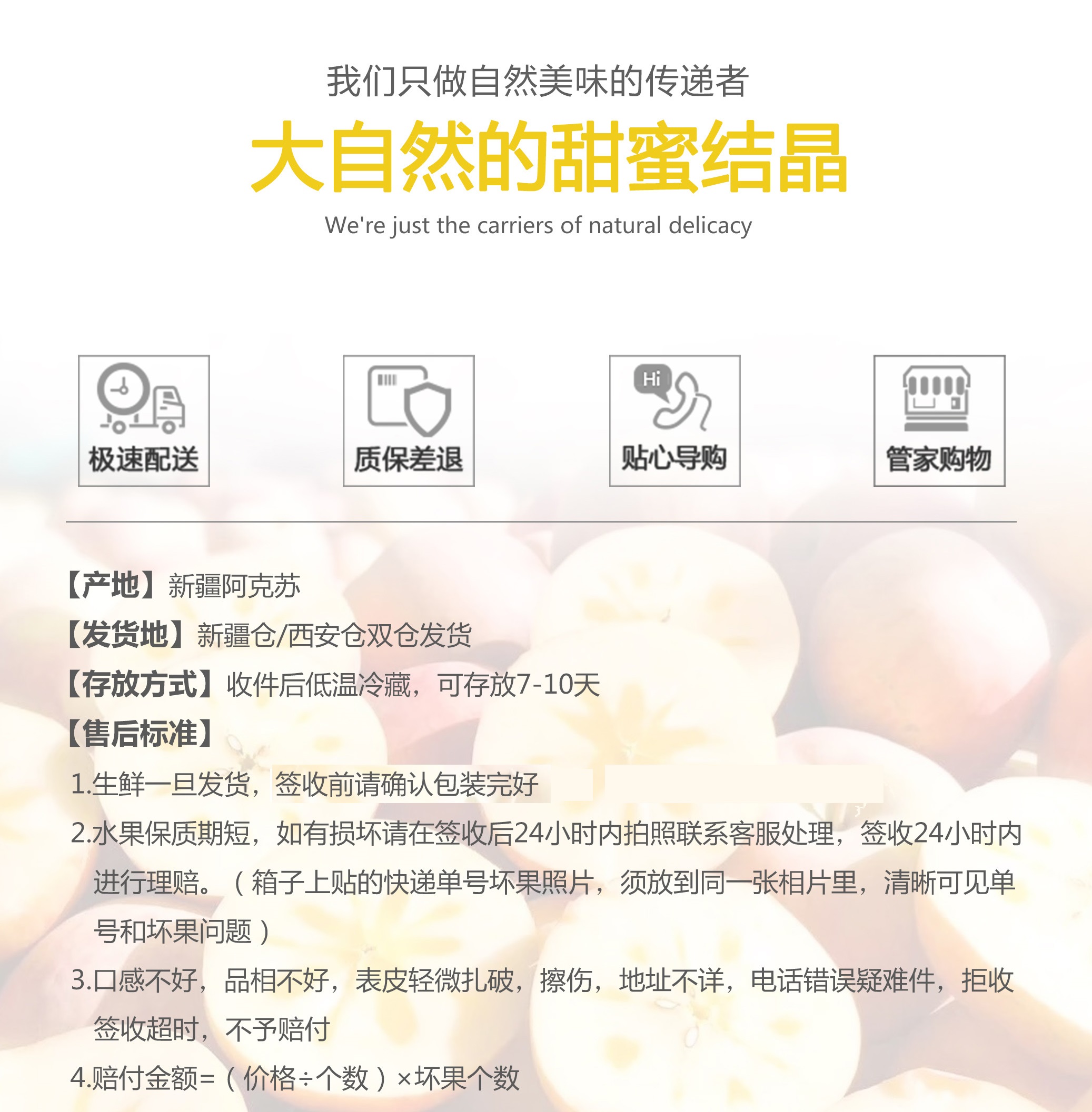 1.阿克苏苹果属于新鲜水果,不支持退换货,如有损伤或问题,请摆放一起拍照发给客服