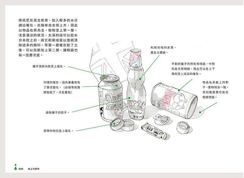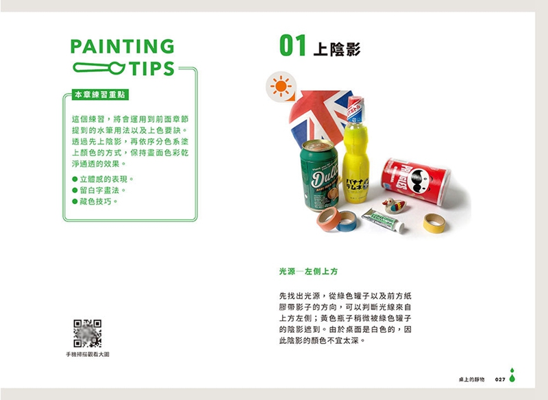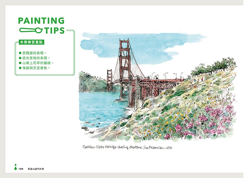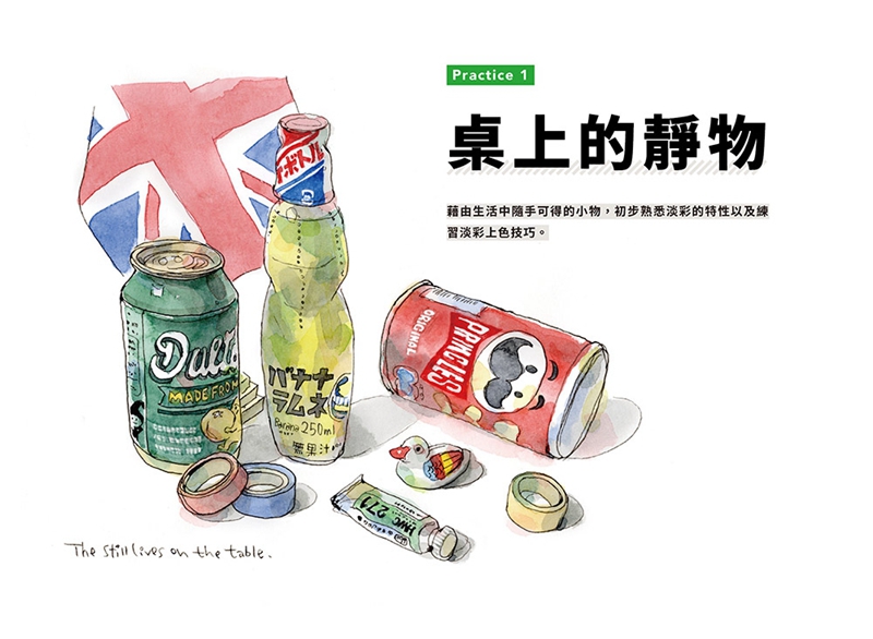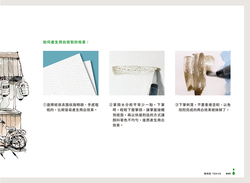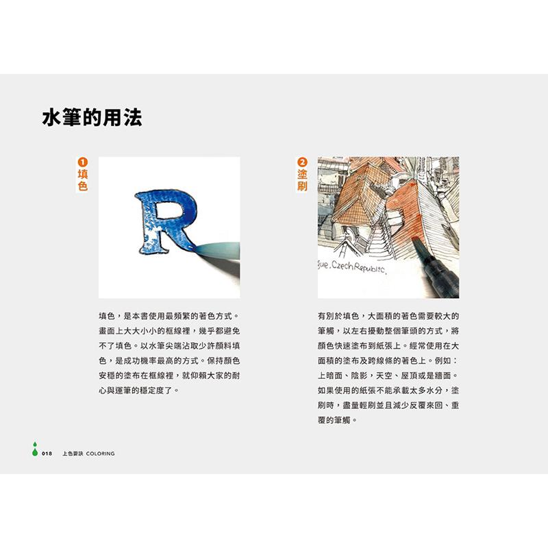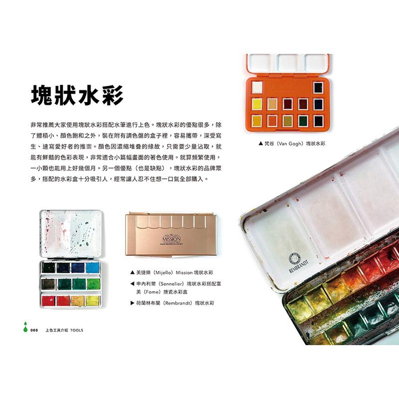 從不同水彩類型的挑選、基礎水筆的運用,書中都有詳細說明與建議。