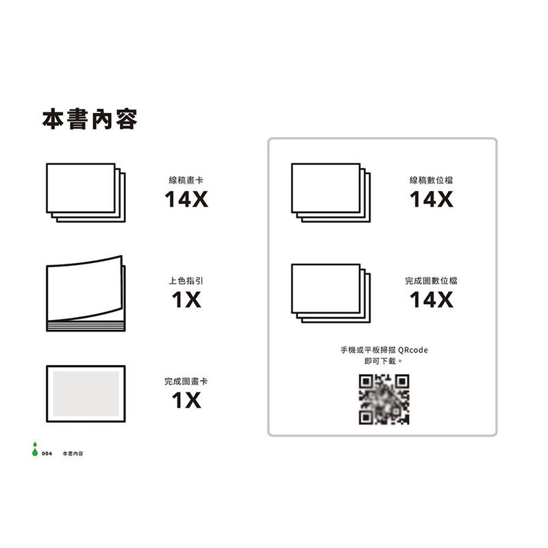 ‧隨書加贈的厚磅數線稿畫卡,方便練習上色,完成著色後可直接裱框收藏。