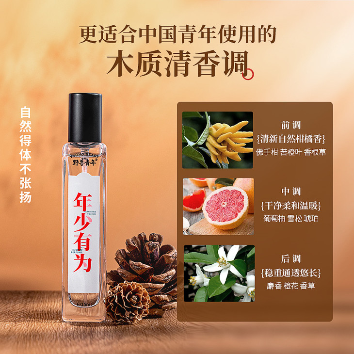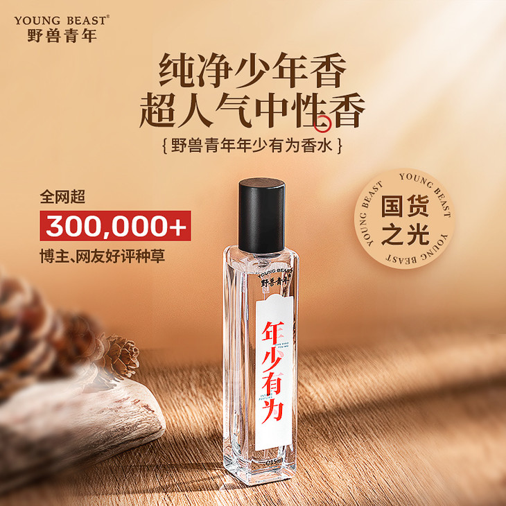 ① 王炸产品 :年少有为香水(木质香型)- 它是野兽青年出的纪念版香水·木质香调的贯穿,更适合中国青年使用的木质清香调,自然得体不张扬 像是穿上了“少年气”的白衬衫是年轻的味道。野兽青年真的懂少年心,愿你“年少有为”不自卑,懂得什么是珍贵。 前调:清新自然柑橘香 佛手柑 苦橙叶香根草 中调:千净柔和温暖 葡萄柚 雪松琥珀 后调:稳重通透悠长麝香 橙花香草