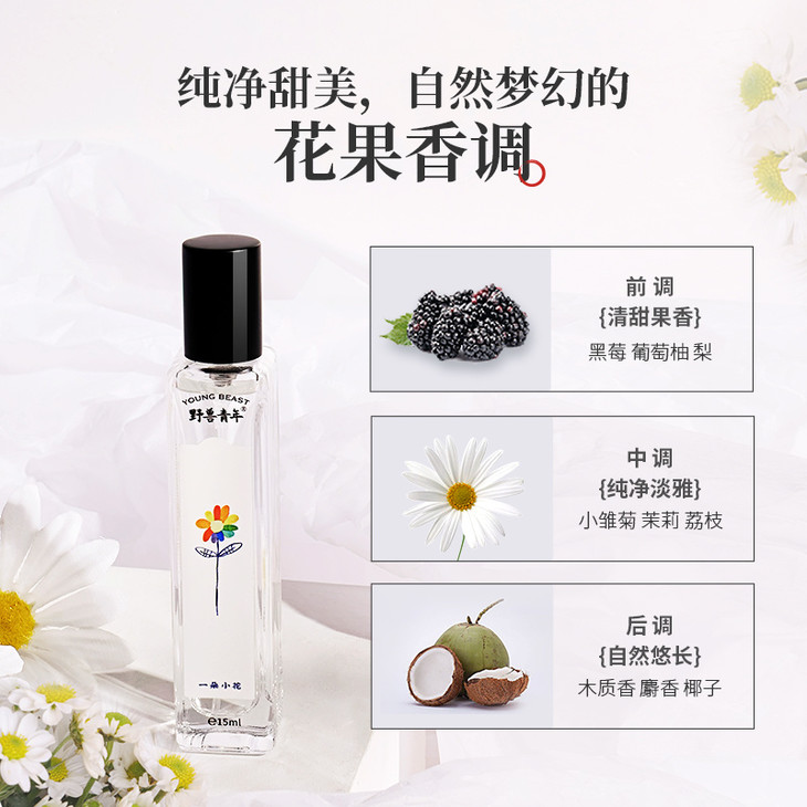 ⑦ 一朵小花 纯净甜美,自然梦幻的花果香调 前调 {清甜果香}黑莓 葡萄柚梨 中调{纯净淡雅}小雏菊 茉莉 荔枝 后调 {自然悠长} 木质香麝香椰子