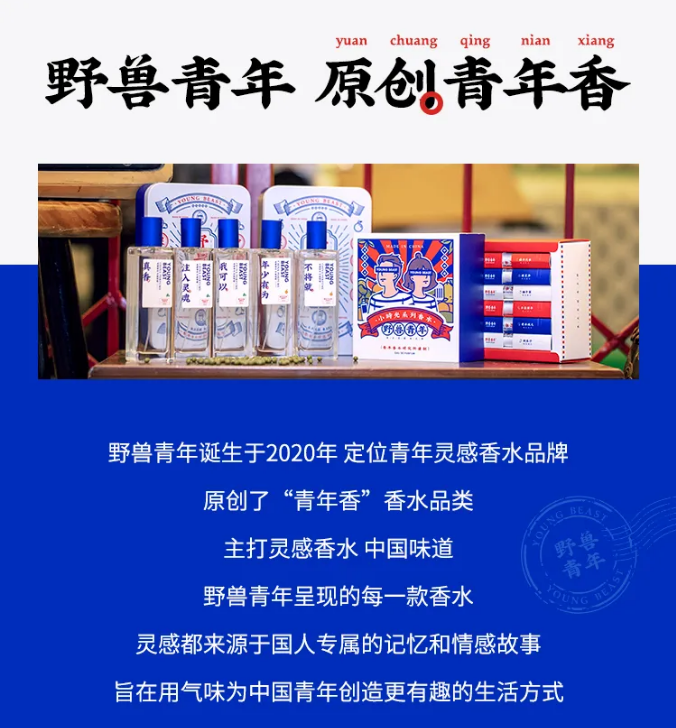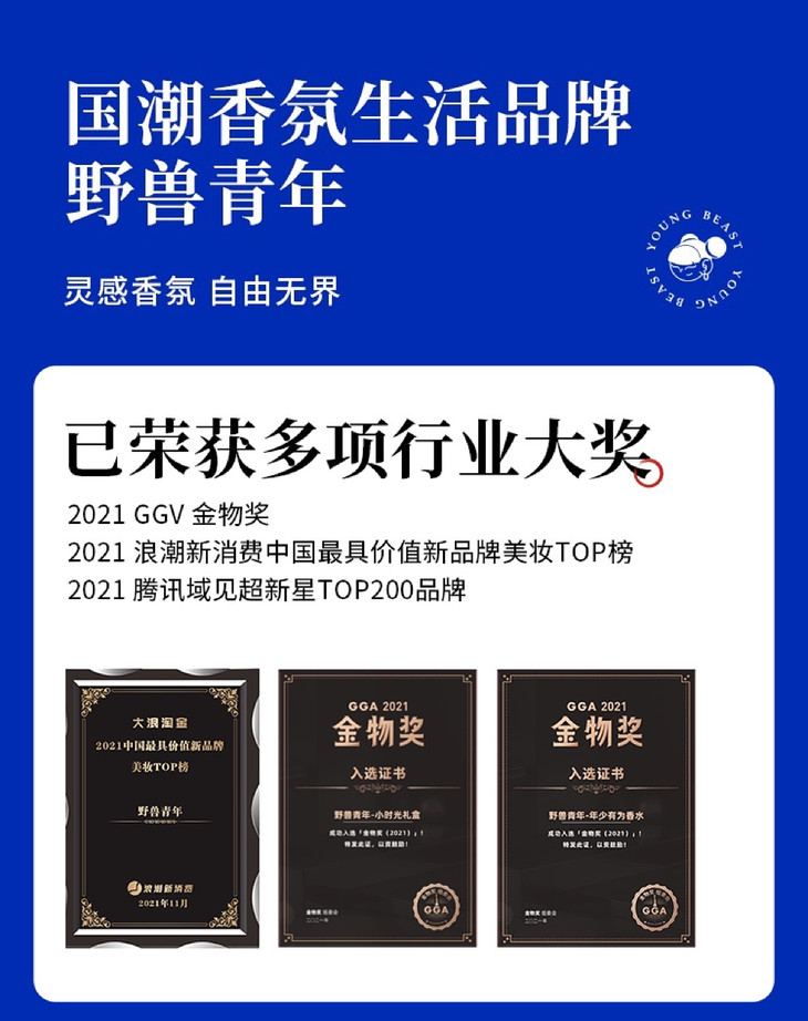 荣获国内多项行业大奖!妥妥的香氛届的潜力股!为了独宠中国消费者,打造出能够引发身份认同的香水产品,野兽青年另辟蹊径,以特有的“灵感味道”和新国潮设计,推出了原创“青年香”品类。