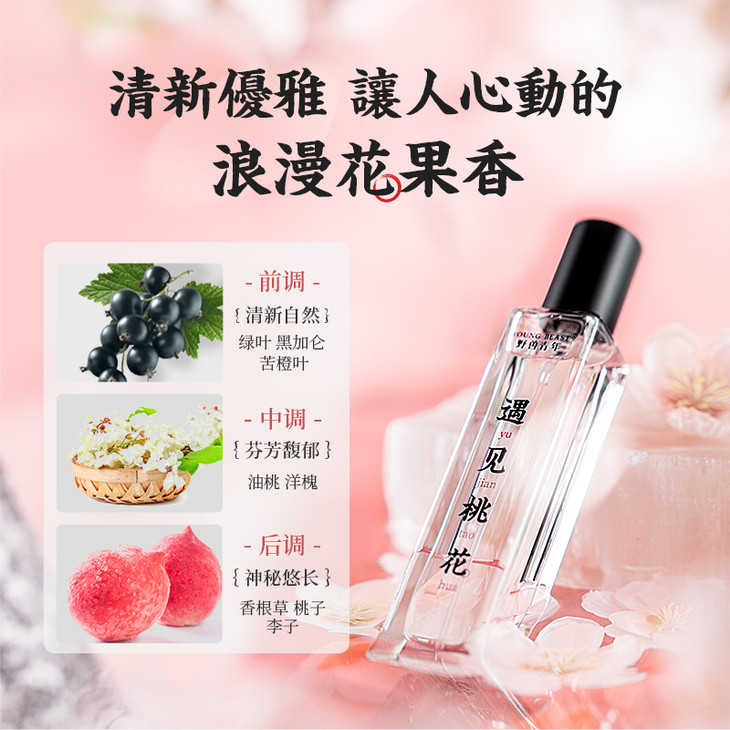 ② 遇见桃花香水(甜美桃花香) 花果香调 前调:绿叶 黑加仑 苦橙叶 中调:油桃 洋槐 后调:香根草 桃子 李子