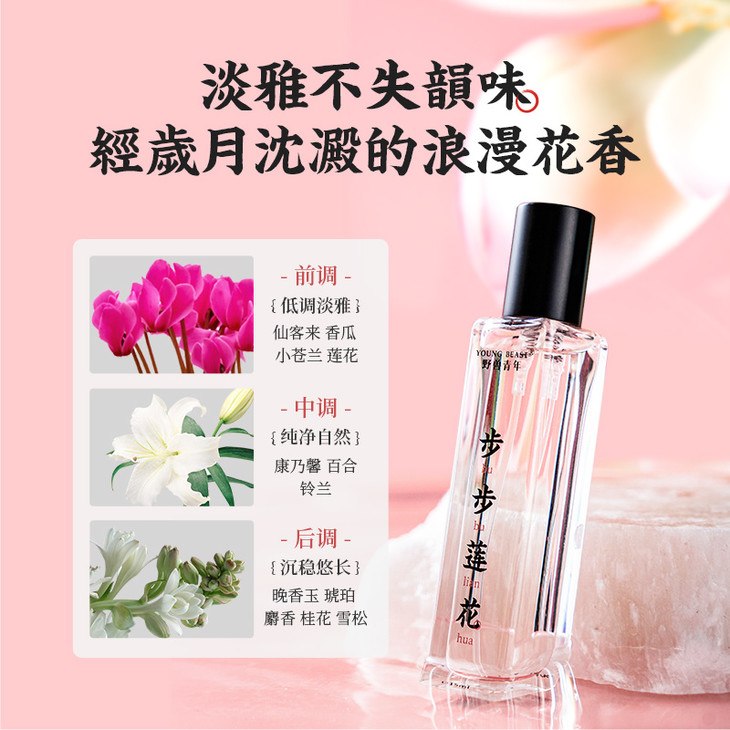 ④ 步步莲花香水(淡雅莲花香) 水生花香调 前调:仙客来 香瓜 小苍兰 莲花 中调:康乃馨 百合 铃兰 后调:晚香玉 琥珀 麝香 桂花 雪松