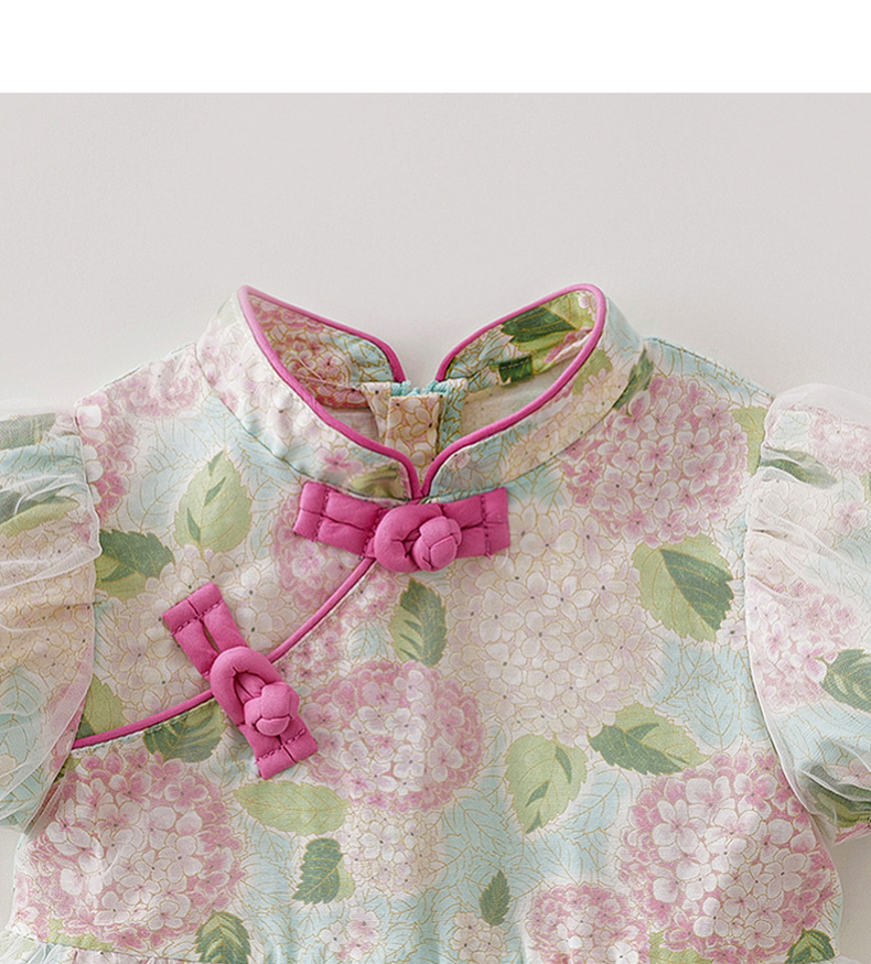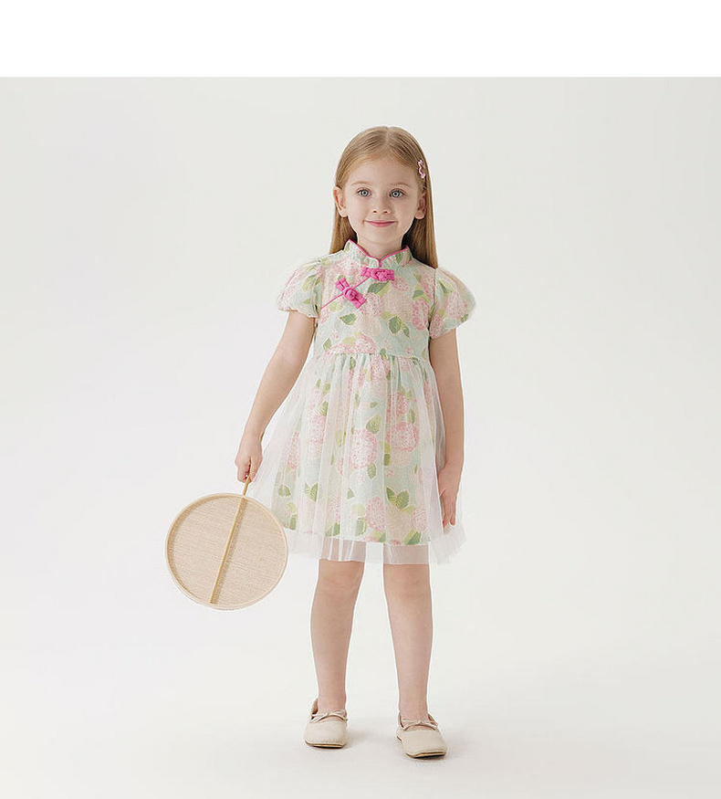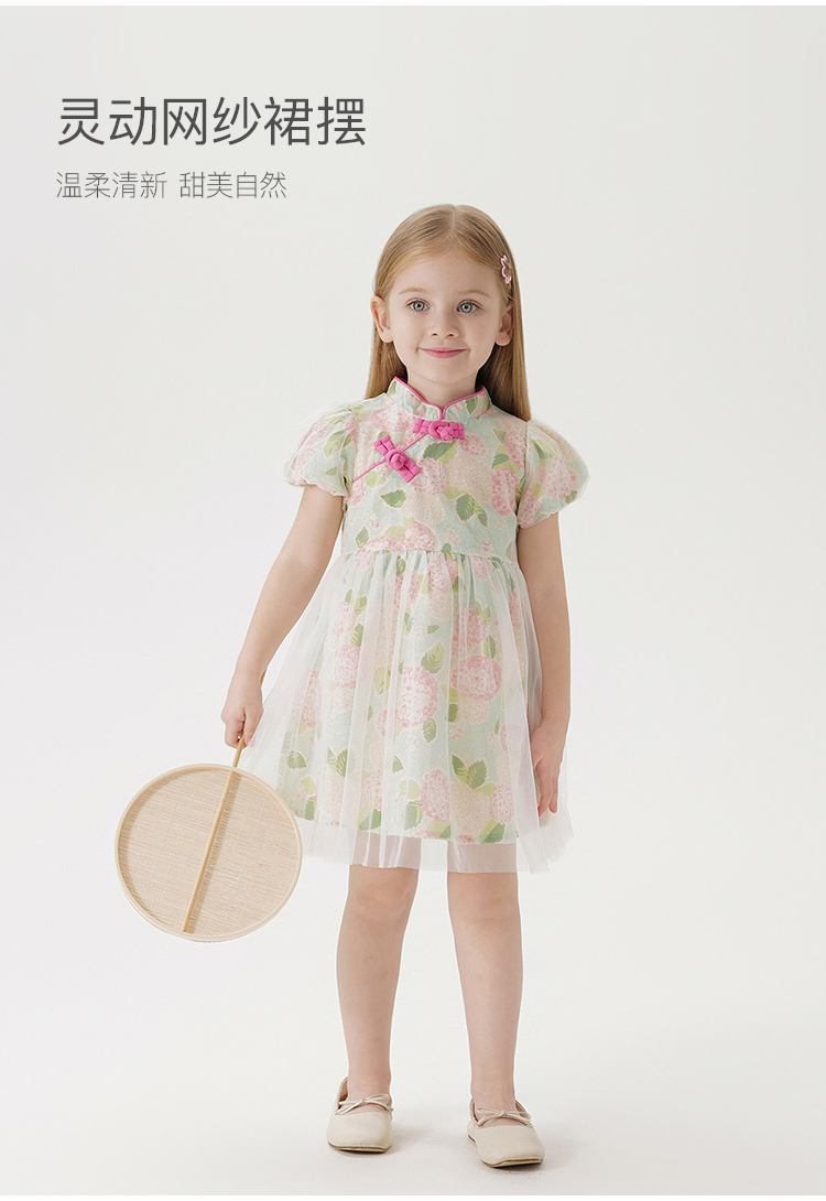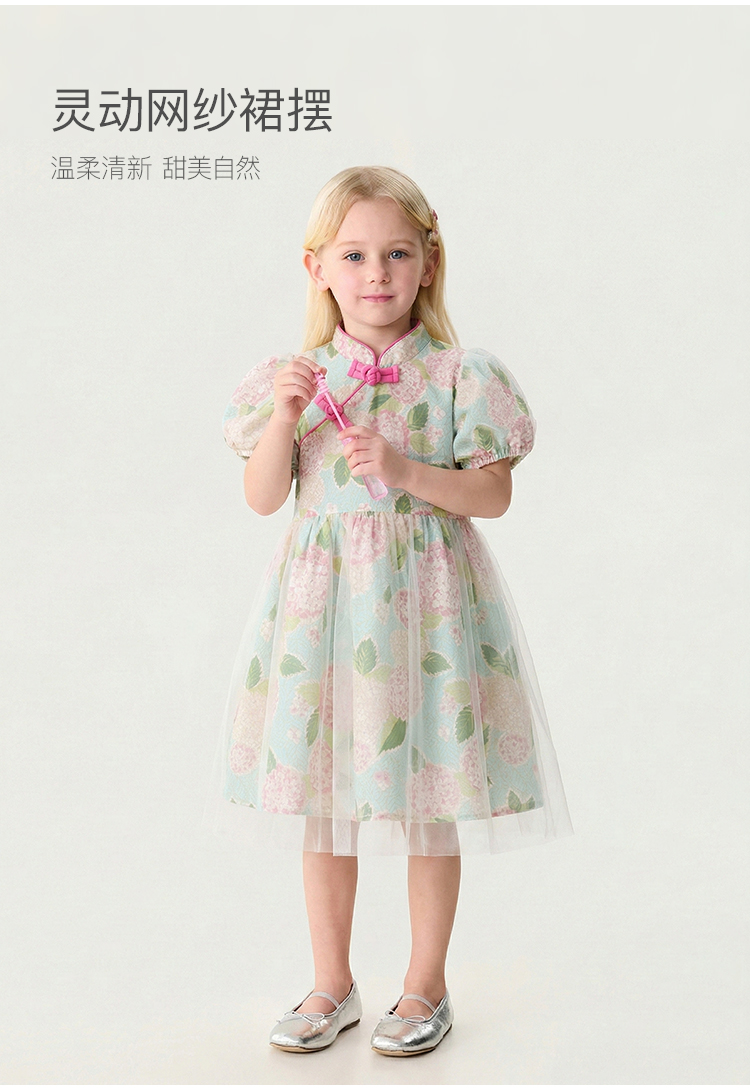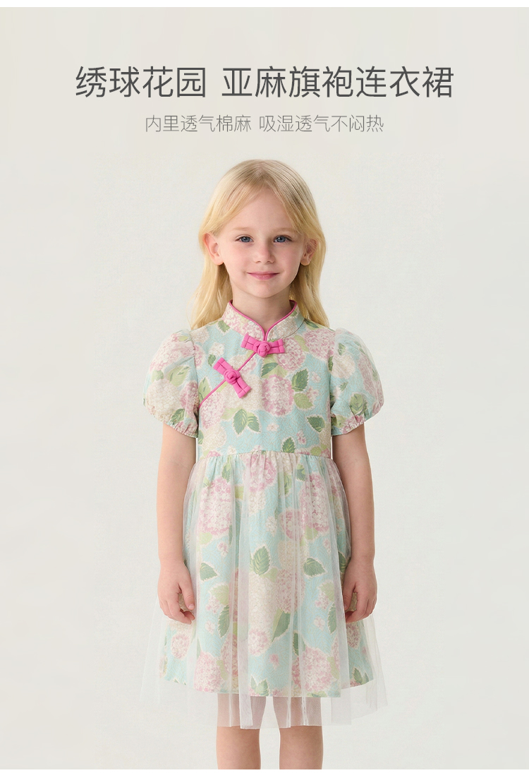 马克珍妮绣球花园女童亚麻旗袍连衣裙2026年夏装新款561029