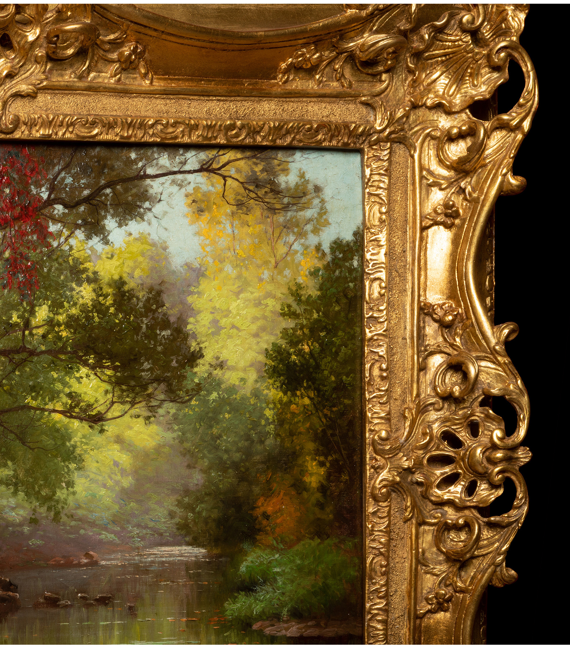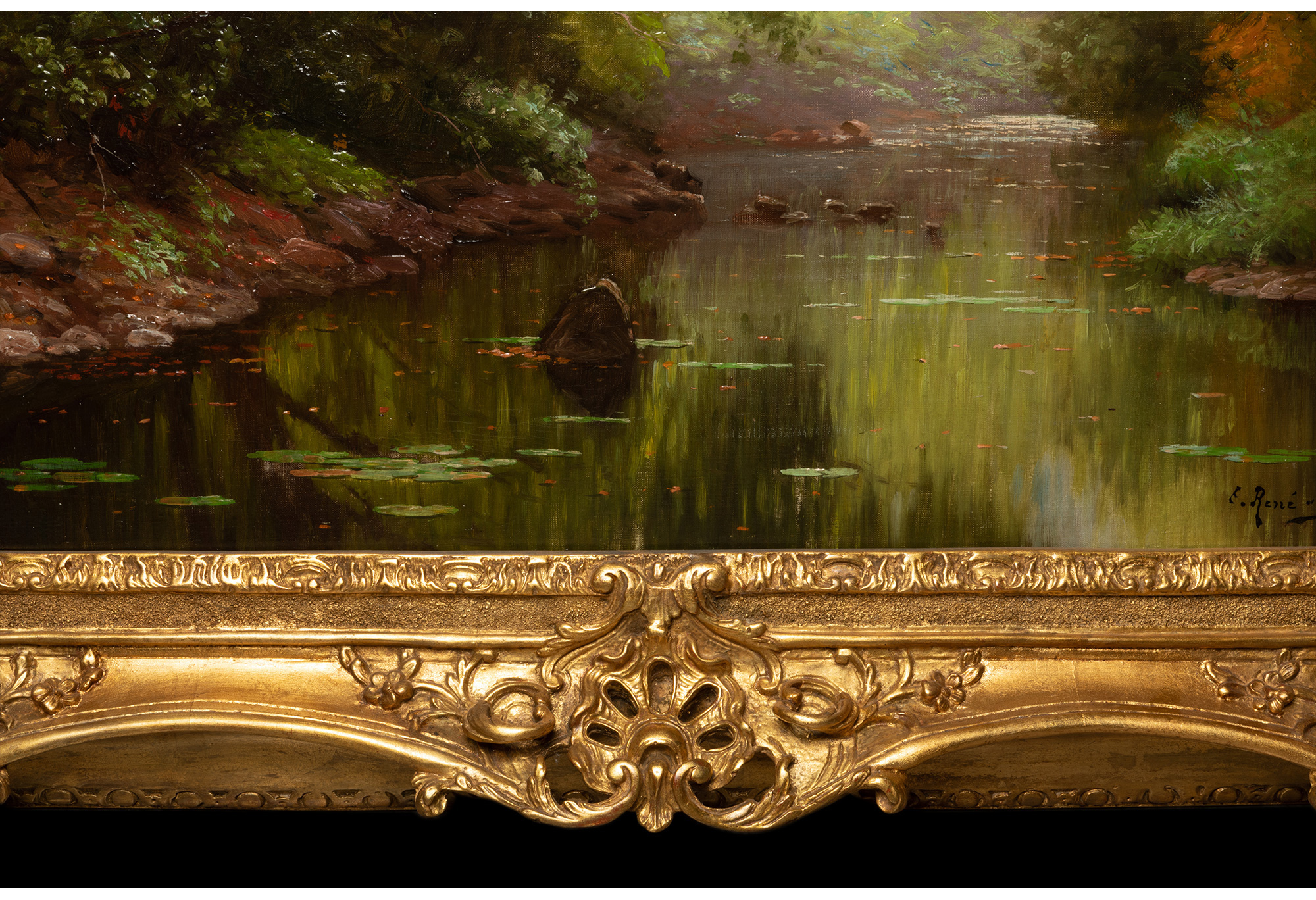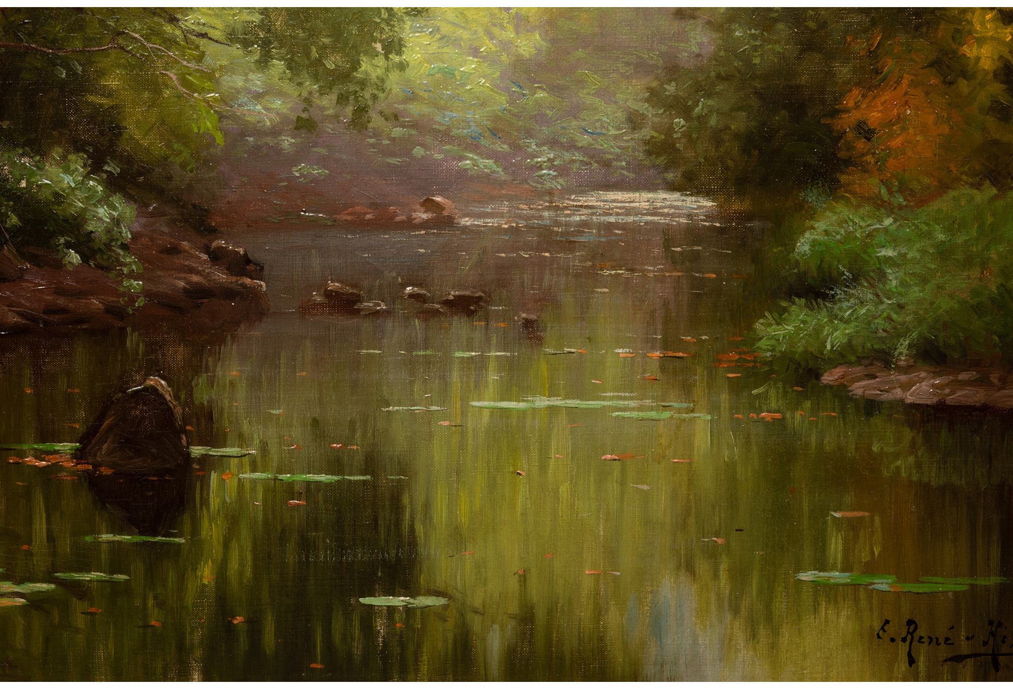 独角鹿西洋古董法国画家E. René-His签名布面油画《秋林碧水》