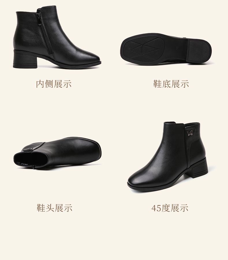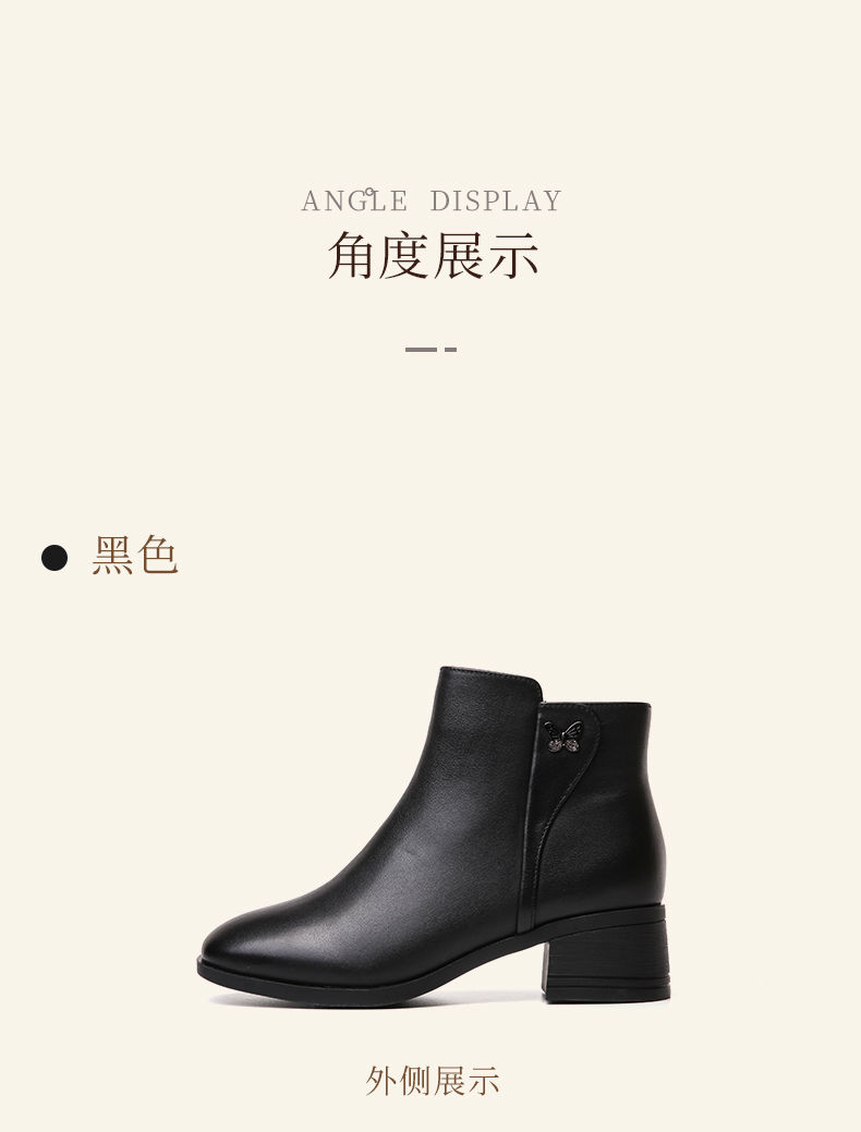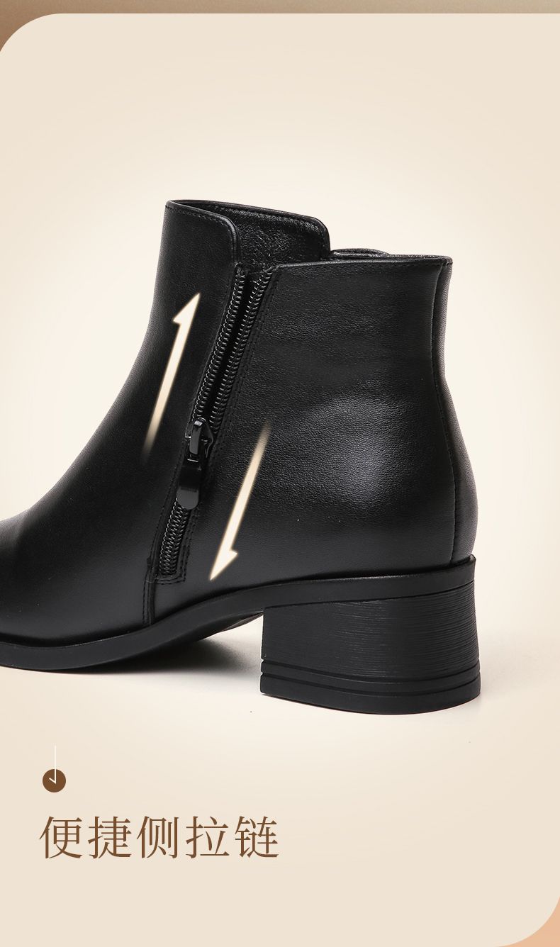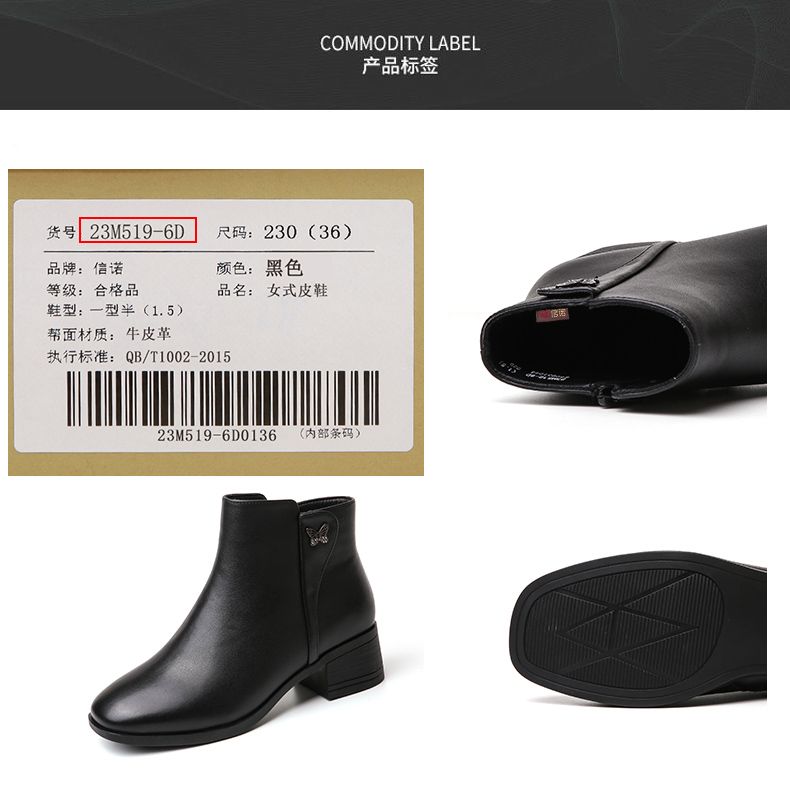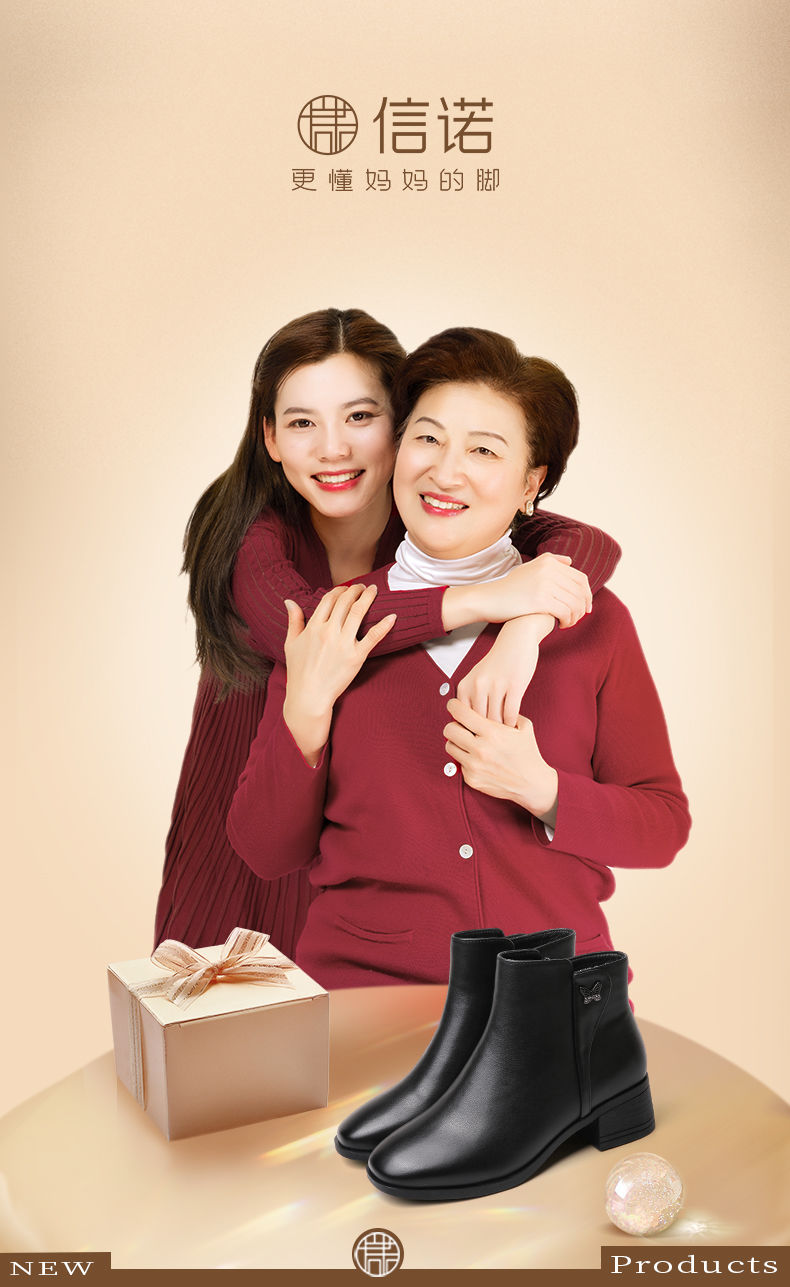 信诺真皮舒适短靴2023新款秋冬季中年粗跟妈妈鞋软底加绒女士皮鞋23M519-6D