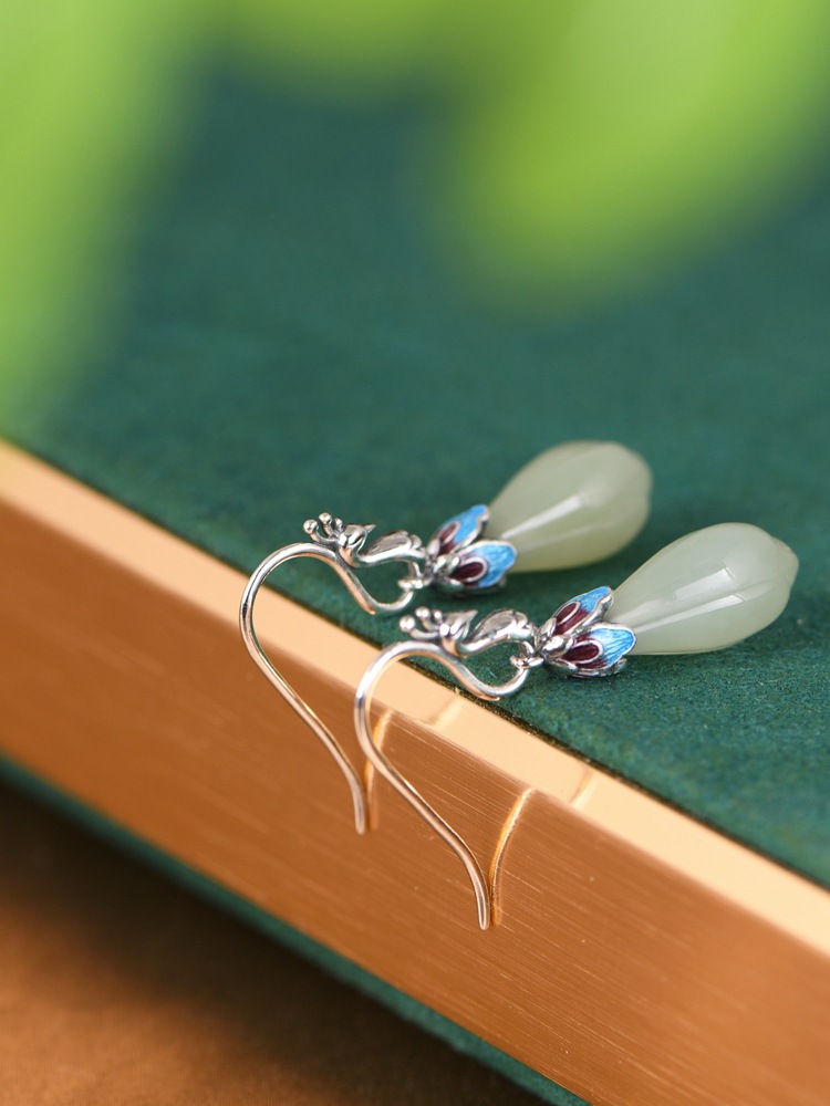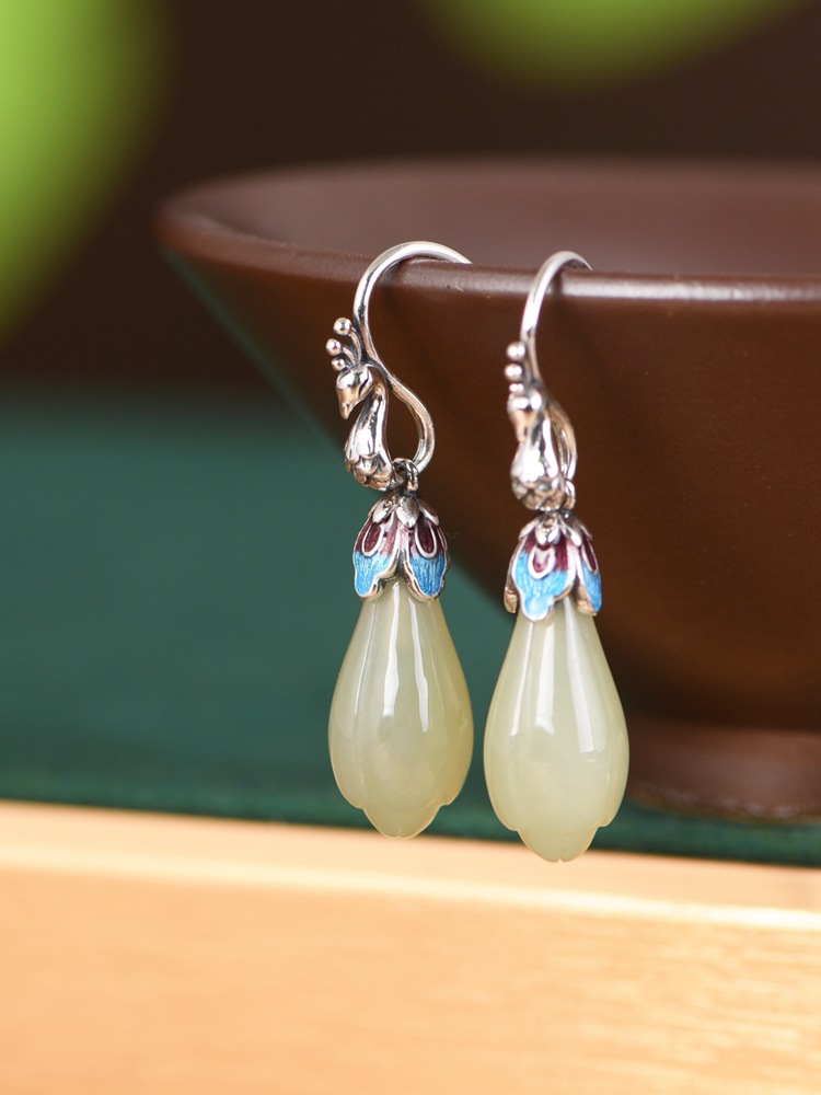 【幽兰雀舞】S925银珐琅复古国潮风和田玉兰花孔雀耳钩【SCH-TRS31279】