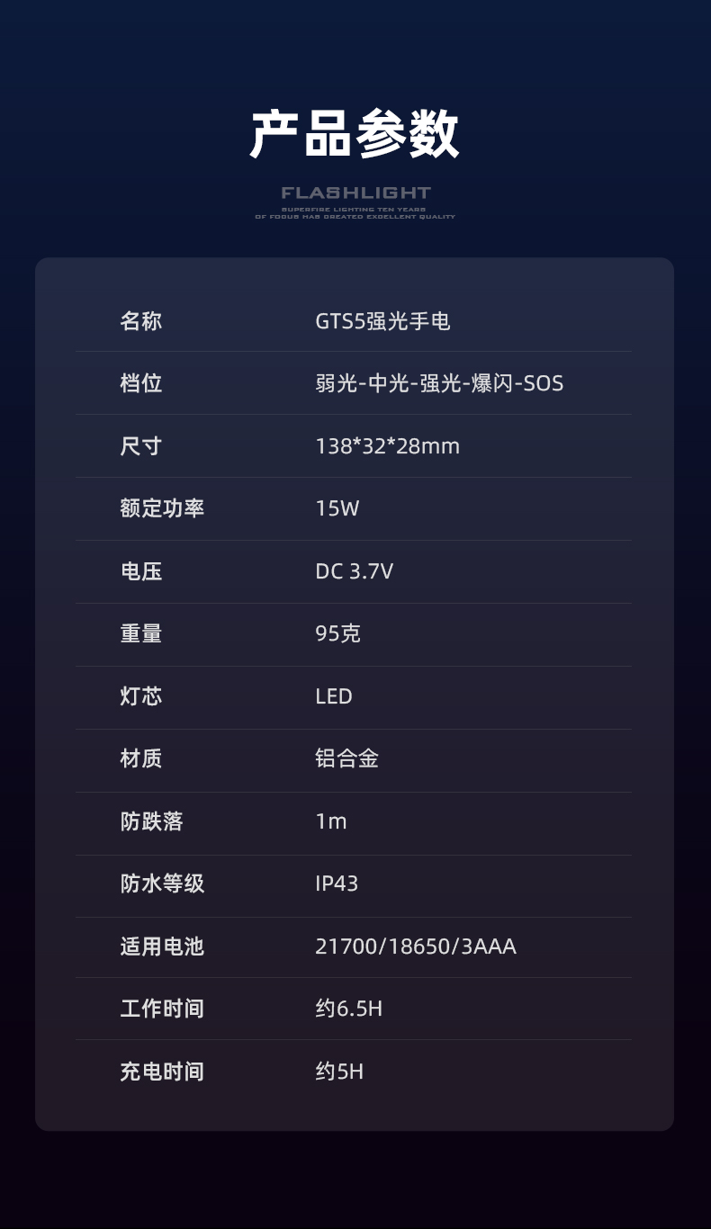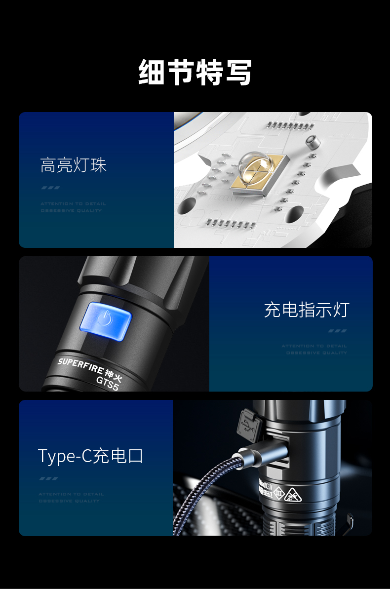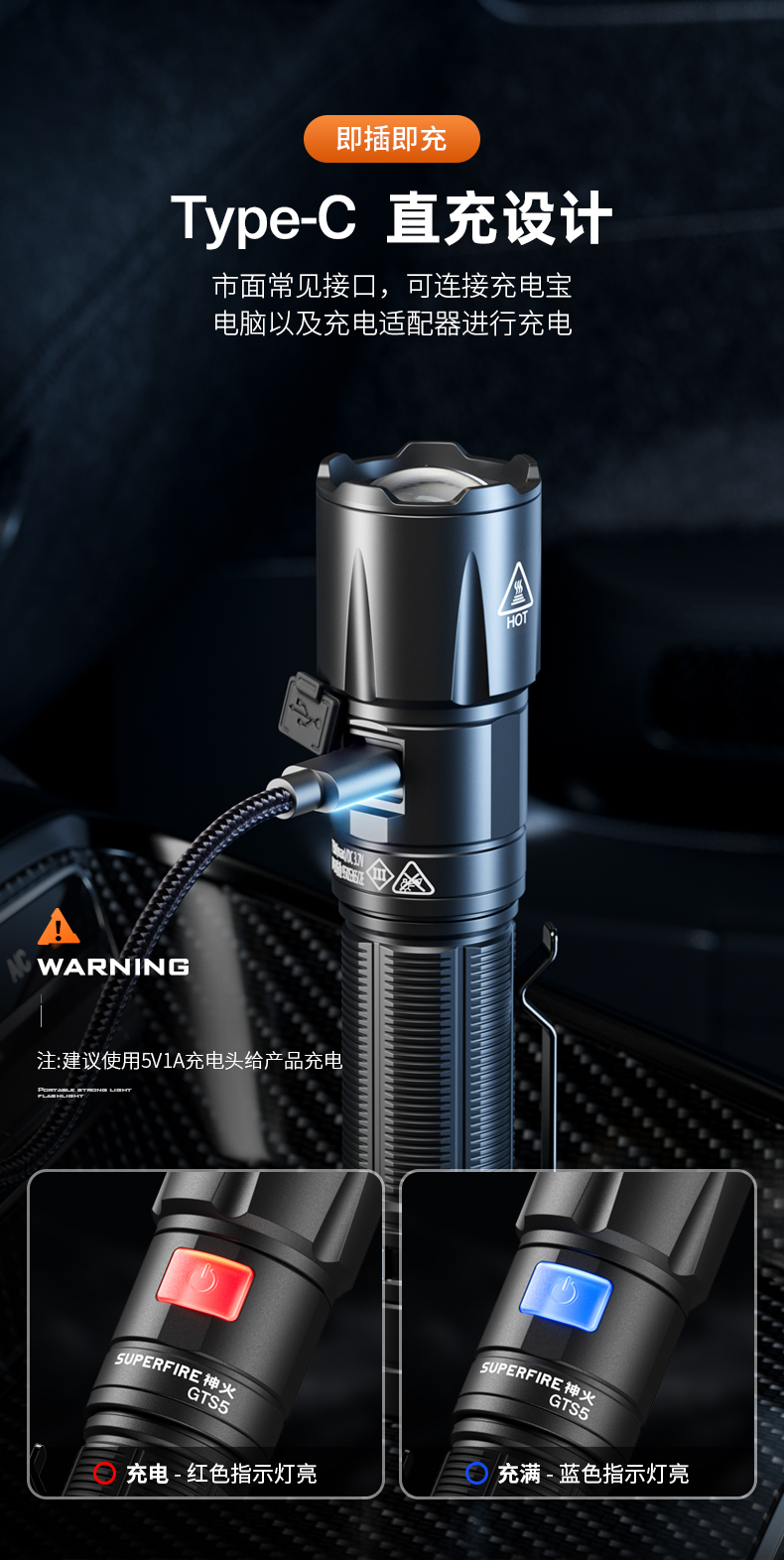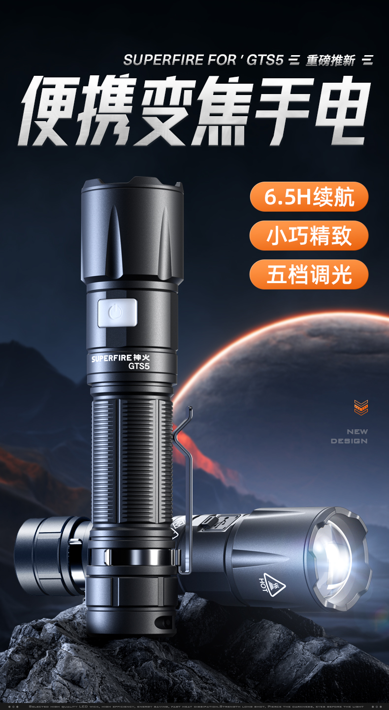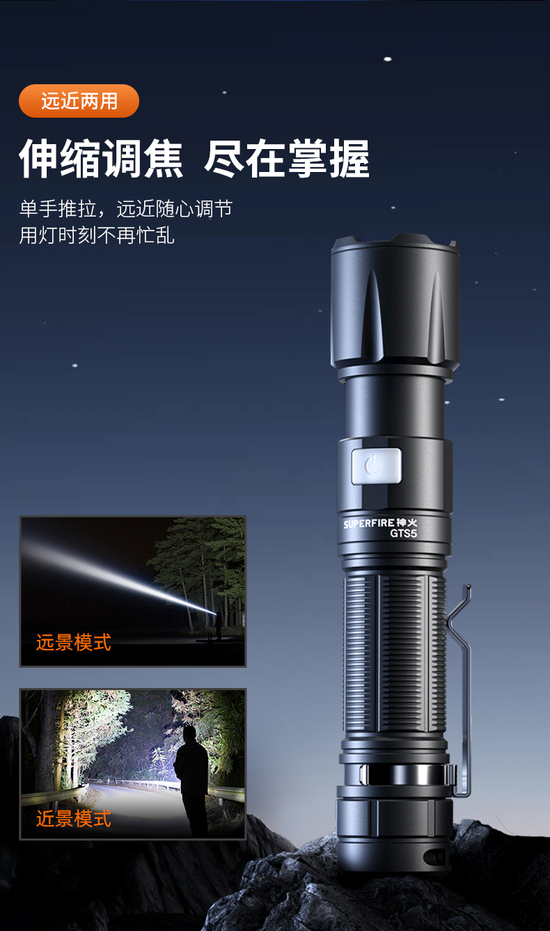 神火GTS6强光手电筒超亮远射小型便携家用应急可充电户外照明登山
