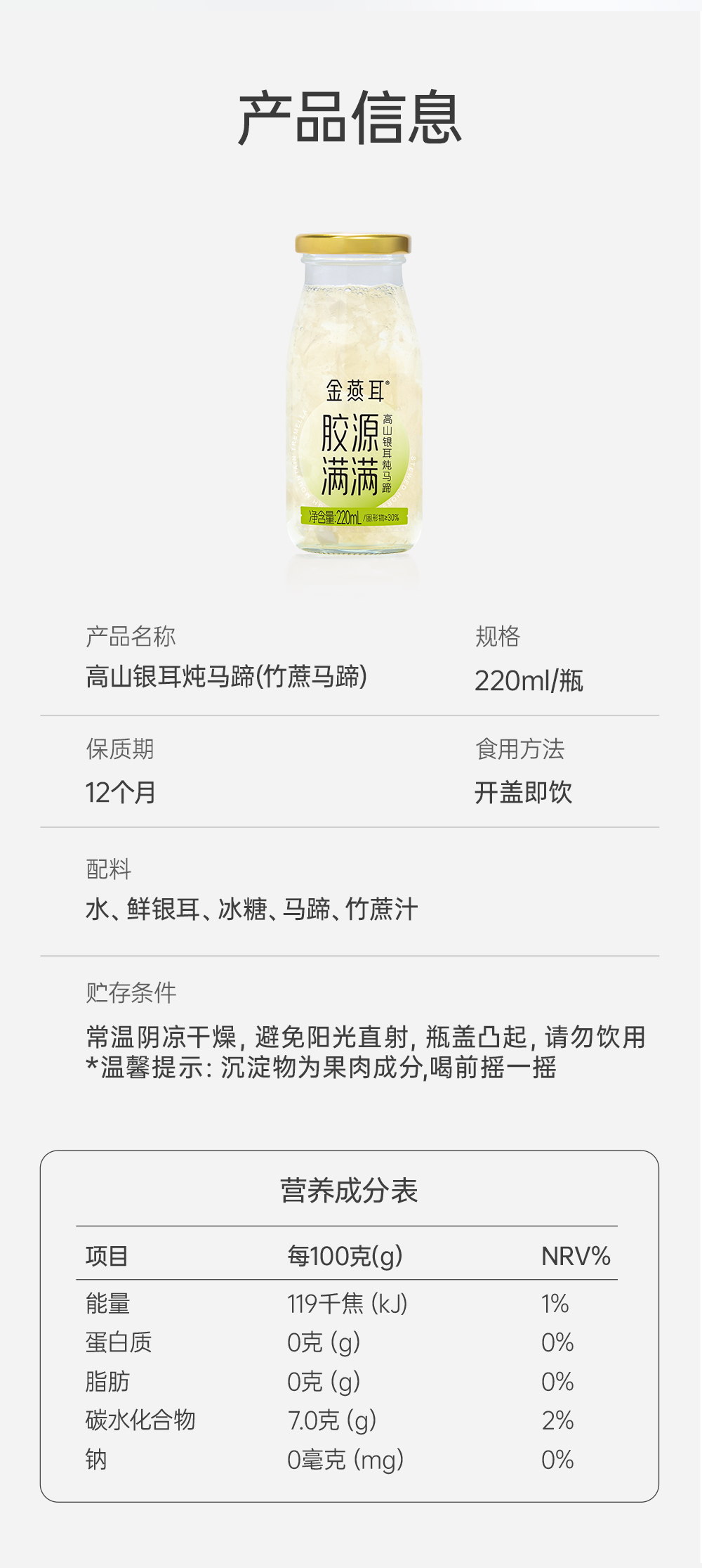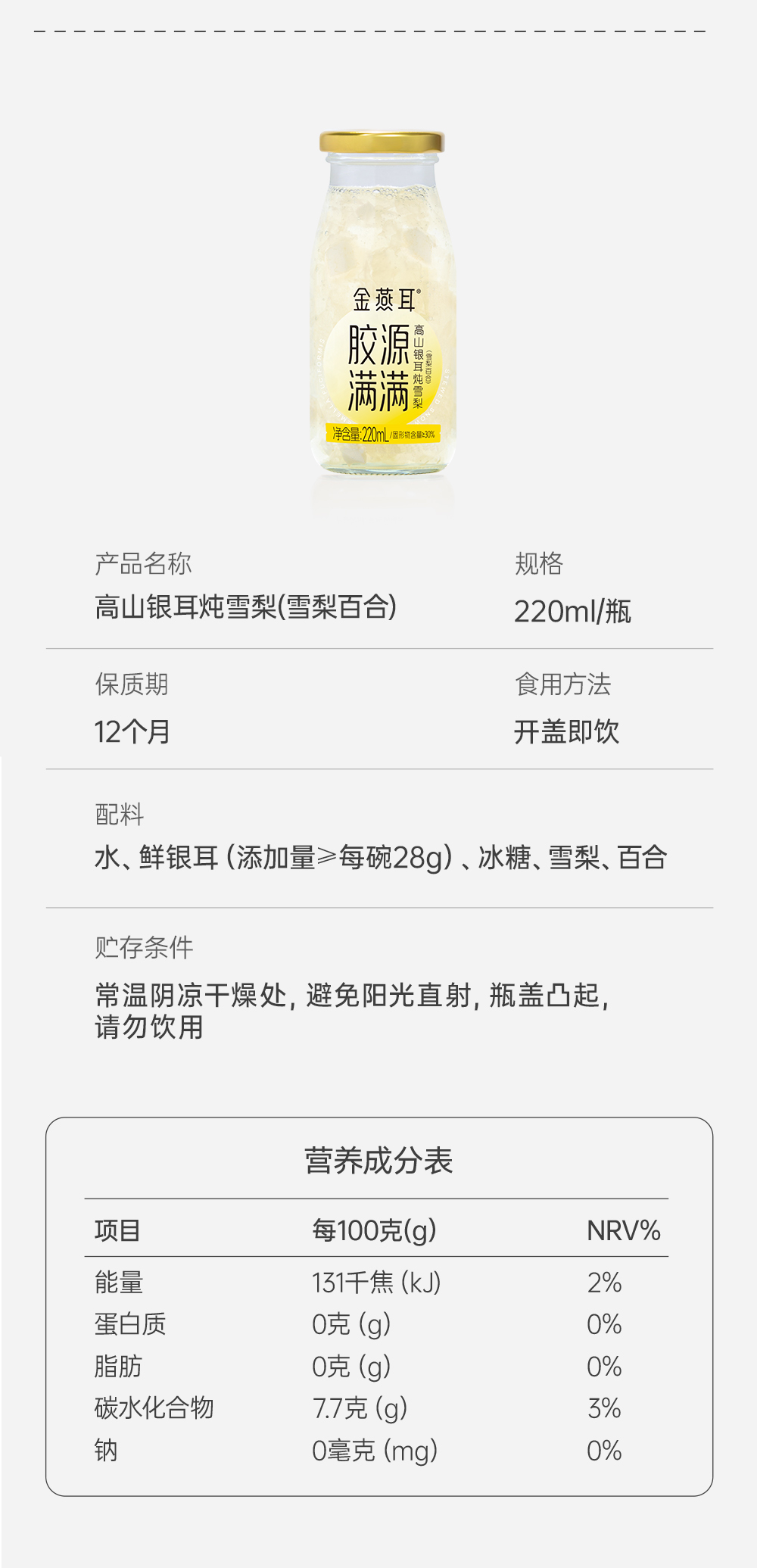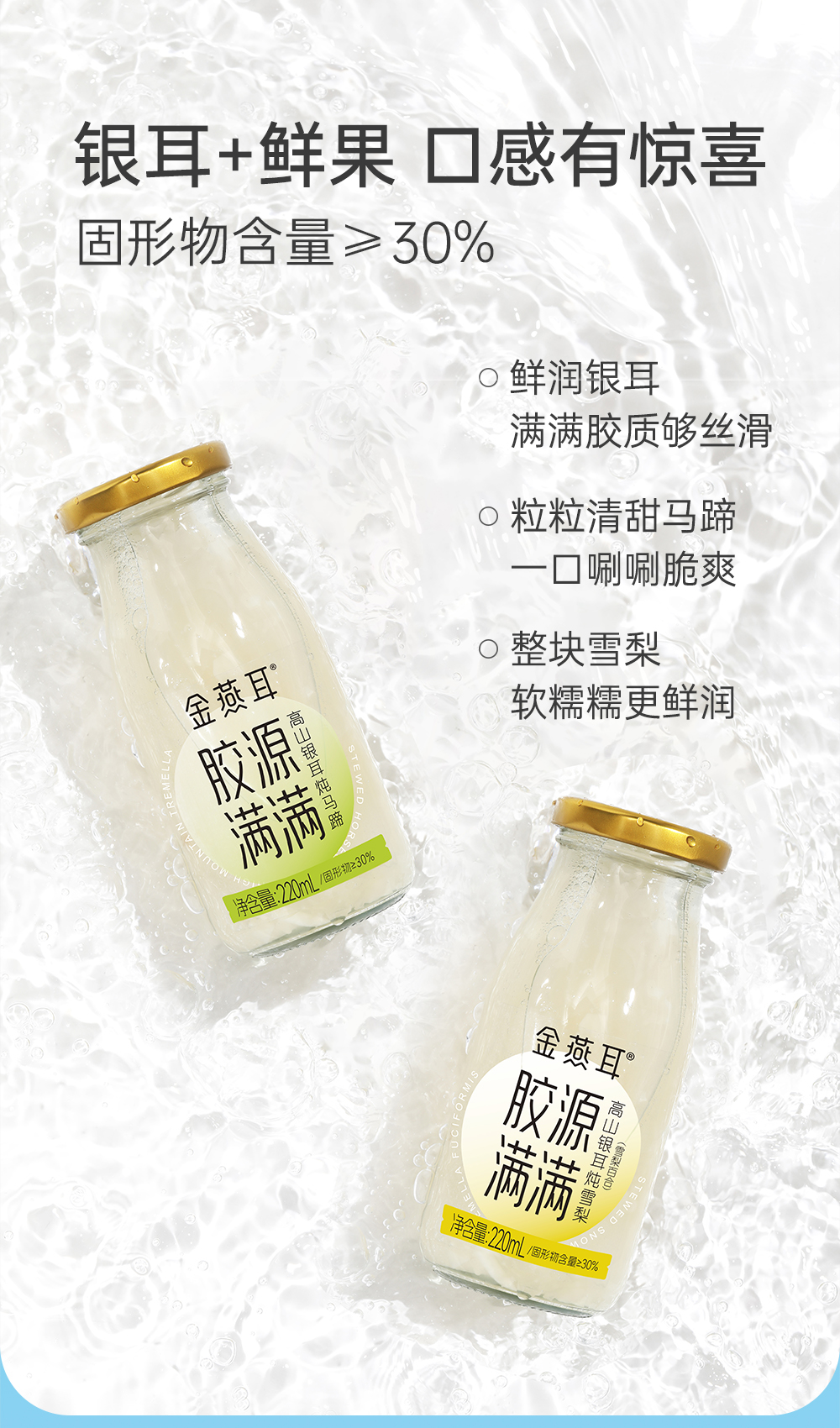金燕耳高山银耳炖竹蔗马蹄/雪梨百合鲜露 有机鲜炖银耳 开盖即食 一箱6瓶装(220ml/瓶)代餐饱腹银耳羹 (每箱单独快递,拍两件以上的仙女不要漏拿快递啦)