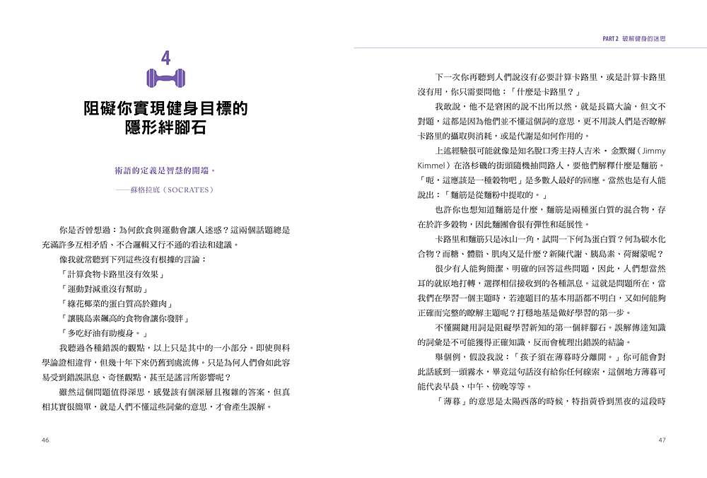 可依書中提供的體脂標準,檢視自己需減脂或增肌,再選擇適合自己現況的飲食菜單。並破除市面上常見錯誤訊息,比如一定要維持「乾淨飲食」、必須吃營養品等健身飲食迷思,建立*久正確飲食思維。