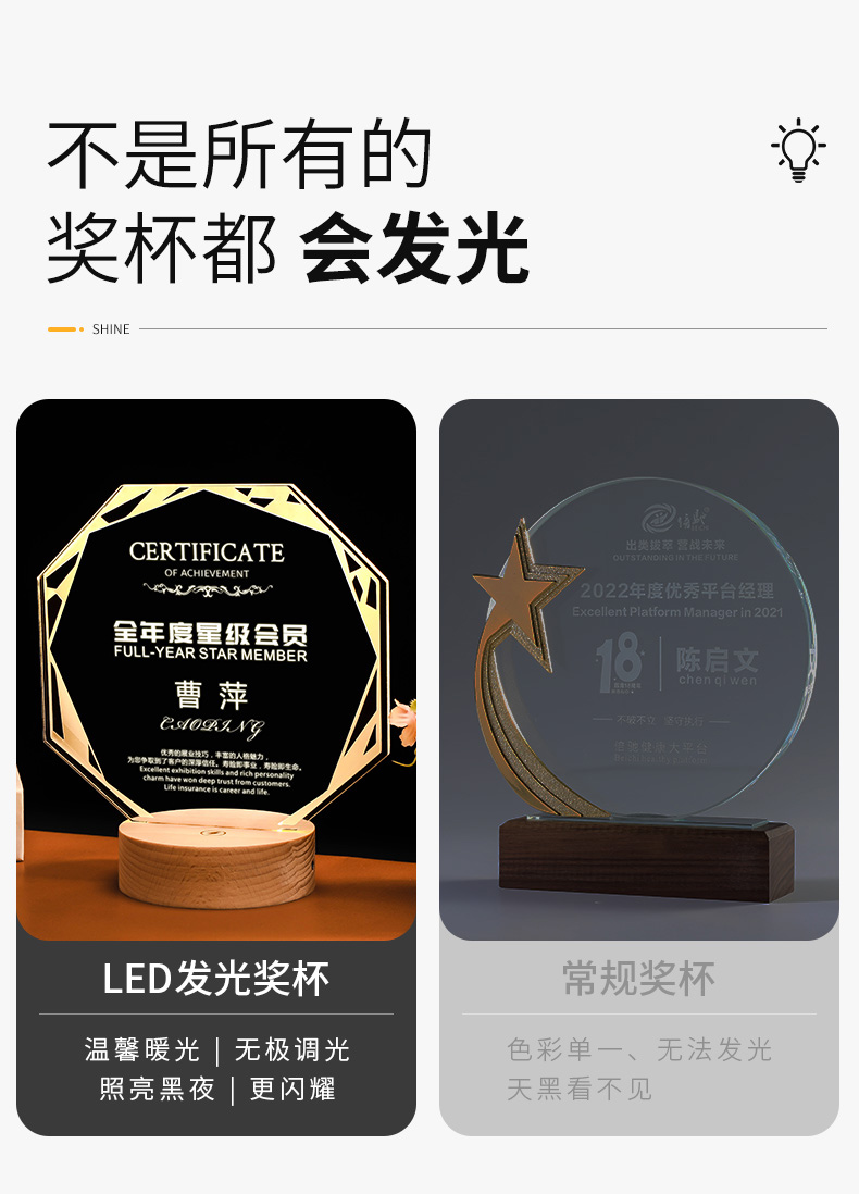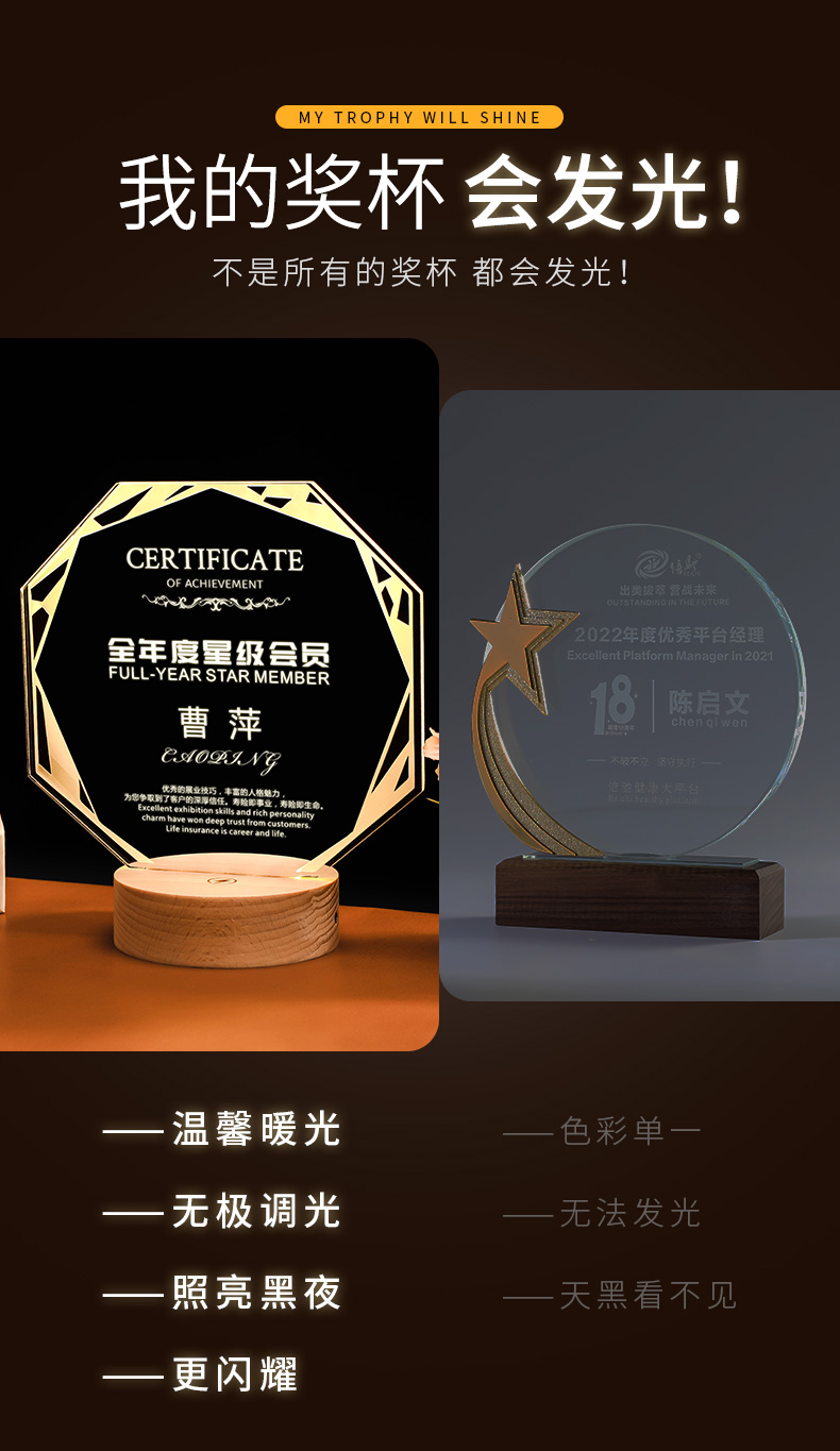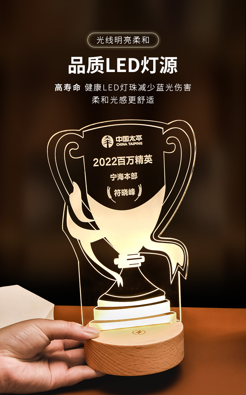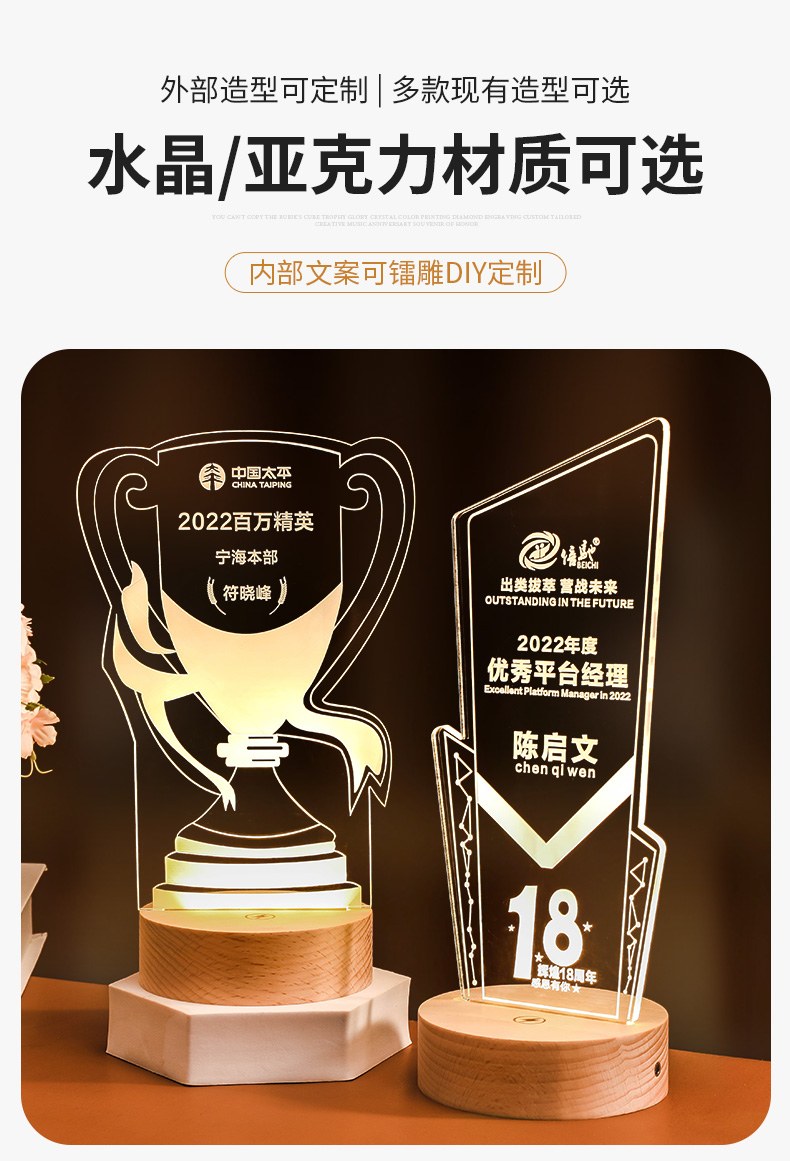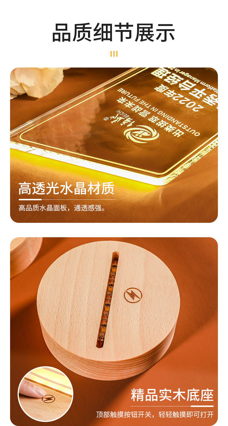 发光实木底座水晶奖杯定制定做奖牌亚克力LED员工纪念礼品小夜灯