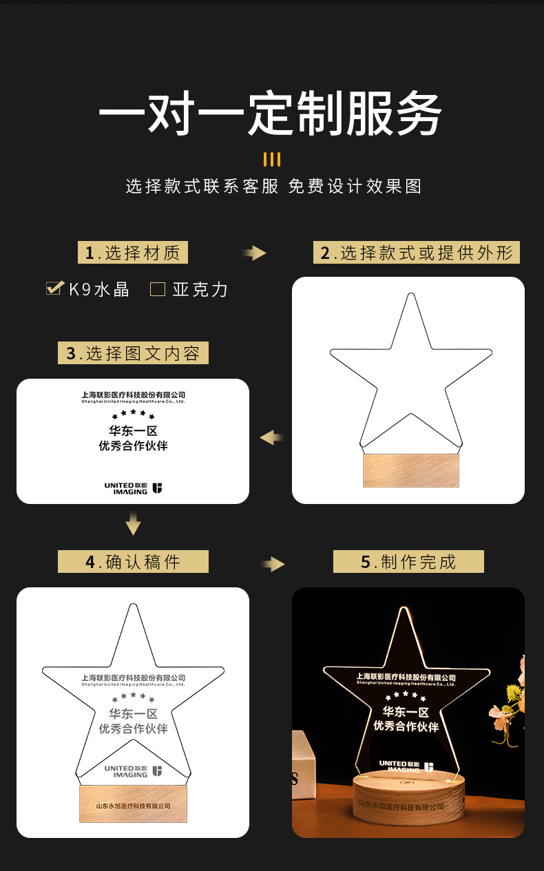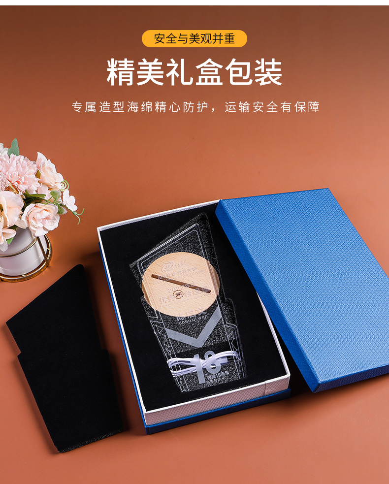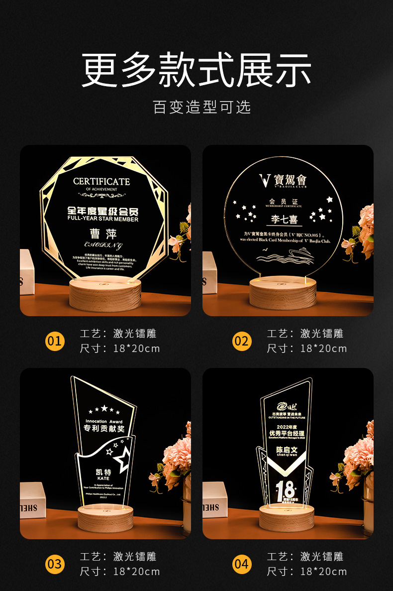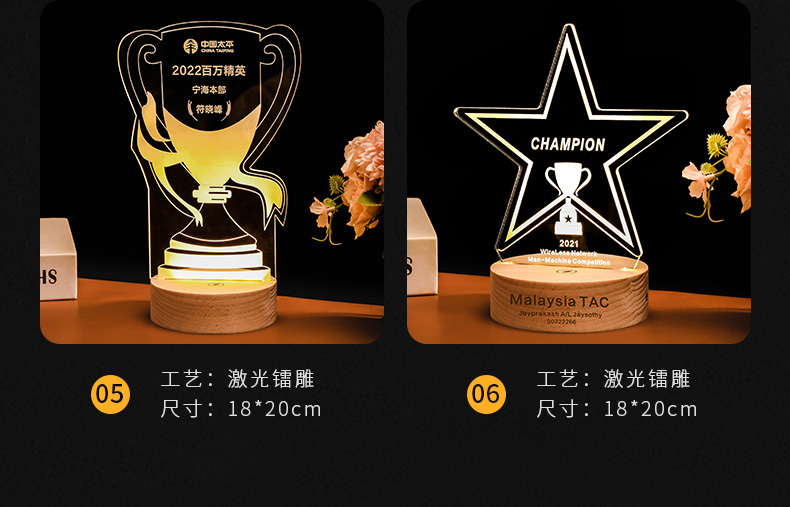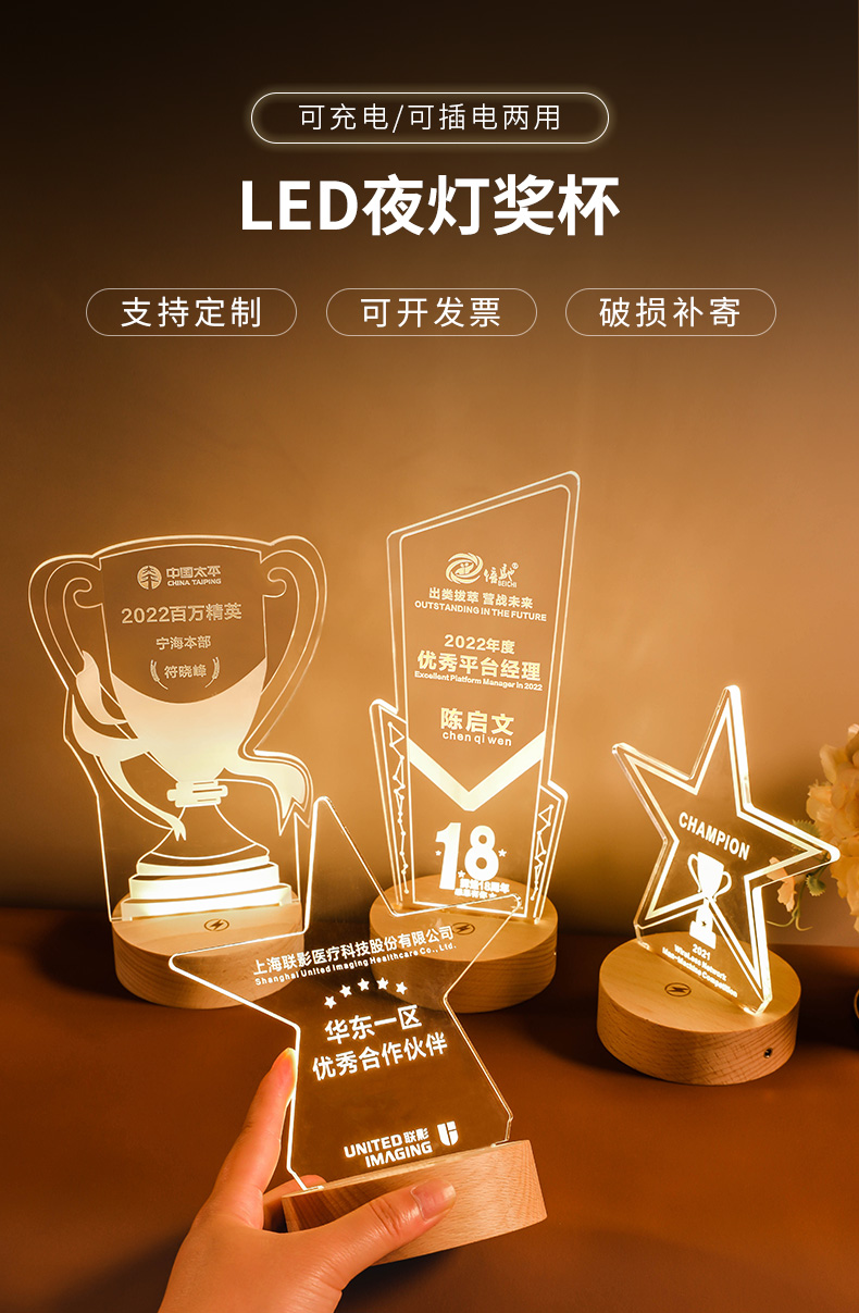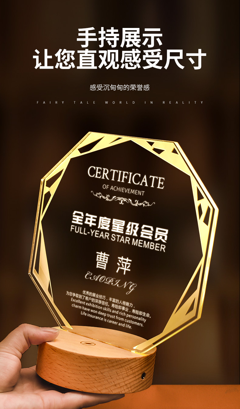 发光实木底座水晶奖杯定制定做奖牌亚克力LED员工纪念礼品小夜灯