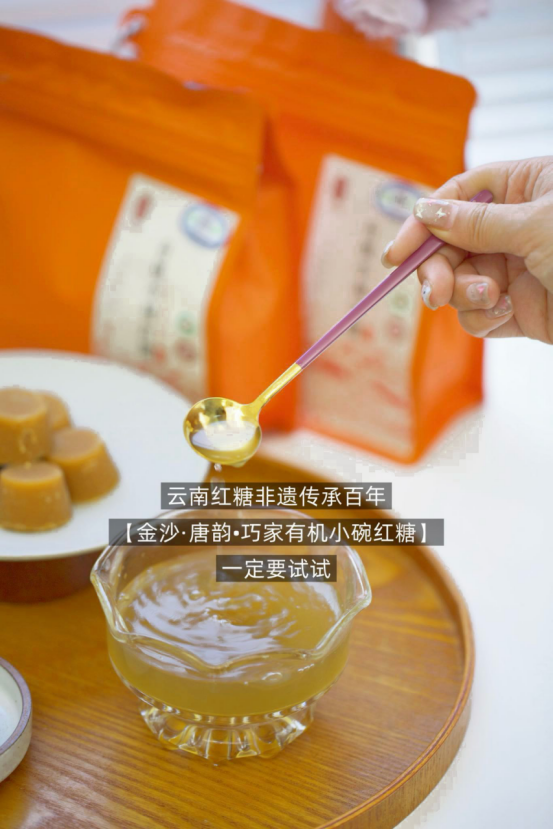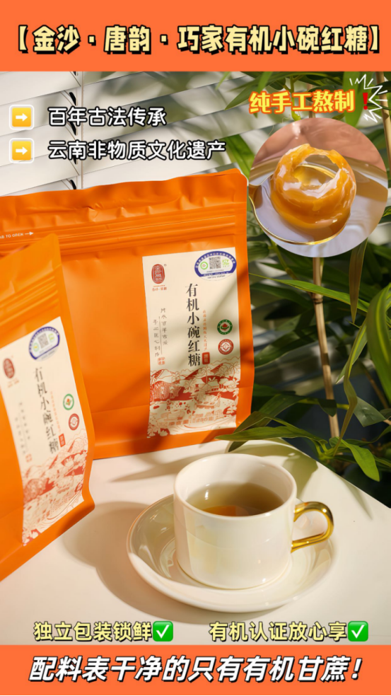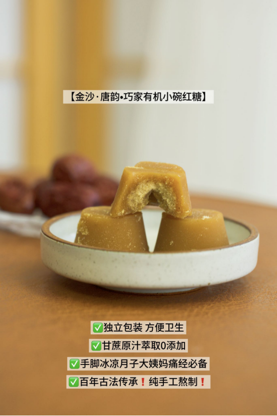 【金沙·唐韵•巧家有机小碗红糖】 配料表只有有机甘蔗 纯手工制糖,不添加任何化学助剂 益气养血、暖胃散寒 这样纯粹的红糖哪个女孩子不爱! 一到冬天身子就开启冬眠模式, 手脚冰凉,很怕冷, 或者是每个月的那几天痛不欲生, 平时工作上有气无力,总觉得疲惫劳累的小仙女 你真的很需要一块古法红糖!