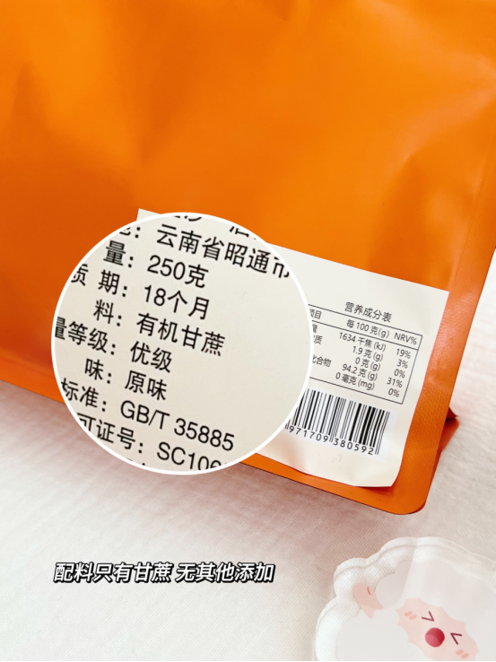配料纯净,唯有甘蔗 巧家小碗红配料表极为纯粹,只有有机甘蔗。 拒绝任何添加剂、防腐剂完整保留甘蔗天然营养与风味。 入口瞬间浓郁蔗香在舌尖散开 带来自然纯粹的甜蜜体验❗