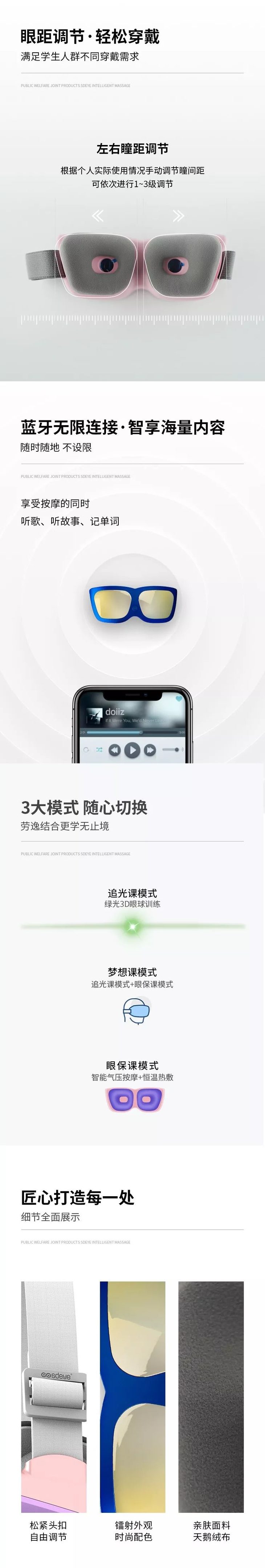 视多爱学生智能眼部按摩仪是多自在旗下 2019 年 6 月隆重推出的新品,历时 1 年精心打造,专为学生群体习惯设计,已顺利通过多项权威资质检测。