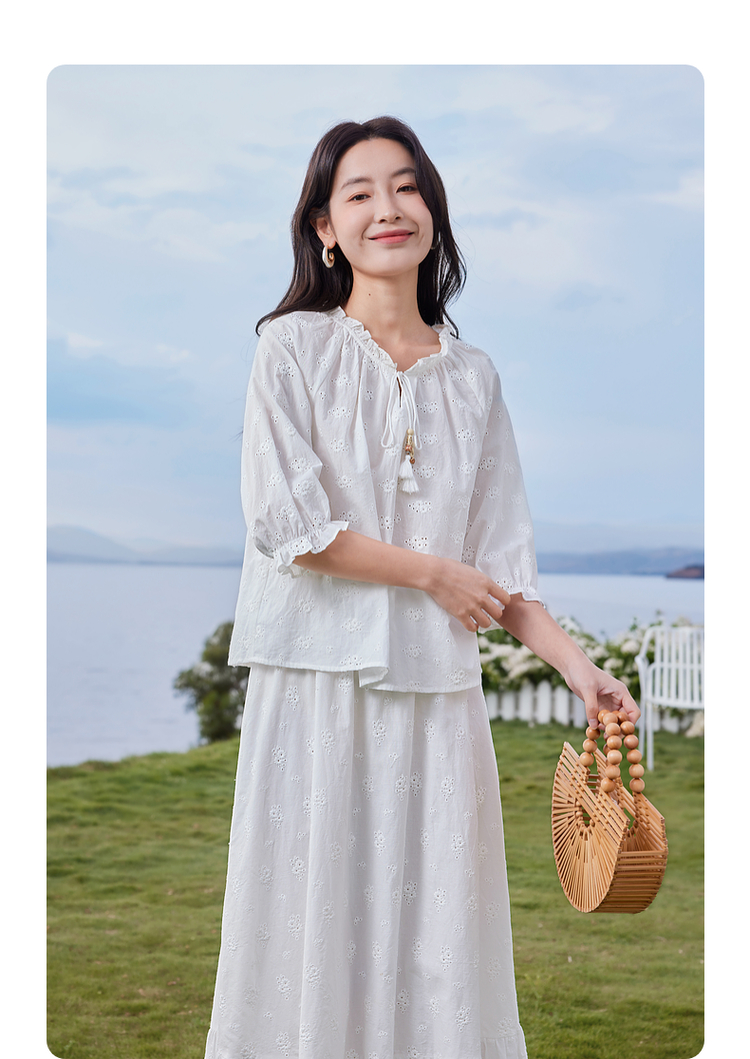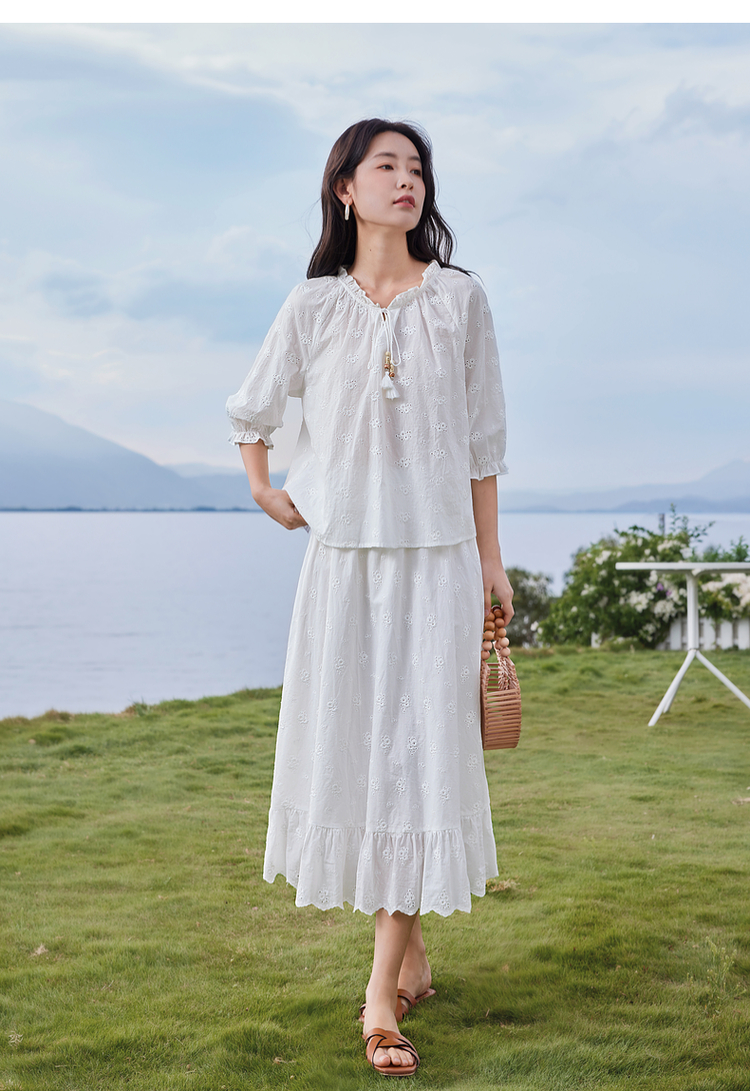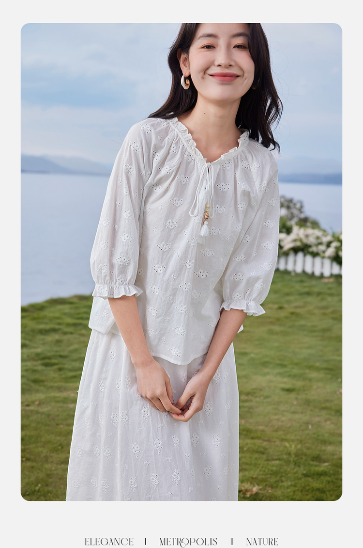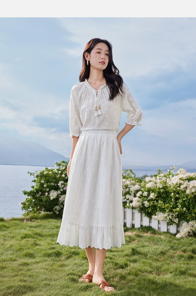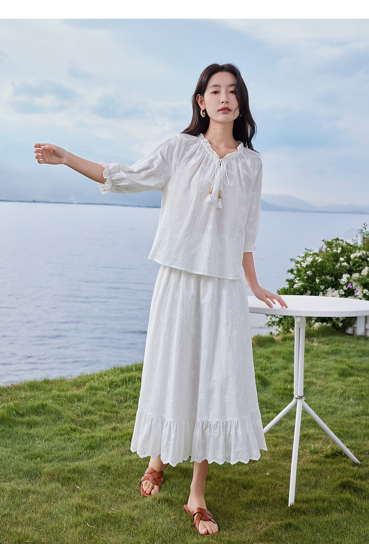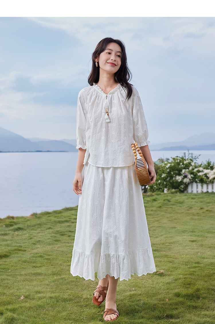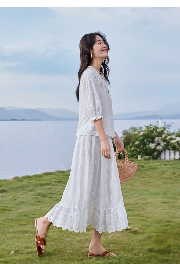 【专属特价】熙世界夏季套装2025新款法式木耳边绣花白色衬衫半身裙子两件套