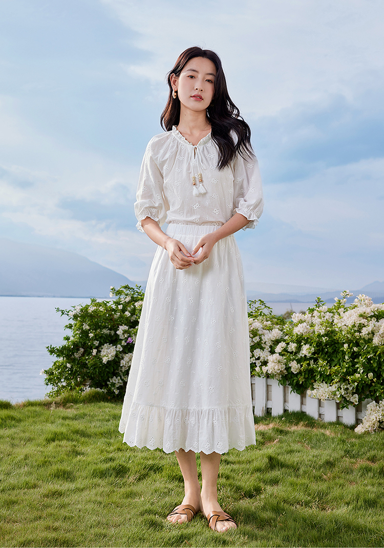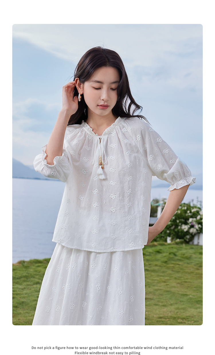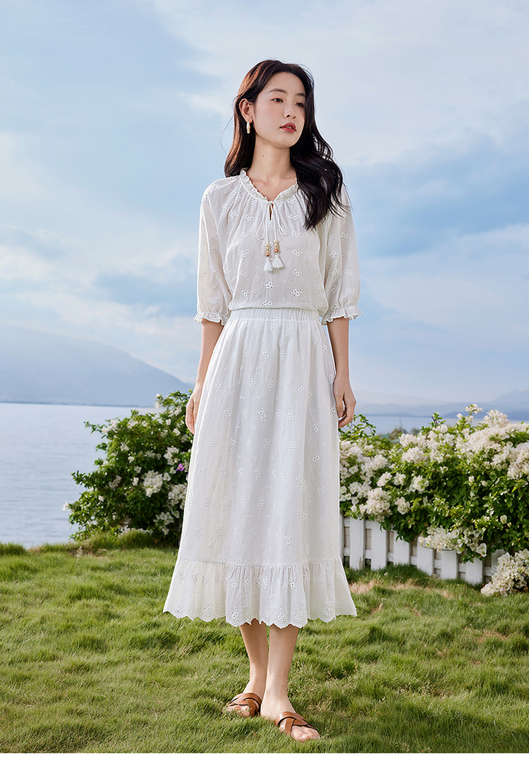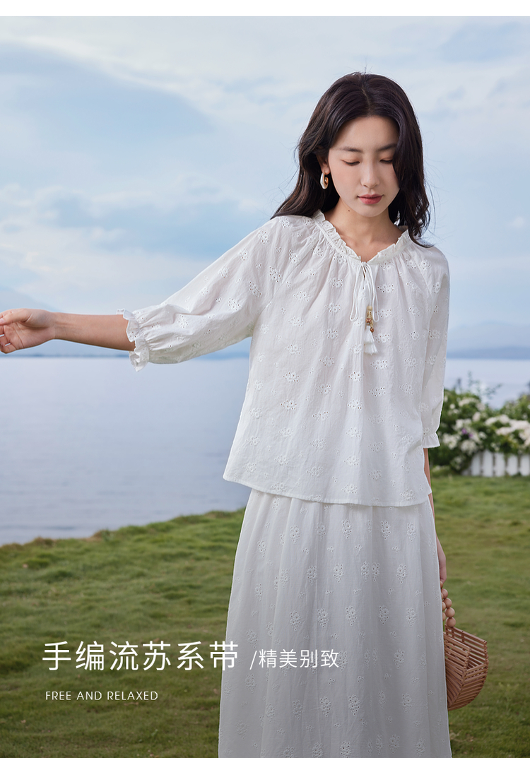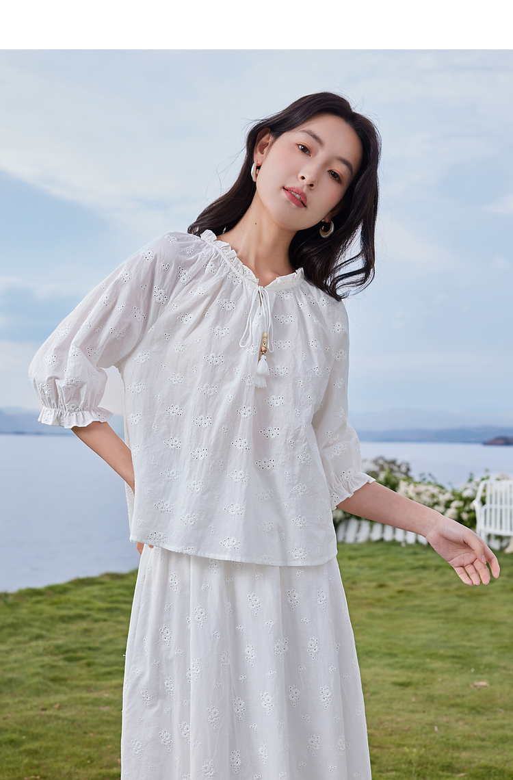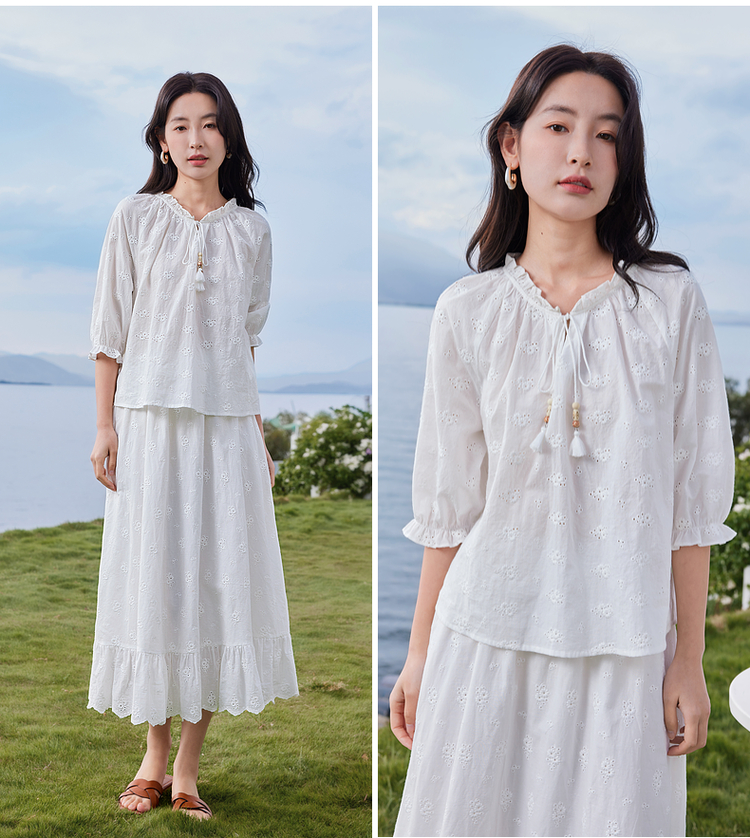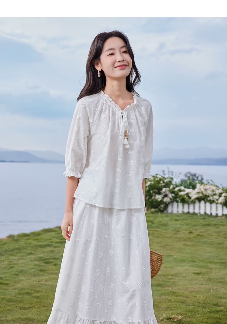 【专属特价】熙世界夏季套装2025新款法式木耳边绣花白色衬衫半身裙子两件套