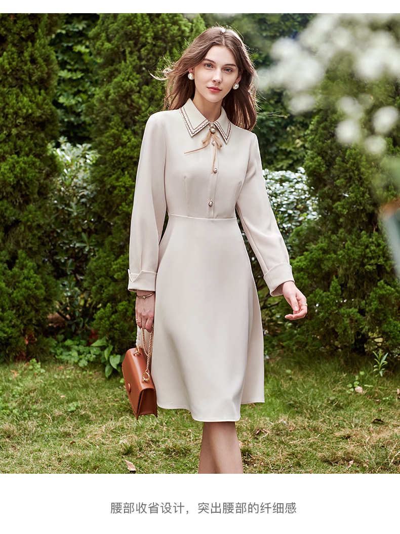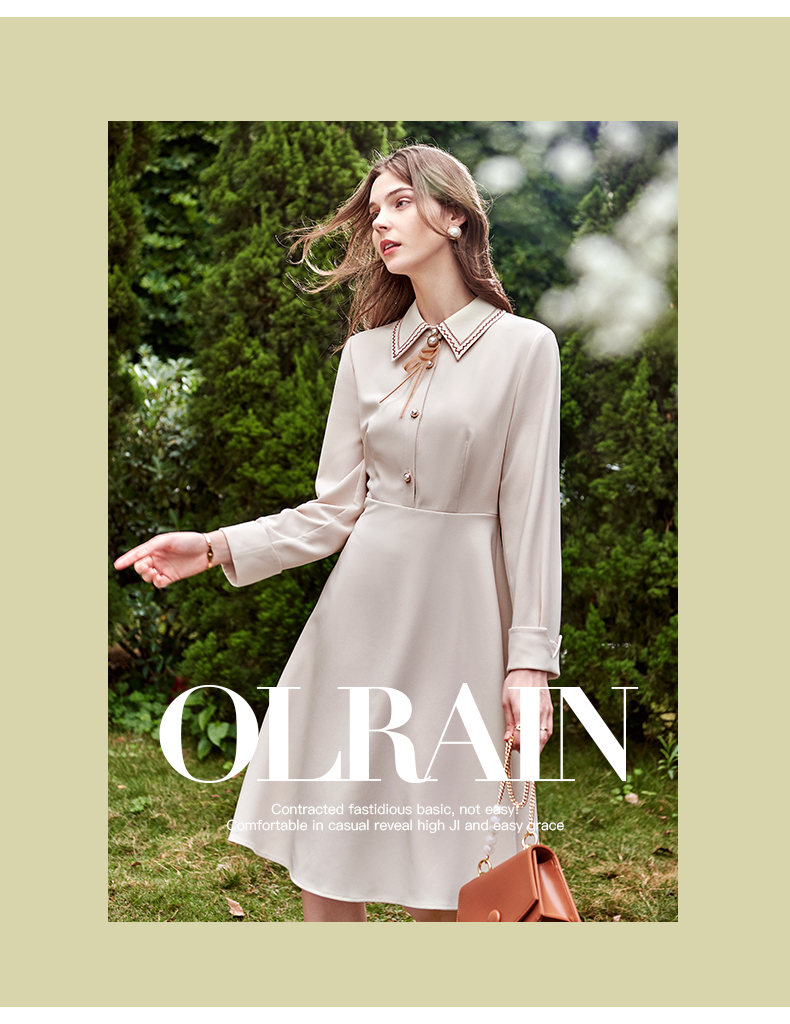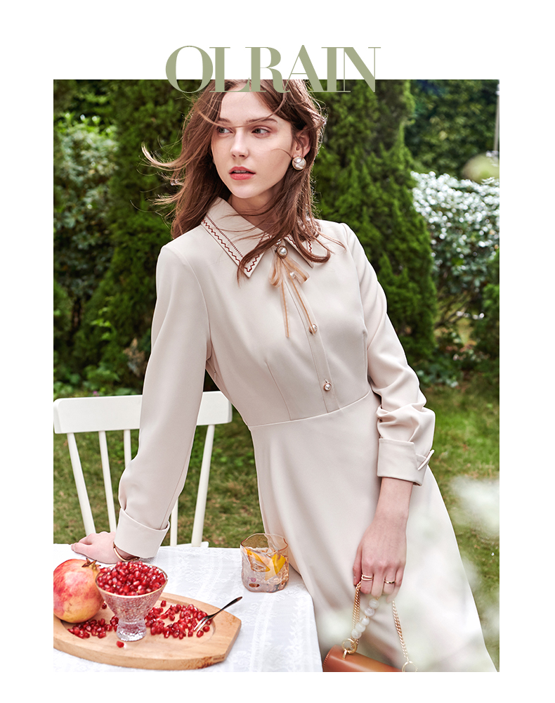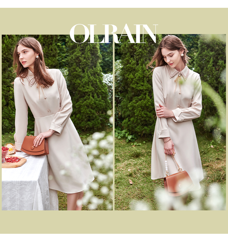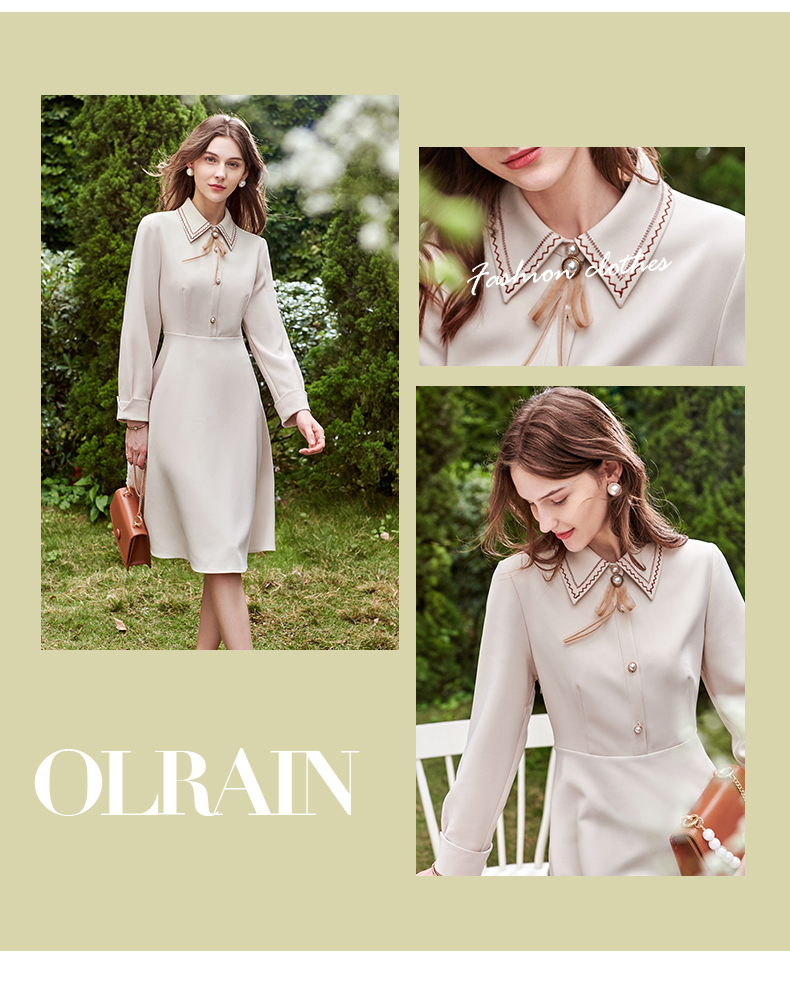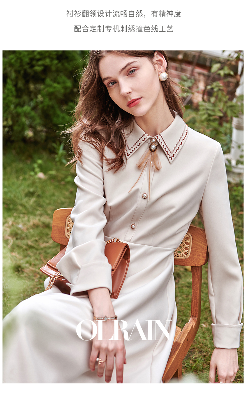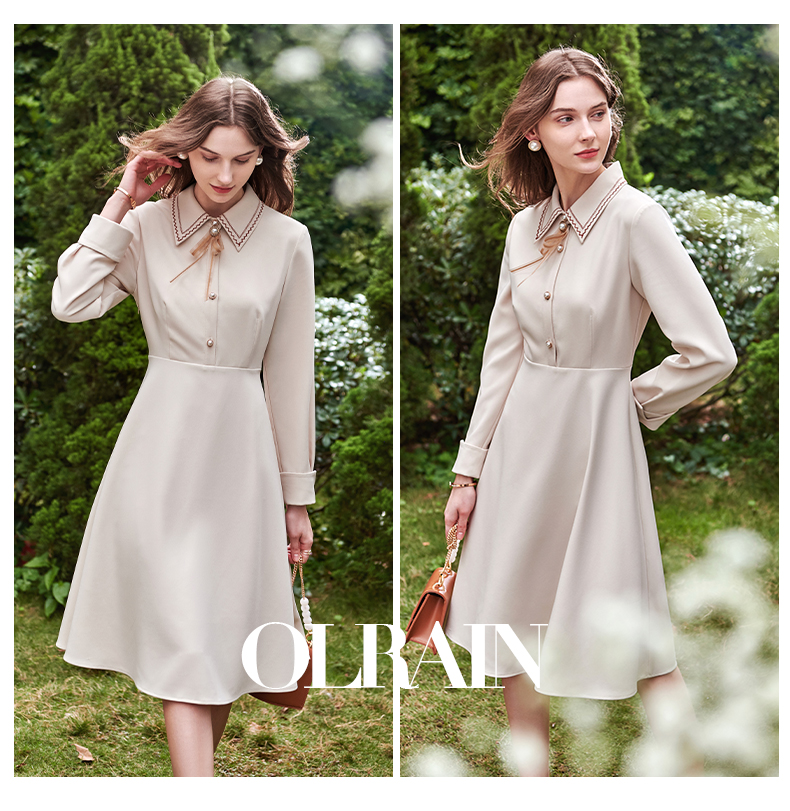 欧芮儿衬衫领连衣裙女春季新款收腰显瘦复古优雅简约休闲A字摆裙