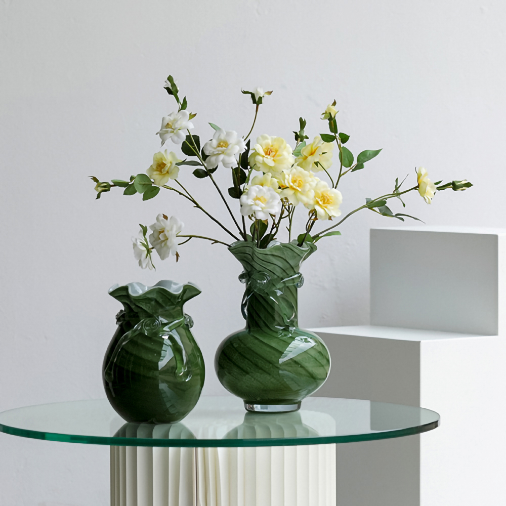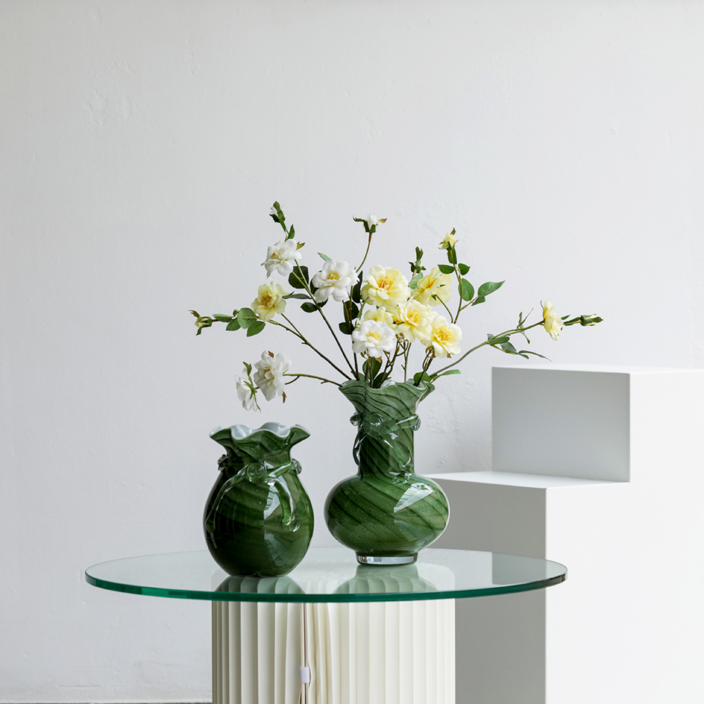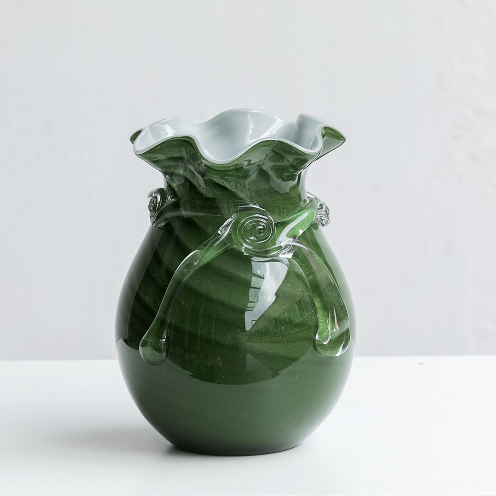 磁粉墨绿钱袋蝴蝶结玻璃花瓶摆件饰品餐桌器皿花边口卷边花器