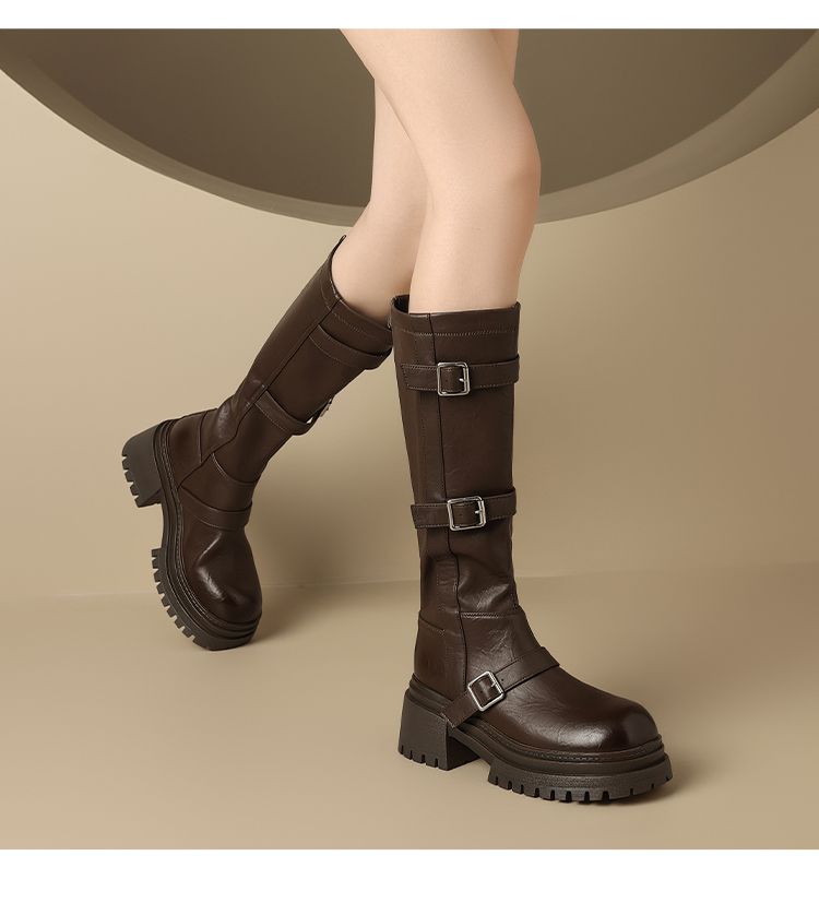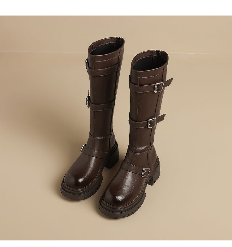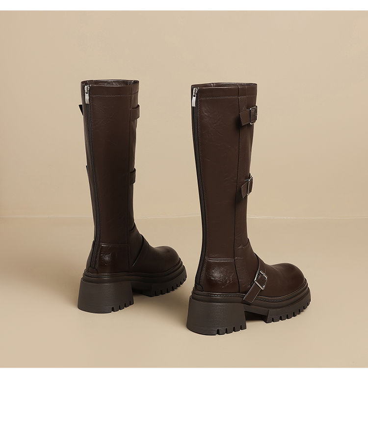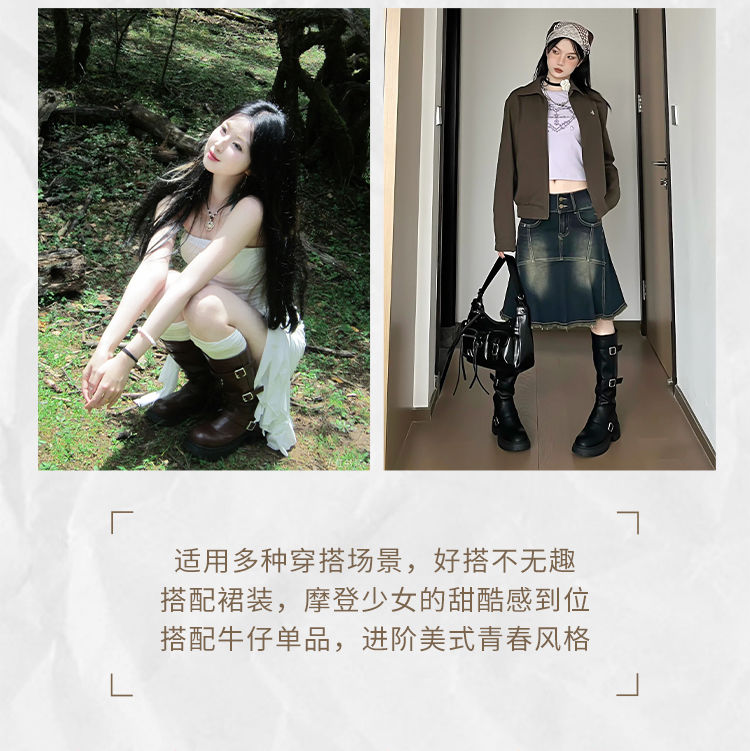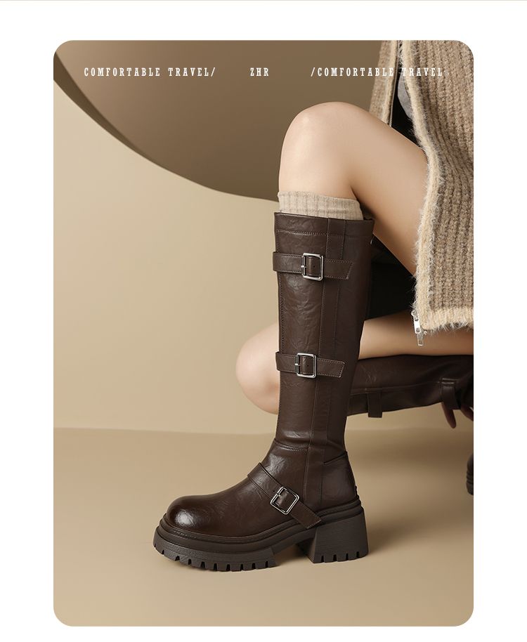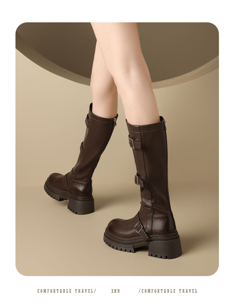 ZHR多排扣潮流长筒靴女2024秋冬新款复古骑士靴厚底西棕色牛仔靴