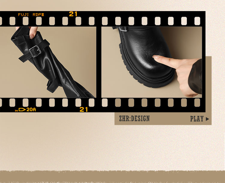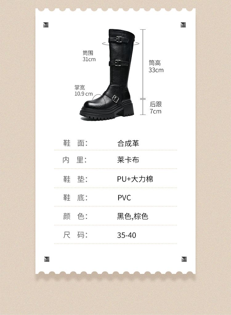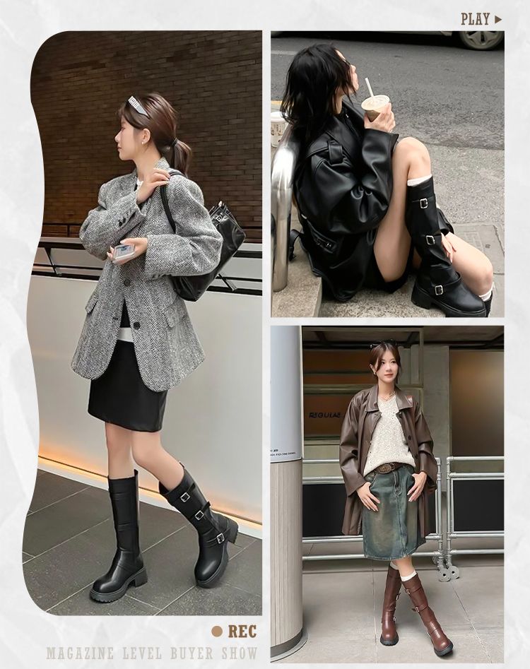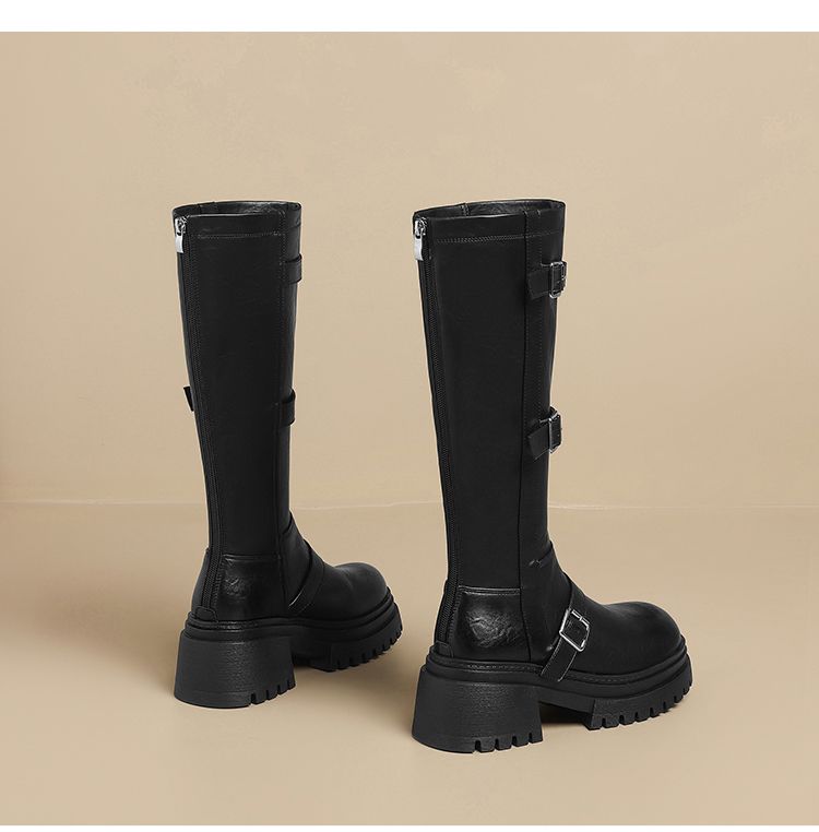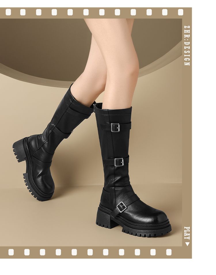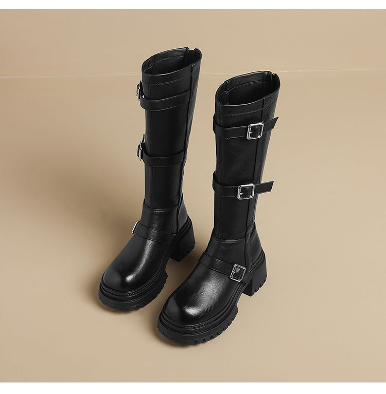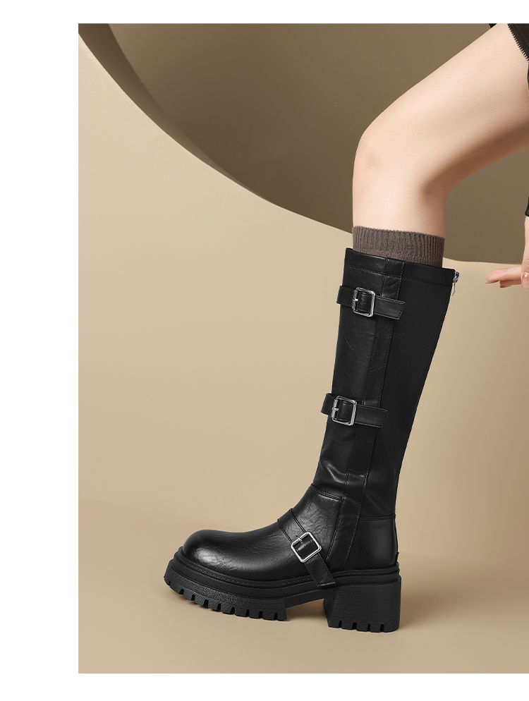 ZHR多排扣潮流长筒靴女2024秋冬新款复古骑士靴厚底西棕色牛仔靴