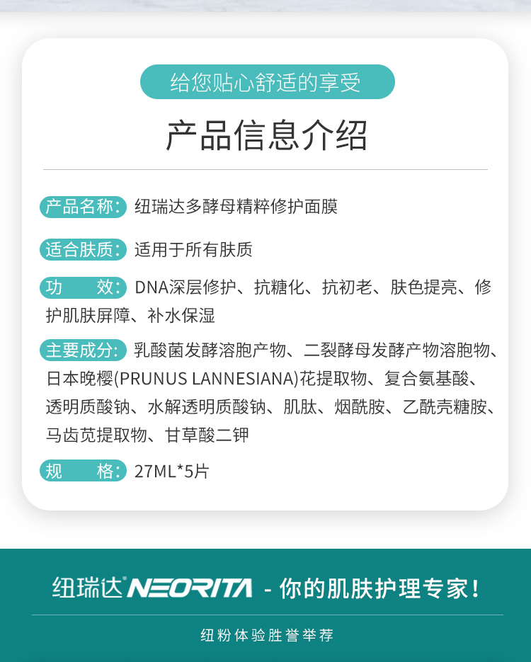 【纽瑞达】纽瑞达多酵母精粹修护面膜抗糖抗初老清洁锁水亮肤保湿面膜补水女